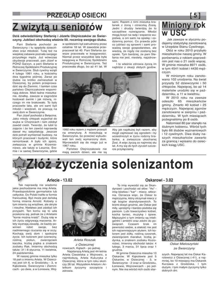 PRZEGLĄD OSIECKI Z wizytą u seniorów Dziś odwiedziliśmy Stefanię i Józefa Olejniczaków ze Świerczyny. Jubilaci obchodzą właśnie 50. rocznicę swojego ślubu. Pani Stefania pochodzi ze Świerczyny i tu spędziła dzieciństwo oraz młodość. Tutaj też na wiejskiej zabawie poznała swojego przyszłego męża. Już wówczas obydwoje pracowali, pan Józef w POHZ Garzyn, a pani Stefania w Rolniczej Spółdzielni Produkcyjnej w Świerczynie. Ślub cywilny wzięli 4 lutego 1961 roku, a kościelny dwa tygodnie później. Zaraz po ślubie na krótko zamieszkali w Osiecznej, by potem przeprowadzić się do Ziemnic. I tamten czas państwo Olejniczakowie wspominają dobrze. Mieli ładne mieszkanie, działkę, zawsze w zagrodzie hodowali świnki i jak mówią, niczego im nie brakowało. To były pracowite lata, ale oni sami byli młodzi i wiedzieli, że pracują na swój dom w Świerczynie. Pan Józef pochodzi z Belęcina. Jako młody chłopak wyjechał do wujka w Chojnicach i tam zdobył zawód cieśli. Twierdzi, że lubił to zajęcie i że ten zawód naprawdę dawał mu satysfakcję. Jeszcze dziś potrafi wymieniać budowy, na których pracował i budynki, które remontował. A było ich sporo, zwłaszcza w gminie Krzemieniewo, ale także w Lesznie, Śremie i w samej Świerczynie, gdzie w spółdzielni był zatrudniony przez ostatnie 18 lat. W zawodzie przepracował lat 40. Pani Stefania zawsze pracowała w księgowości. Niemal przez wszystkie lata była księgową w Rolniczej Spółdzielni Produkcyjnej w Świerczynie. Też pracowała długo, bo aż 41 lat. W 1992 roku razem z mężem przeszli na emeryturę. A mieszkają w Świerczynie, bo przecież wybudowali ten swój wymarzony dom. Wprowadzili się do niego już w 1967 roku. Państwo Olejniczakowie nie mają swoich dzieci, ale nie są sami. Razem z nimi mieszka bratanek z żoną i córeczką Zosią. Jedni i drudzy twierdzą że to szczęśliwe rozwiązanie. Młodzi mogą liczyć na radę i wsparcie wujostwa, a oni sami na opiekę i codzienną pomoc. Co prawda póki co jubilaci są sprawni i sami prowadzą swoje gospodarstwo, ale wiedzą, że nigdy nie zostaną bez opieki. Tym bardziej, że pani Stefania nie jest, niestety, najzdrowsza. I to właśnie zdrowia życzą im najbliżsi z okazji złotych godów. Aby jak najdłużej byli razem, aby mogli zajmować się ogrodem i by uczestniczyli w życiu rodziny bratanka, a zwłaszcza ukochanej Zosi. A więc życzą co najmniej stu lat. A my się do tych życzeń szczerze przyłączamy. [5] Miniony rok w USC Jak zawsze w styczniu podajemy statystykę zanotowaną w Urzędzie Stanu Cywilnego. Otóż w roku 2010 przybyło mieszkańców naszej gminy. W porównaniu z rokiem poprzednim jest nas o 21 osób więcej. W gminie mieszka 8971 osób, w tym 4541 kobiet i 4430 mężczyzn. W minionym roku zanotowano 102 urodzenia. Na świat przyszły 52 dziewczynki i 50 chłopców. Najwięcej, bo aż 14 maleństw urodziło się w październiku, a 11 w kwietniu. W 2010 roku na zawsze odeszło 65 mieszkańców gminy. Zmarło 40 kobiet i 25 mężczyzn. Najwięcej zgonów zanotowano w sierpniu i październiku. W tych miesiącach pożegnaliśmy po 8 osób. Natomiast 80 par stanęło na ślubnym kobiercu. Wśród tych było 66 ślubów wyznaniowych i 12 cywilnych. Dwa śluby naszych mieszkańców zawarto za granicą i wpisano do osieckich ksiąg USC. ZłóŜ Ŝyczenia solenizantom Oskarowi - 3.02 Arlecie - 13.02 Tak naprawdę nie wiadomo jakie pochodzenie ma imię Arleta. Prawdopodobnie germańskie lub celtyckie. Do Polski trafiło w formie francuskiej. Być może jest żeńską formą imienia Arnold. Kobiety o tym imieniu są wrażliwe, ale skryte i nieufne. Niełatwo jest zdobyć ich przyjaźń. Ten komu się to uda przekona się, jednak że z Arletami "konie można kraść". Dużą rolę w ich życiu odgrywają marzenia. Arlety wyznają zasadę, że każdy powinien robić swoje, bez nadmiernego rzucania się w oczy. Kochają swój dom i spokojne życie. Ich kolorem jest czerwony, rośliną piołun, zwierzęciem kaczka, liczbą piątka a znakiem zodiaku Rak. Imieniny obchodzą także: 31 i 8 stycznia, 11 kwietnia, 24 października. W naszej gminie mieszka tylko 18 pań o imieniu Arleta. W Osiecznej jest ich 6, w Grodzisku - 3, w Kąkolewie, Świerczynie i Ziemnicach - po dwie, a w Łoniewie, Woj- Arleta Roszak z Osiecznej nowicach, Kątach - po jednej. Najstarszą Arletą jest 44-letnia Arleta Ciesielska z Wojnowic, a najmłodszą, Arleta Kukuryka z Osiecznej, która w tym roku skończy 26 lat. Wszystkim Arletom i Arletkom życzymy szczęścia i zdrowia. To imię wywodzi się ze Skandynawii i pochodzi od słów: "As" imię bóstwa i "kar" - miecz, włócznia. Oznacza więc, że Oskar to mężczyzna, który otrzymał miecz z rąk bogów skandynawskich. To brzmi dosyć groźnie, ale Oskar jest miły, uprzejmy i bardzo podoba się paniom. Lubi towarzystwo kobiet, kocha taniec, muzykę i śpiew. Mężczyźni o tym imieniu są inteligentni i ambitni oraz zdolni do poświęceń. Czasem brak im pewności siebie, a stałość nie jest ich najcenniejszym atutem. Ich kolorem jest żółty, rośliną czosnek, zwierzęciem marabut, liczbą jedynka, a znakiem zodiaku Koziorożec. Imieniny obchodzi także: 4 lutego, 3 marca, 31 lipca oraz 1 grudnia. W gminie Osieczna mieszka 13 Oskarów. W Kąkolewie jest 5 Oskarów, w Osiecznej - 3, w Świerczynie - 2 oraz w Grodzisku, Łoniewie, Wojnowicach - po jednym. Nie ma wśród nich osób star- Oskar Mieloszyński ze Świerczyny szych. Najwięcej lat ma Oskar Karolewicz z Osiecznej (-41), a najmniej, bo 10 miesięcy ma Oskarek Kurzawa z Grodziska. I tym dużym, i tym małym życzymy tylko dobrych dni.