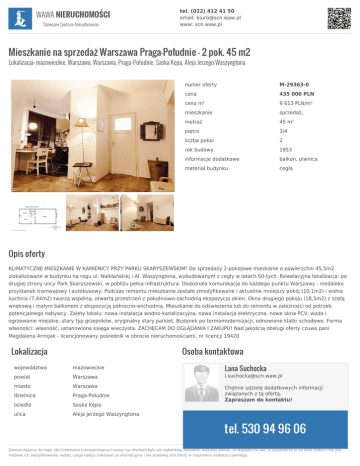 tel. (022) 412 41 50 email: [email protected] www: scn.waw.pl Mieszkanie na sprzedaż Warszawa Praga-Południe - 2 pok. 45 m2 Lokalizacja: mazowieckie, Warszawa, Warszawa, Praga-Południe, Saska Kępa, Aleja Jerzego Waszyngtona numer oferty M-29363-0 cena 435 000 PLN cena m 9 613 PLN/m2 mieszkanie sprzedaż, metraż 45 m2 piętro 3/4 liczba pokoi 2 rok budowy 1953 informacje dodatkowe balkon, piwnica materiał budynku cegła 2 Opis oferty KLIMATYCZNE MIESZKANIE W KAMIENICY PRZY PARKU SKARYSZEWSKIM! Do sprzedaży 2-pokojowe miezkanie o powierzchni 45,5m2 zlokalizowane w budynku na rogu ul. Niekłańskiej i Al. Waszyngtona, wybudowanym z cegły w latach 50-tych. Rewelacyjna lokalizacja: po drugiej strony ulicy Park Skaryszewski, w pobliżu pełna infrastruktura. Doskonała komunikacja do każdego punktu Warszawy - niedaleko przystanek tramwajowy i autobusowy, Podczas remontu mieszkanie zostało zmodyfikowane i aktualnie mniejszy pokój (10,1m2) i widna kuchnia (7,44m2) tworzą wspólną, otwartą przestrzeń z południowo-zachodnią ekspozycją okien. Okna drugiego pokoju (18,5m2) z szafą wnękową i małym balkonem z ekspozycją północno-wschodnią. Mieszkanie do odświeżenia lub do remontu w zależności od potrzeb potencjalnego nabywcy. Zalety lokalu: nowa instalacja wodno-kanalizacyjna, nowa instalacja elektryczna, nowe okna PCV, woda i ogrzewanie miejskie, stary typ grzejników, oryginalny stary parkiet. Budynek po termomodernizacji, odnowione klatki schodowe. Forma własności: własność, ustanowiona księga wieczysta. ZACHĘCAM DO OGLĄDANIA I ZAKUPU! Nad jakością obsługi oferty czuwa pani Magdalena Armijak - licencjonowany pośrednik w obrocie nieruchomościami, nr licencji 19420 Lokalizacja Osoba kontaktowa Lana Suchocka województwo mazowieckie powiat Warszawa [email protected] miasto Warszawa dzielnica Praga-Południe osiedle Saska Kępa Chętnie udzielę dodatkowych informacji związanych z tą ofertą. Zapraszam do kontaktu! ulica Aleja Jerzego Waszyngtona tel. 530 94 96 06 Zawsze dążymy do tego, aby informacje o proponowanych przez nas ofertach były jak najbardziej dokładne. Niekiedy jednak, ze względu na fakt, iż uzyskujemy je od osób trzecich nie jest możliwe ich zweryfikowanie, wobec czego należy traktować je orientacyjnie i nie stanowią one oferty w rozumieniu kodeksu cywilnego.