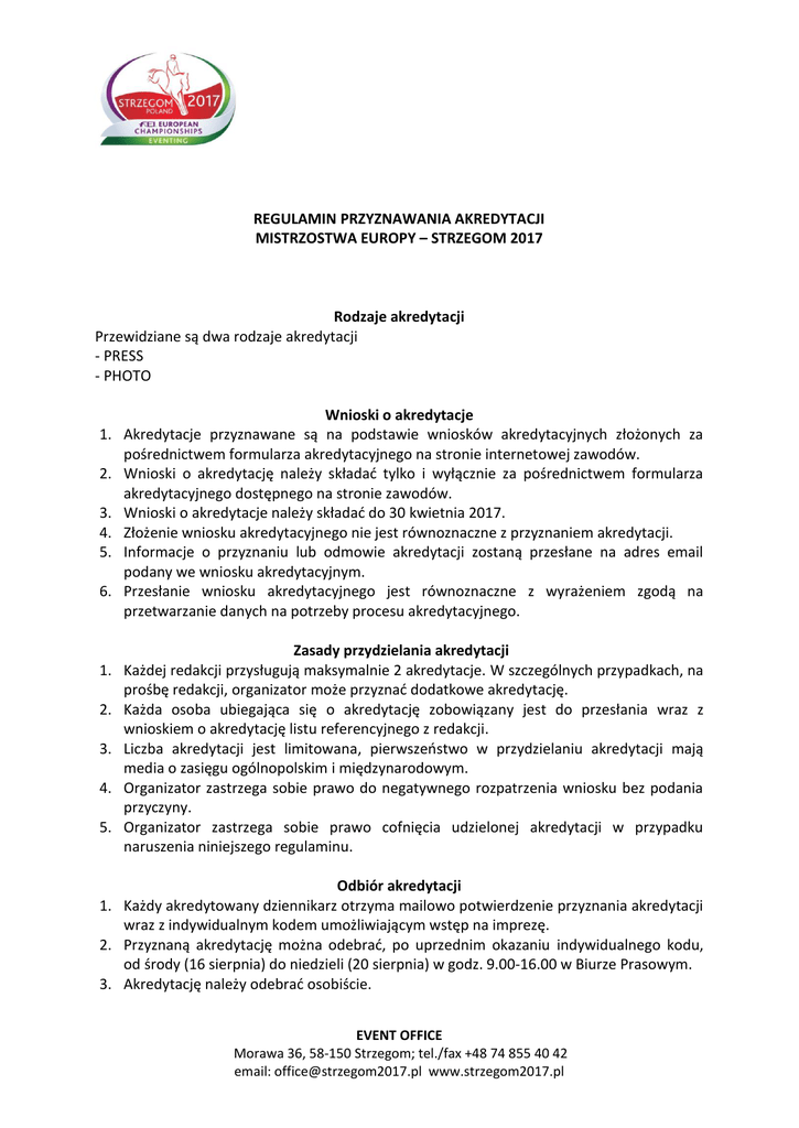 REGULAMIN PRZYZNAWANIA AKREDYTACJI MISTRZOSTWA EUROPY – STRZEGOM 2017 Rodzaje akredytacji Przewidziane są dwa rodzaje akredytacji - PRESS - PHOTO 1. 2. 3. 4. 5. 6. 1. 2. 3. 4. 5. Wnioski o akredytacje Akredytacje przyznawane są na podstawie wniosków akredytacyjnych złożonych za pośrednictwem formularza akredytacyjnego na stronie internetowej zawodów. Wnioski o akredytację należy składać tylko i wyłącznie za pośrednictwem formularza akredytacyjnego dostępnego na stronie zawodów. Wnioski o akredytacje należy składać do 30 kwietnia 2017. Złożenie wniosku akredytacyjnego nie jest równoznaczne z przyznaniem akredytacji. Informacje o przyznaniu lub odmowie akredytacji zostaną przesłane na adres email podany we wniosku akredytacyjnym. Przesłanie wniosku akredytacyjnego jest równoznaczne z wyrażeniem zgodą na przetwarzanie danych na potrzeby procesu akredytacyjnego. Zasady przydzielania akredytacji Każdej redakcji przysługują maksymalnie 2 akredytacje. W szczególnych przypadkach, na prośbę redakcji, organizator może przyznać dodatkowe akredytację. Każda osoba ubiegająca się o akredytację zobowiązany jest do przesłania wraz z wnioskiem o akredytację listu referencyjnego z redakcji. Liczba akredytacji jest limitowana, pierwszeństwo w przydzielaniu akredytacji mają media o zasięgu ogólnopolskim i międzynarodowym. Organizator zastrzega sobie prawo do negatywnego rozpatrzenia wniosku bez podania przyczyny. Organizator zastrzega sobie prawo cofnięcia udzielonej akredytacji w przypadku naruszenia niniejszego regulaminu. Odbiór akredytacji 1. Każdy akredytowany dziennikarz otrzyma mailowo potwierdzenie przyznania akredytacji wraz z indywidualnym kodem umożliwiającym wstęp na imprezę. 2. Przyznaną akredytację można odebrać, po uprzednim okazaniu indywidualnego kodu, od środy (16 sierpnia) do niedzieli (20 sierpnia) w godz. 9.00-16.00 w Biurze Prasowym. 3. Akredytację należy odebrać osobiście. EVENT OFFICE Morawa 36, 58-150 Strzegom; tel./fax +48 74 855 40 42 email: [email protected] www.strzegom2017.pl Uprawnienia w ramach akredytacji 1. Bezpłatny wstęp na teren zawodów. 2. Bezpłatny parking. 3. Wstęp do sektora dla mediów. 4. Dostęp do Biura Prasowego oraz dostępnego w nim sprzętu biurowo-komputerowego i zaplecza cateringowego. 5. Możliwość udziału w konferencjach prasowych i specjalnych spotkaniach z zawodnikami, oficjelami oraz organizatorami. 6. Pomoc przy przygotowywaniu materiału (wywiady, zdjęcia). Sprawy organizacyjne 1. Wywiady i rozmowy z zawodnikami podczas konferencji lub po konferencji możliwe są tylko i włącznie na tle ścianki reklamowej zawodów. 2. Wywiady z zawodnikami, oficjelami i zaproszonymi gośćmi należy organizować tylko i wyłącznie za pośrednictwem Biura Prasowego. 3. Wywiadów do TV, radio i prasy w imieniu organizatora udziela tylko i wyłącznie dyrektor zawodów lub osoba przez niego upoważniona. 1. 2. 3. 4. 5. Fotoreporterzy Wszyscy Fotoreporterzy zobowiązani są do udziału w codziennych szkoleniach dotyczących zachowania podczas poszczególnych konkursów. Szkolenia organizuje Biuro Prasowe. Obecność na szkoleniach jest obowiązkowa. Akredytowani fotoreporterzy mogą przebywać na płycie areny głównej oraz na trasie crossu tylko i wyłącznie w miejscach wyznaczonych przez organizatora. Zobowiązani są posiadać specjalne kamizelki ochronne. Kamizelki ochronne wydaje za kaucją zwrotną przez Biuro Prasowe. Kamizelki są numerowane, każdy numer jest przypisany do nazwiska konkretnej osoby. Organizator zastrzega sobie prawo do ograniczenia liczby fotografów przebywających w miejscach wyznaczonych przez organizatora w trakcie konkursów oraz podczas dekoracji. Sprawy porządkowe 1. Na terenie Hipodromu w trakcie wykonywania zadań dziennikarskich i fotoreporteskich, akredytacja musi być umieszczona przez jej posiadacza w miejscu widocznym dla służb technicznych i porządkowych. 2. Dziennikarz/Fotoreporter jest zobowiązany okazywać akredytację na każde wezwanie służb ochrony i przedstawicieli organizatora. 3. Akredytowani Dziennikarze/Fotoreporterzy zobowiązani są do bezwzględnego stosowania się do poleceń obsługi sędziowskiej oraz służb porządkowych i technicznych. 4. Akredytowani Dziennikarze/Fotoreporterzy mogą przebywać w miejscach zarezerwowanych dla mediów oraz wyznaczonych dla publiczności, pod warunkiem, że EVENT OFFICE Morawa 36, 58-150 Strzegom; tel./fax +48 74 855 40 42 email: [email protected] www.strzegom2017.pl nie będą utrudniać widzom obserwacji zmagań na placu konkursowym ani zajmować miejsc dla nich opłaconych. 5. Przekazywanie akredytacji osobom trzecim jest zabronione. 6. Wszelkie zaistniałe w trakcie zawodów sytuacje konfliktowe dotyczące mediów należy zgłaszać w Biurze Prasowym zawodów. 7. WSZELKIE ZAPYTANIA NALEŻY KIEROWAĆ NA ADRES MAILOWY: [email protected] Oficjalna nazwa imprezy brzmi: FEI EUROPEAN EVENTING CHAMPIONSHIPS Prosimy o używanie pełnej nazwy imprezy w Państwa codziennej pracy z klawiaturą, kamerą lub przy mikrofonie. DO ZOBACZENIA NA FEI EUROPEAN EVENTING CHAMPIONSHIPS – STRZEGOM 2017!!! EVENT OFFICE Morawa 36, 58-150 Strzegom; tel./fax +48 74 855 40 42 email: [email protected] www.strzegom2017.pl