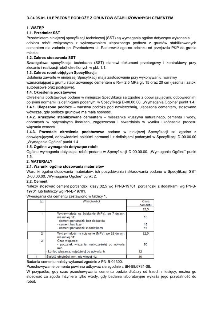 D-04.05.01. ULEPSZONE PODŁOŻE Z GRUNTÓW STABILIZOWANYCH CEMENTEM 1. WSTĘP 1.1. Przedmiot SST Przedmiotem niniejszej specyfikacji technicznej (SST) są wymagania ogólne dotyczące wykonania i odbioru robót związanych z wykonywaniem ulepszonego podłoża z gruntów stabilizowanych cementem dla zadania pn. Przebudowa ul. Paderewskiego na odcinku od przejazdu PKP do granic miasta. 1.2. Zakres stosowania SST Szczegółowa specyfikacja techniczna (SST) stanowi dokument przetargowy i kontraktowy przy zlecaniu i realizacji robót określonych w pkt. 1.1. 1.3. Zakres robót objętych Specyfikacja Ustalenia zawarte w niniejszej Specyfikacji maja zastosowanie przy wykonywaniu: warstwy wzmacniającej z gruntu stabilizowanego cementem o Rm= 2,5 MPa gr. 15 oraz 20 cm (jezdnia i zatoki autobusowe oraz postojowe). 1.4. Określenia podstawowe Określenia podstawowe podane w niniejszej Specyfikacji sa zgodne z obowiązującymi, odpowiednimi polskimi normami i z definicjami podanymi w Specyfikacji D-00.00.00. „Wymagania Ogólne” punkt 1.4. 1.4.1. Ulepszone podłoże – warstwa podłoża pod nawierzchnią, ulepszona cementem, stosowana wówczas, gdy podłoże gruntowe ma mała nośność. 1.4.2. Kruszywo stabilizowane cementem – mieszanka kruszywa naturalnego, cementu i wody, dobranych w optymalnych ilościach, zagęszczona i stwardniała w wyniku ukończenia procesu wiązania cementu. 1.4.3. Pozostałe określenia podstawowe podane w niniejszej Specyfikacji sa zgodne z obowiązującymi, odpowiednimi polskimi normami i z definicjami podanymi w Specyfikacji D-00.00.00 „Wymagania Ogólne” punkt 1.4. 1.5. Ogólne wymagania dotyczące robót Ogólne wymagania dotyczące robót podano w Specyfikacji D-00.00.00. „Wymagania Ogólne” punkt 1.5. 2. MATERIAŁY 2.1. Warunki ogólne stosowania materiałów Warunki ogólne stosowania materiałów, ich pozyskiwania i składowania podano w Specyfikacji SST D-00.00.00. „Wymagania Ogólne” punkt 2. 2.2. Cement Należy stosować cement portlandzki klasy 32,5 wg PN-B-19701, portlandzki z dodatkami wg PN-B19701 lub hutniczy wg PN-B-19701. Wymagania dla cementu zestawiono w tablicy 1. Badania cementu należy wykonać zgodnie z PN-B-04300. Przechowywanie cementu powinno odbywać sie zgodnie z BN-88/6731-08. W przypadku, gdy czas przechowywania cementu będzie dłuższy od trzech miesięcy, można go stosować za zgoda Inżyniera tylko wtedy, gdy badania laboratoryjne wykażą jego przydatność do robót. 2.3. Kruszywa Do stabilizacji gruntu cementem można stosować piaski, mieszanki i żwiry albo mieszankę tych kruszyw, spełniające wymagania podane w tablicy 2. Kruszywo można uznać za przydatne do stabilizacji cementem wtedy, gdy wyniki badań laboratoryjnych wykażą, że wytrzymałość na ściskanie i mrozoodporność próbek kruszywa stabilizowanego będą zgodne z wymaganiami określonymi w p. 2.5. tablica 3. Jeżeli kruszywo przeznaczone do wykonania warstwy nie jest wbudowane bezpośrednio po dostarczeniu na budowę i zachodzi potrzeba jego okresowego składowania na terenie budowy, to powinno być ono składowane w pryzmach, na utwardzonym i dobrze odwodnionym placu, w warunkach zabezpieczających przed zanieczyszczeniem i przed wymieszaniem różnych rodzajów kruszyw. 2.3.1. Źródła kruszyw Wszystkie kruszywa użyte do stabilizacji cementem powinny pochodzić tylko ze źródeł uzgodnionych i zatwierdzonych przez Inżyniera. Kruszywa, które nie spełnia wymagań określonych w punkcie 2.2.1. niniejszej Specyfikacji, zostaną odrzucone. 2.3.2. Składowanie kruszyw Jeżeli kruszywo nie jest używane bezpośrednio w miejscu wydobycia, lecz przechowywane na placu budowy to powinno ono być składowane w pryzmach, na utwardzonym i dobrze odwodnionym placu, w warunkach zabezpieczających przed zanieczyszczeniem i przed wymieszaniem różnych rodzajów kruszyw. 2.4. Woda Woda stosowana do stabilizacji kruszywa cementem i ewentualnie do pielęgnacji wykonanej warstwy powinna odpowiadać wymaganiom PN-B-32250 [13]. Bez badan laboratoryjnych można stosować wodociągową wodę pitną. Gdy woda pochodzi z wątpliwych źródeł nie może być użyta do momentu jej przebadania, zgodnie z wyżej podana norma lub do momentu porównania wyników wytrzymałości na ściskanie próbek gruntowo-cementowych wykonanych z woda wątpliwa i z woda wodociągowa. Brak różnic potwierdza przydatność wody do stabilizacji kruszywa cementem. 2.5. Kruszywo stabilizowane cementem 2.5.1. Wymagania dla stabilizacji kruszywa cementem Kruszywo stabilizowane cementem powinno spełniać wymagania określone w tablicy 3. Tablica 3. Wymagania dla kruszyw stabilizowanych cementem dla warstwy wzmacniającej podłoże 2.6.2. Skład kruszywa stabilizowanego cementem Skład i uziarnienie kruszywa lub mieszanki kruszyw powinny być zgodne z punktem 2.3. Skład kruszywa stabilizowanego cementem powinien być tak dobrany, aby zapewniał osiągnięcie właściwości określonych w tablicy 3. Zaleca sie taki dobór mieszanki, aby spełnić wymagania wytrzymałościowe przy minimalnej zawartości cementu i wody. Zawartość cementu w mieszance kruszywa stabilizowanego cementem nie może przekraczać wartości 6 % w stosunku do masy suchego kruszywa. Zawartość wody powinna odpowiadać wilgotności optymalnej, określonej według normalnej próby Proctora, zgodnie z PN-B-04481 (duży cylinder, metoda II), z tolerancja +10%, -20% jej wartości. 2.7. Materiały do pielęgnacji Do pielęgnacji mogą być stosowane: - emulsja asfaltowa wg EmA-94, - asfalt D200 i D300 wg PN-C-96170, - preparaty powłokowe wg aprobat technicznych, - folie z tworzyw sztucznych, - włóknina wg. PN-P-01715. 3. SPRZĘT 3.1. Ogólne wymagania dotyczace sprzetu Ogólne wymagania dotyczące sprzętu podano w ST D-00.00.00 „Wymagania ogólne” pkt 3. 3.2. Sprzęt do wykonania robót Wykonawca przystępujący do wykonania podbudowy stabilizowanego spoiwami powinien wykazać sie możliwością korzystania z 