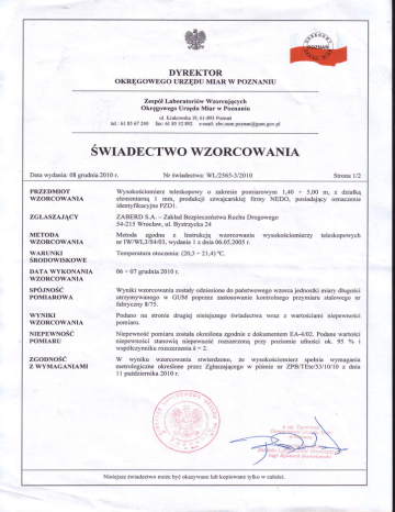 DYREKTOR OKR4GOWEGOI]RZQDUMIAR W POZNAI\ru Ze!p6l Laboratori6wWzorcujCcych Okqgo$ego UrzeduMiar rr Poznaniu 01.Krakowska 19,61-893 Poznai relt 6t 8567240 fa:61 8552892 email:[email protected] SWIADECTWO WZORCOWANIA Datawydania:08grudnia20l0r. Nr Swiadectwa: WL/2565-3/2010 Stronal/2 PRZEDMIOT WZORCOWANIA Wysokodciomierz teleskopowyo zakresiepomiarowym 1,40 + 5,00 m, z dzialkq elementamAI mm, produkcj i szwajcarskiejfi|m) NtDO. posiadaj4cyoznacTenie idenryfikacyjnePZDL ZGLASZAJACY ZABERD S.A. - ZaktadBezpieczeistwaRuchuDrogowego 54-2I 5 Wroctaw,ul. Bystrrycka 24 METODA WZORCOWANIA Metoda zgodna z Instrukcjq wzorcowania wysokosciomierzy t€leskopowych ff IWWL3/S4/03,wydanie1 z dnia06.05.2005 r. WARUNKI SRODOWISKOWE (20,3+ 21,4)"c. Temperatura otoczenia: DATA WYKONANIA WZORCOWANIA 06 - 0? grudnia20l0r. SPOJNOSC POMIAROWA Wyniki wzorcowania zostalyodniesione do paistwowegowzorcajednostki miarydtugosci utrzymywanego w CUM poprzez zastoso\{aniekontrolnego przymiaru stalowego nr fabryczny8/75. WYNIKI WZORCOWANIA Podanona stronie drugiej niniejszegoSwiadectwawraz z wartoiciami niepewnosci pomiaru. NIEPEWNOSC POMIARU pomiaruzostalaokeSlonazgodni€z dokumentem Niepewnosd EA-4l02.Podanewartosci przy poziomie ufno(ci ok. 95 % i niepewnoscistanowi4niepewno6drozszerzonA wsp6lczynnikurozszerzenia, = 2. zcoDNosc W wyniku wzorcowania stwier&ono, ze wysokoSciomierzspelnia wymagania metrologiczneokeslone przez ZglasmjEceAo w pismie ZPBlTEtelS3/1'/1o z dnia 1l pazdziemika 20l0 r. Z WYMACANIAMI mozebyc oka4"ane lub Loprowane NiniejszeSw,adedwo r)lko $ (alosci wzoRcowANrA SwrADEcrwo wydaneprzez Zesp6lLaboratori6wWzorcuj4cychOkregowegoUrzeduMiar Datawydania: 08grudnia 2010r. Nr Swiadectwa: WL/2565-3l201 0 Strona2/2 WYNIKI wzoRcowANtA DtugoSd Blqddlugosci Bl4ddlugoici podzialki odcinka podzialki odcinka podzialki bladudlugo3ci podzialki Imml 3 1400 -0,3 -0,7 2000 -0,1 -0,8 3000 +0,1 +0,1 0,5 4000 +1,0 0,0 0,5 0,5 5000 podwplywemnaciskuz sil45 N wywartego UgiQcie ramieniagranicznego najegokonie€nie przekaczawartosci40 mm. Odchylenieod plaskoscidolnej powierzchniramieniagraniczn€go:0,05mn. Ni€pewnosiwyaaczeniaodchylenia od plasko$idolnejpowierzchni ramieniagranicznegot 0,05mm. \iTsokosciomierza K4t pomi€dzyosiqwzdluZnq a dolnqpowierzchniq ramieniagranicznego: 90' 03'. Niepewnosiqyznaczania k4tapomiedryosi4wzdluzn4wysokosciomieza a doln4powierzchniq ranieniagranicaego:5'. Sprawdzil(a):