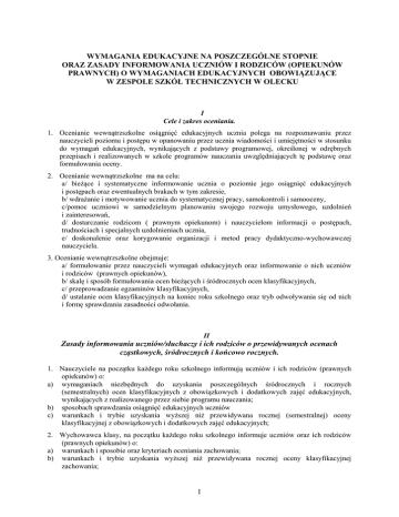 WYMAGANIA EDUKACYJNE NA POSZCZEGÓLNE STOPNIE ORAZ ZASADY INFORMOWANIA UCZNIÓW I RODZICÓW (OPIEKUNÓW PRAWNYCH) O WYMAGANIACH EDUKACYJNYCH OBOWIĄZUJĄCE W ZESPOLE SZKÓŁ TECHNICZNYCH W OLECKU I Cele i zakres oceniania. 1. Ocenianie wewnątrzszkolne osiągnięć edukacyjnych ucznia polega na rozpoznawaniu przez nauczycieli poziomu i postępu w opanowaniu przez ucznia wiadomości i umiejętności w stosunku do wymagań edukacyjnych, wynikających z podstawy programowej, określonej w odrębnych przepisach i realizowanych w szkole programów nauczania uwzględniających tę podstawę oraz formułowania oceny. 2. Ocenianie wewnątrzszkolne ma na celu: a/ bieżące i systematyczne informowanie ucznia o poziomie jego osiągnięć edukacyjnych i postępach oraz ewentualnych brakach w tym zakresie, b/ wdrażanie i motywowanie ucznia do systematycznej pracy, samokontroli i samooceny, c/pomoc uczniowi w samodzielnym planowaniu swojego rozwoju umysłowego, uzdolnień i zainteresowań, d/ dostarczanie rodzicom ( prawnym opiekunom) i nauczycielom informacji o postępach, trudnościach i specjalnych uzdolnieniach ucznia, e/ doskonalenie oraz korygowanie organizacji i metod pracy dydaktyczno-wychowawczej nauczyciela. 3. Ocenianie wewnątrzszkolne obejmuje: a/ formułowanie przez nauczycieli wymagań edukacyjnych oraz informowanie o nich uczniów i rodziców (prawnych opiekunów), b/ skalę i sposób formułowania ocen bieżących i śródrocznych ocen klasyfikacyjnych, c/ przeprowadzanie egzaminów klasyfikacyjnych, d/ ustalanie ocen klasyfikacyjnych na koniec roku szkolnego oraz tryb odwoływania się od nich i formę sprawdzania zasadności odwołania. II Zasady informowania uczniów/słuchaczy i ich rodziców o przewidywanych ocenach cząstkowych, śródrocznych i końcowo rocznych. 1. Nauczyciele na początku każdego roku szkolnego informują uczniów i ich rodziców (prawnych opiekunów) o: a) wymaganiach niezbędnych do uzyskania poszczególnych śródrocznych i rocznych (semestralnych) ocen klasyfikacyjnych z obowiązkowych i dodatkowych zajęć edukacyjnych, wynikających z realizowanego przez siebie programu nauczania; b) sposobach sprawdzania osiągnięć edukacyjnych uczniów c) warunkach i trybie uzyskania wyższej niż przewidywana rocznej (semestralnej) oceny klasyfikacyjnej z obowiązkowych i dodatkowych zajęć edukacyjnych; 2. Wychowawca klasy, na początku każdego roku szkolnego informuje uczniów oraz ich rodziców (prawnych opiekunów) o: a) warunkach i sposobie oraz kryteriach oceniania zachowania; b) warunkach i trybie uzyskania wyższej niż przewidywana rocznej oceny klasyfikacyjnej zachowania; 1 3. O postępach ucznia w nauce jego rodzice (prawni opiekunowie) są informowani na wywiadówkach organizowanych przez wychowawcę klasowego przynajmniej 3 razy w ciągu roku szkolnego oraz na indywidualnych konsultacjach z nauczycielem lub wychowawcą. 4. W szczególnych przypadkach rodzice ( prawni opiekunowie) mogą być zapraszani pisemnie bądź telefonicznie do szkoły poprzez wychowawcę, pedagoga szkolnego lub dyrekcję szkoły. 5. O przewidywanej ocenie niedostatecznej uczeń i jego rodzice ( prawni opiekunowie) powinni być poinformowani przez nauczyciela bądź wychowawcę klasy w formie ustnej co najmniej na 14 dni przed wyznaczonym terminem posiedzenia końcoworocznego rady pedagogicznej. 6. Na prośbę ucznia lub jego rodziców ( prawnych opiekunów) nauczyciel o przewidywanej ocenie niedostatecznej informuje w formie pisemnej poprzez wpis do dzienniczka ucznia. 7. W przypadku nieobecności ucznia na zajęciach lekcyjnych, w czasie których informowano o przewidywanych ocenach, ma on prawo zwrócić się z prośbą do nauczyciela o udzielenie mu informacji. 8. Na wniosek ucznia bądź jego rodziców (prawnych opiekunów) nauczyciel uzasadnia wystawioną ocenę cząstkową, śródroczną lub klasyfikacyjną. Uzasadnienie może mieć formę ustną lub pisemną. 9. W przypadku słuchaczy szkoły dla dorosłych, nauczyciele prowadzący poszczególne obowiązkowe zajęcia edukacyjne informują słuchacza szkoły, a w przypadku ucznia gimnazjum dla dorosłych także jego rodziców nie później niż na miesiąc przed terminem egzaminu semestralnego, czy spełnia warunki dopuszczenia do egzaminu semestralnego. Informacji tej udziela się na spotkaniu słuchaczy, rodziców i nauczycieli prowadzących zajęcia w danym oddziale. Termin i miejsce spotkania wyznacza dyrektor szkoły. Słuchacze i rodzice nieobecni na spotkaniu, mogą na swój wniosek być informowani w inny sposób (np. telefonicznie, za pomocą poczty elektronicznej, na zajęciach) przez nauczycieli lub opiekunów klas. W przypadku nieobecności słuchaczy lub ich rodziców na spotkaniu, na którym przekazywana jest informacja o spełnieniu warunków o dopuszczeniu do egzaminu semestralnego, nie ma zastosowania termin, o którym mowa w niniejszym punkcie. 10. . Na pisemny wniosek ucznia lub jego rodziców (prawnych opiekunów) pełna dokumentacja dotycząca oceniania ucznia jest udostępniana do wglądu uczniowi lub jego rodzicom (prawnym opiekunom) na terenie szkoły w terminie i miejscu wskazanym przez dyrektora szkoły. Fakt przekazania informacji, nauczyciele dokumentują odpowiednim zapisem w dzienniku lekcyjnym III Zasady uzyskiwania oceny wyższej niż przewidywana końcoworoczna lub śródroczna ocena klasyfikacyjna. 1. Uczeń, który chce uzyskać wyższą od przewidywanej końcoworoczną lub śródroczną ocenę klasyfikacyjną, może pisać dodatkowy sprawdzian ze wskazanej przez nauczyciela partii materiału pod warunkiem, że nie opuścił bez usprawiedliwienia żadnej godziny lekcyjnej z tych zajęć. 2. Laureaci i finaliści olimpiad przedmiotowych otrzymują z danych zajęć edukacyjnych celującą roczną (semestralną) ocenę klasyfikacyjną. Uczeń, który tytuł laureata lub finalisty olimpiady przedmiotowej uzyskał po ustaleniu albo uzyskaniu rocznej (semestralnej) oceny klasyfikacyjnej z 