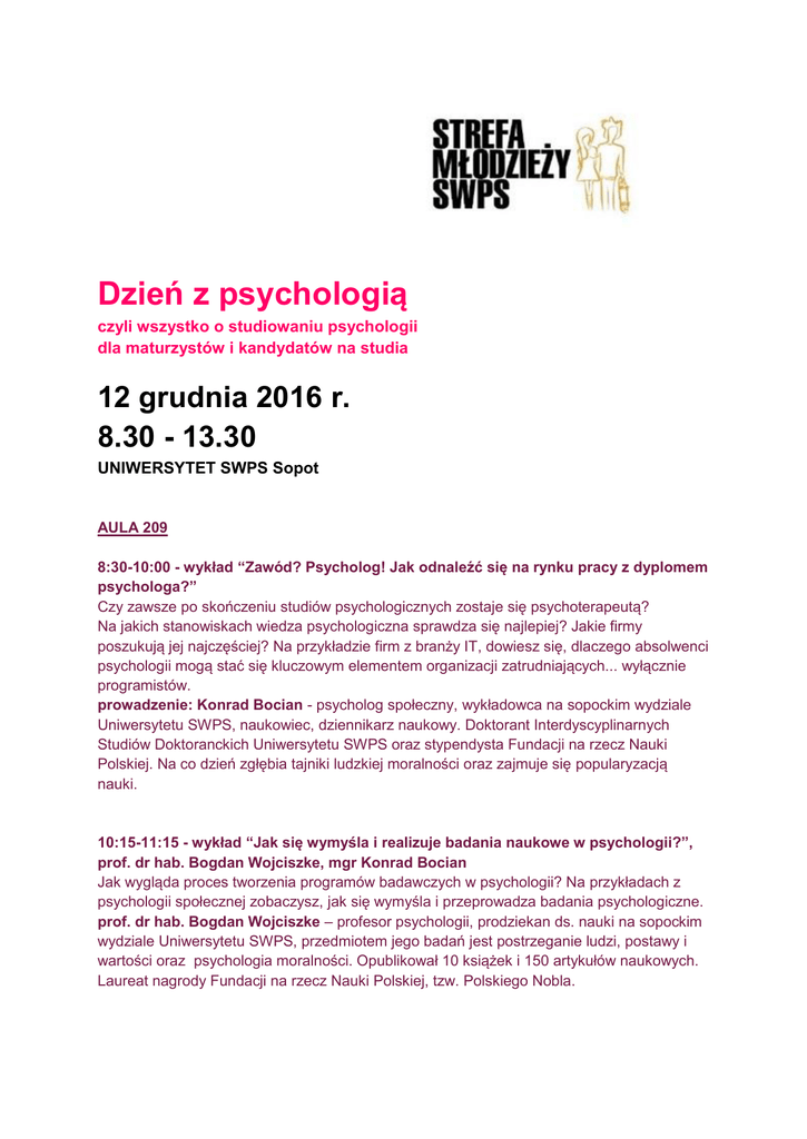 Dzień z psychologią czyli wszystko o studiowaniu psychologii dla maturzystów i kandydatów na studia 12 grudnia 2016 r. 8.30 - 13.30 UNIWERSYTET SWPS Sopot AULA 209 8:30-10:00 - wykład “Zawód? Psycholog! Jak odnaleźć się na rynku pracy z dyplomem psychologa?” Czy zawsze po skończeniu studiów psychologicznych zostaje się psychoterapeutą? Na jakich stanowiskach wiedza psychologiczna sprawdza się najlepiej? Jakie firmy poszukują jej najczęściej? Na przykładzie firm z branży IT, dowiesz się, dlaczego absolwenci psychologii mogą stać się kluczowym elementem organizacji zatrudniających... wyłącznie programistów. prowadzenie: Konrad Bocian - psycholog społeczny, wykładowca na sopockim wydziale Uniwersytetu SWPS, naukowiec, dziennikarz naukowy. Doktorant Interdyscyplinarnych Studiów Doktoranckich Uniwersytetu SWPS oraz stypendysta Fundacji na rzecz Nauki Polskiej. Na co dzień zgłębia tajniki ludzkiej moralności oraz zajmuje się popularyzacją nauki. 10:15-11:15 - wykład “Jak się wymyśla i realizuje badania naukowe w psychologii?”, prof. dr hab. Bogdan Wojciszke, mgr Konrad Bocian Jak wygląda proces tworzenia programów badawczych w psychologii? Na przykładach z psychologii społecznej zobaczysz, jak się wymyśla i przeprowadza badania psychologiczne. prof. dr hab. Bogdan Wojciszke – profesor psychologii, prodziekan ds. nauki na sopockim wydziale Uniwersytetu SWPS, przedmiotem jego badań jest postrzeganie ludzi, postawy i wartości oraz psychologia moralności. Opublikował 10 książek i 150 artykułów naukowych. Laureat nagrody Fundacji na rzecz Nauki Polskiej, tzw. Polskiego Nobla. 11:30-12:15 - wykład “Psychologia pozytywna i nauka o szczęściu” W czasie wykładu powiemy sobie o tym, czym jest (i czym nie jest) szczęście i dobrostan oraz co na ten temat wie psychologia jako nauka. Opowiemy też, czy można ją wykorzystać do poprawienia własnego szczęścia, ze szczególnym uwzględnieniem na przykład tzw. pozytywnej edukacji. prowadzenie: dr Marlena Kossakowska - psycholog zdrowia z sopockiego wydziału Uniwersytetu SWPS. Zajmuje się psychologią pozytywną, ale swoją drogę naukową (i jako praktyk) rozpoczęła od psychologii klinicznej i zdrowia. Jest członkiem Zarządu International Positive Psychology Association (IPPA). W roku 2013 została nominowana do prestiżowej nagrody: Christopher Peterson Gold Medal przez International Positive Psychology Association. 12:30-13:30 - wykład “Diagnoza inteligencji emocjonalnej” Inteligencja emocjonalna to pewien rodzaj inteligencji mającej znaczenie w przetwarzaniu informacji o emocjach. Obejmuje ona grupy zdolności: rozpoznanie emocji, używanie emocji, rozumienie emocji i zarządzanie emocjami. Wszystkie cztery poznasz podczas wykładu. prowadzenie: dr Dorota Szczygieł - specjalizuje się w uwarunkowaniach i konsekwencjach regulacji emocji w pracy zawodowej. Bada, w jaki sposób strategie regulacji emocji stosowane przez pracownika wpływają na jego dobrostan, a w szerszej perspektywie na kondycję ekonomiczną organizacji. Jest autorką licznych publikacji dotyczących związku między emocjami i inteligencją emocjonalną a psychicznym dobrostanem człowieka. Na Uniwersytecie SWPS w Sopocie prowadzi zajęcia z zakresu diagnozy psychologicznej oraz psychologii różnic indywidualnych. Sala 006 8:30-10:00 - warsztat “Efektywna komunikacja - jak się dogadać z innymi?” Warsztat dotyczący komunikacji w okresie nastoletnim, o trudnościach w komunikacji wynikających ze zmian rozwojowych oraz wyzwaniach w relacjach opartych na skutecznym przekazie. Zajęcia opierają się o treści praktyczne, bazując na podstawach teorii komunikacji. Jako uczestnik zapoznasz się z efektywnymi metodami komunikacji i możliwościami ich wykorzystania. prowadzenie: mgr Bartosz Karcz, Psycholog, pracownik naukowo-dydaktyczny sopockiego wydziału Uniwersytetu SWPS, prowadzi badania z zakresu rozwoju tożsamości wieku adolescencji, związków choroby przewlekłej z jakością życia oraz rozwojem seksualności. Prowadzi zajęcia ze studentami, szkolenia dla instytucji, szkół oraz organizacji pozarządowych. 10:15-11:45 - warsztat “Czy reklama podprogowa jest skuteczna? Co ma wspólnego psychoanaliza z marketingiem? Czemu hasło „Just do it!” działa?” Na takie i inne pytania odpowiemy sobie w trakcie warsztatu dotyczącego psychologii w marketingu. Porozmawiamy na temat skuteczności reklam, a także zapoznamy się z najnowszymi wynikami badań na ten temat. prowadzenie: dr Agnieszka Popławska-Boruc, Psycholog organizacji i zarządzania. Ukończyła także studia magisterskie z ekonomii, specjalność marketing. Oprócz zajęć dydaktycznych na Uniwersytecie SWPS uczestniczyła w różnych projektach doradczych z zakresu zarządzania zasobami ludzkimi i marketingu. Zajmuje się także psychologią poznawczą, prowadzi badania nad uczeniem utajonym. Drugim obszarem zainteresowań badawczych jest psychologia marketingu, a zwłaszcza różnice indywidualne w przetwarzaniu treści reklamowych. Współpracowała z Politechniką Gdańską w projekcie promocji Centrum Doskonałości NIWA, które udostępnia zaawansowaną infrastrukturę informatyczną dla osób tworzących aplikacje. Na Uniwersytecie SWPS prowadzi zajęcia dotyczące planowania kariery zawodowej, a także psychologii organizacji i marketingu. 12:00-13:30 - warsztat „Trening twórczości” Kreatywność to jedna z najbardziej pożądanych kompetencji na współczesnym rynku pracy. Zapytaj, czy chcemy być kreatywni, bez namysłu odpowiadamy twierdząco. Jeśli jednak w pracy, nauce, czy życiu codziennym staniemy przed wyborem, czy tworzyć czy korzystać z gotowych rozwiązań, zazwyczaj wybieramy tę drugą opcję... Czyżby hipokryzja? A może kreatywność wcale nie jest taka fajna, jak się wydaje? O tym, czy naprawdę, chcesz myśleć twórczo i jak tę umiejętność rozwijać, dowiesz się na warsztacie: MY