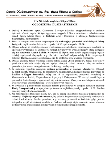 Parafia OO.Bernardynów pw. Św. Brata Alberta w Lublinie Ul. Willowa 15, 20-819 LUBLIN; tel. (81) 718 80 60; www.lublin.bernardyni.pl XIV Niedziela zwykła – 3 lipca 2016 r. OGŁOSZENIA DUSZPASTERSKIE 1. Dzisiaj I niedziela lipca. Członkom Żywego Różańca przypominamy o zmianie tajemnic różańcowych. W tym tygodniu przypada I Środa miesiąca z nabożeństwem przed figurą Matki Bożej z Kalabrii oraz I Czwartek z adoracją Najświętszego Sakramentu. Zapraszamy. 2. Wraz z nowym miesiącem rozpoczyna się wakacyjny porządek niedzielnych Mszy świętych, czyli zamiast Mszy św. o godz. 16.30 będzie o godz. 20.00. 3. Odpowiadając na zeszłotygodniowy list naszego arcybiskupa, zapraszający młodzież na specjalne wydarzenie w Lublinie w ramach Światowych Dni Młodzieży, które odbędzie się na stadionie Arena Lublin w sobotę 23 lipca, nasz sztab organizacyjny będzie dzisiaj zapisywał chętnych, aby dla nich zamówić odpowiednią ilość bezpłatnych biletów. Bardzo prosimy o zgłoszenie się do stolików przy wyjściu z kościoła. 4. Dzisiaj chcemy także wesprzeć ogólnopolską akcję „Stop aborcji”. Nadal bowiem w polskich szpitalach zabija się ok. tysiąc chorych dzieci rocznie. Aby to zmienić potrzebne jest nasze zaangażowanie, do którego zachęcamy. 5. W ostatnim tygodniu nastąpiła zmiana personalna w naszym klasztorze. Odszedł o. Emil Basak, przeniesiony do klasztoru w Zakopanem, a na jego miejsce przyszedł do Lublina o. Edgar Semeniuk, który ma 14 lat kapłaństwa, pracował wcześniej w klasztorach w Łodzi, Częstochowie, Łęczycy i Zakopanem. W naszej parafii będzie prowadził katechizację i opiekował się ministrantami. Życzymy mu błogosławionych owoców pracy duszpasterskiej i wiele duchowych radości. 6. W związku z planowaniem różnych działań parafialnych w drugim półroczu prosimy Radę Duszpasterską na specjalne spotkanie w najbliższą środę o godz. 19.00. Bardzo prosimy wszystkich o obecność. 7. Na zakończenie dzisiejszej Mszy św., jak w każdą I niedzielę miesiąca uklękniemy do adoracji Najświętszego Sakramentu, by polecić Bogu rozpoczynające się wakacje dla dzieci i młodzieży. Bardzo prosimy, aby wszyscy pozostali w kościele, gdyż jest to integralna część dzisiejszej modlitwy. Podczas adoracji użyta zostanie nowa, złocona podstawa pod monstrancję, ufundowana z okazji konsekracji kościoła.