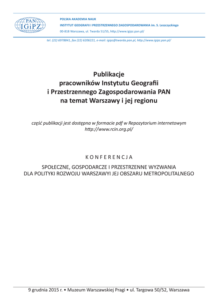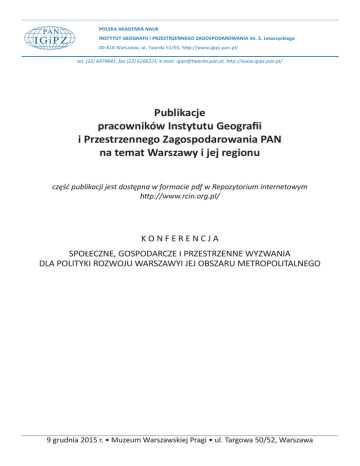 POLSKA AKADEMIA NAUK INSTYTUT GEOGRAFII I PRZESTRZENNEGO ZAGOSPODAROWANIA im. S. Leszczyckiego 00-818 Warszawa, ul. Twarda 51/55, h p://www.igipz.pan.pl/ tel. (22) 6978841, fax (22) 6206221, e-mail: [email protected], h p://www.igipz.pan.pl/ Publikacje pracowników Instytutu Geografii i Przestrzennego Zagospodarowania PAN na temat Warszawy i jej regionu część publikacji jest dostępna w formacie pdf w Repozytorium internetowym h p://www.rcin.org.pl/ KONFERENCJA SPOŁECZNE, GOSPODARCZE I PRZESTRZENNE WYZWANIA DLA POLITYKI ROZWOJU WARSZAWYI JEJ OBSZARU METROPOLITALNEGO 9 grudnia 2015 r. • Muzeum Warszawskiej Pragi • ul. Targowa 50/52, Warszawa I. WYDAWNICTWA MONOGRAFICZNE 2015 Korcelli-Olejniczak E., Bierzyński A., Piotrowski F., 2015, Report 2j. Fieldwork inhabitants, Warsaw (Poland), IGiPZ PAN, Warszawa, 51 s. 2014 Błażejczyk K., Kuchcik M., Milewski P., Dudek W., Kręcisz B., Błażejczyk A., Szmyd J., Degórska B., Pałczyński Cezar, 2014, Miejska wyspa ciepła w Warszawie. Uwarunkowania klimatyczne i urbanistyczne, Wydawnictwo Akademickie Sedno, Warszawa, 171 s. Górczyńska M., 2014, Zmiany zróżnicowań społecznych i przestrzennych w wybranych dzielnicach Warszawy i aglomeracji paryskiej: dynamika i aktorzy, Prace Geograficzne, 246, IGiPZ PAN, Warszawa, 282 s. Korcelli-Olejniczak E., Bierzyński A., Grochowski M., Węcławowicz G., 2014, Urban policies on diversity in Warsaw, Warsaw, Poland, IGSO PAS, 31 s. Korcelli-Olejniczak E., Bierzyński A., Węcławowicz G., 2014, Governance arrangements and ini a ves in Warsaw, Poland, IGSO PAS, Warsaw, 38 s. Stępniak M., 2014, Przekształcenia przestrzennego rozmieszczenia zasobów mieszkaniowych w Warszawie w latach 1945-2008, Prace Geograficzne, 245, IGiPZ PAN, Warszawa, 168 s. Śleszyński P., 2014, Przemiany społeczno-demograficzne województwa mazowieckiego w latach 1990-2030, Trendy Rozwojowe Mazowsza, 15, Mazowieckie Biuro Planowania Regionalnego, Warszawa, 128 s. 2013 Czapiewski K., Janc K., 2013, Edukacja jako czynnik rozwoju Mazowsza, Trendy Rozwojowe Mazowsza, 11, Mazowieckie Biuro Planowania Regionalnego, Warszawa, 129 s. Górczyńska M., 2013, Changement de la différencia on socio-spa ale des quar ers à Varsovie et dans l’aggloméraon parisienne: dynamiques et acteur, Villeneuve d’Ascq: ANRT - Universite Lille 3, 268 s. Komornicki T., Korcelli P., Siłka P., Śleszyński P., Świątek D., 2013, Powiązania funkcjonalne pomiędzy polskimi metropoliami, Wydawnictwo Akademickie Sedno, Warszawa, 215 s. Komornicki T., Wiśniewski R., Stępniak M., Siłka P., Rosik P., 2013, Rynek pracy województwa mazowieckiego - analiza przestrzenna, Trendy Rozwojowe Mazowsza, 12, Mazowieckie Biuro Rozwoju Regionalnego, Warszawa, 121 s. Węcławowicz G., 2013, Transna onal development strategy for the post-socialist ci es of Central Europe, Warszawa, IGiPZ PAN, 79 s. 2012 Czapiewski K., Kulikowski R., Bański J., Bednarek-Szczepańska M., Mazur M., Ferenc M., 2012, Wykorzystanie ICT w rolnictwie Mazowsza – ujęcie przestrzenne, Studia Obszarów Wiejskich, 30, PTG, IGiPZ PAN, Warszawa, 148 s. Komornicki T., Bański J., Śleszyński P., Rosik P., Czapiewski K., Korcelli P., Świątek D., Degórska B., Siłka P., Wiśniewski R., Stępniak M., Mazur M., 2012, Zagospodarowanie infrastrukturalne i kapitał fizyczny oraz policentryczność rozwoju Mazowsza, Trendy Rozwojowe Mazowsza,4, Mazowieckie Biuro Planowania Regionalnego, Warszawa, 56 s. Korcelli P., Grochowski M., Kozubek E.B., Korcelli-Olejniczak E., Werner P., 2012, Development of urban-rural regions, from European to local perspec ve, Monografie; 14, Warszawa, IGiPZ PAN, 158 s. Korcelli-Olejniczak E., 2012, Region metropolitalny - pojęcie, struktura przestrzenna, dynamika, Prace Geograficzne, 235, Warszawa, IGiPZ PAN, 189 s. 2011 2010 2009 2008 2007 2006 2 Kowalski M., Świątek D., Dziemianowicz W., Smigiel-Rawska K., 2012, Społeczne, polityczne i ekonomiczne stymulanty i destymulanty rozwoju Mazowsza, Trendy Rozwojowe Mazowsza, 6, Mazowieckie Biuro Planowania Regionalnego, Warszawa, 48 s. Stępniak M., Deręgowska A., Śleszyński P., 2012, Atlas. Społeczno-demograficzny rozwój Mazowsza. Mazowieckie Biuro Planowania Regionalnego, Warszawa, 4 s. + 50 tabl. Śleszyński P., 2012, Warszawa i Obszar Metropolitalny Warszawy a rozwój Mazowsza, Trendy Rozwojowe Mazowsza, 8, Warszawa, Mazowieckie Biuro Planowania Regionalnego, 160 s. Śleszyński P., Czapiewski K., Komornicki T., Stępniak M., Świątek D., Węcławowicz G., Deręgowska A., Janc K., Jaworska B., Rosik P., Siłka P., Wiśniewski R., 2012, Społeczno-demograficzne uwarunkowania rozwoju Mazowsza, Trendy Rozwojowe Mazowsza, 3, Mazowieckie Biuro Planowania Regionalnego, Warszawa, 52 s. Piekut A., Rees P., Gill V., Kupiszewski M., 2011, The tale of two ci es: diversity in Leeds and Warsaw, Working Paper, 11/01, Leeds: School of Geography, University of Leeds, X+130 s. Grzeszczak J., 2010, Gentryfikacja osadnictwa. Charakterystyka, rozwój koncepcji badawczej i przegląd wyjaśnień, Monografie; 11, Warszawa, IGiPZ PAN, 125 s. Gawryszewski A., 2009, Ludność Warszawy w XX wieku, Monografie, 10, IGiPZ PAN, Warszawa, 413 s. Komornicki T., Śleszyński P. (red.), 2009, Studia nad lokalizacją regionalnych portów lotniczych na Mazowszu, Prace Geograficzne, 220, IGiPZ PAN, Warszawa, 244 s. Śleszyński P., 2008, Duże przedsiębiorstwa w strukturze przestrzennej największych polskich miast, Prace Geograficzne, 217, IGiPZ PAN, Warszawa, 104 s. Bijak J., Kicinger A., Kupiszewski M., Śleszyński P., 2007, Studium metodologiczne oszacowania rzeczywistej liczby ludności Warszawy, CEFMR Working Paper, 2/2007, Warsaw, Central European Forum for Migra on Research, 78 s. Weigle A., Gardocki J., Haczek K., Jakubowski W., Lenart W., Nowicki W., Sobczyński L., Solon J., 2007, Program zwiększania lesistości dla Województwa Mazowieckiego do roku 2020, Samorząd Województwa Mazowieckiego, Warszawa, 189 s. Kupiszewski M., Bi