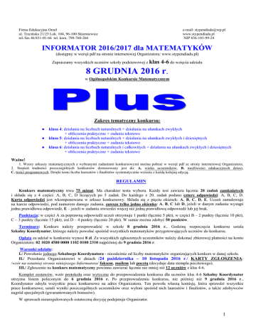 Firma Edukacyjna Orzeł ul. Trzcińska 21/23 Lok. 104, 96-100 Skierniewice tel./fax 46/831-01-66 tel. kom. 798-760-266 e-mail: [email protected] www.stypendiada.pl NIP 836-101-99-24 INFORMATOR 2016/2017 dla MATEMATYKÓW (dostępny w wersji pdf na stronie internetowej Organizatora: www.stypendiada.pl) Zapraszamy wszystkich uczniów szkoły podstawowej z klas 4-6 do wzięcia udziału 8 GRUDNIA 2016 r. w Ogólnopolskim Konkursie Matematycznym Zakres tematyczny konkursu: ● klasa 4: działania na liczbach naturalnych + działania na ułamkach zwykłych + obliczenia praktyczne + zadania tekstowe ● klasa 5: działania na liczbach naturalnych + działania na ułamkach zwykłych i dziesiętnych + obliczenia praktyczne + zadania tekstowe ● klasa 6: działania na liczbach naturalnych i całkowitych + działania na ułamkach zwykłych i dziesiętnych + obliczenia praktyczne + zadania tekstowe Ważne! 1. Wzory arkuszy matematycznych z wybranymi zadaniami konkursowymi można pobrać w wersji pdf ze strony internetowej Organizatora. 2. Stopień trudności poszczególnych konkursów dostosowany jest do: A. wieku uczestników, B. możliwości edukacyjnych dzieci, C. treści programowych. Dzięki temu liczba laureatów i finalistów systematycznie wzrasta z każdą kolejną edycją. REGULAMIN Konkurs matematyczny trwa 75 minut. Ma charakter testu wyboru. Każdy test zawiera łącznie 20 zadań zamkniętych i składa się z 4 części: A, B, C, D liczących po 5 zadań. Do każdego z 20. zadań podano cztery odpowiedzi: A, B, C, D. Karta odpowiedzi jest wkomponowana w arkusz konkursowy. Składa się z pięciu okienek: A, B, C, D, E. Uczeń zamalowuje na karcie odpowiedzi, pod numerem danego zadania, zawsze tylko jedno okienko: A, B, C lub D, jeżeli w danym zadaniu wystąpi jedna prawidłowa odpowiedź, E – jeżeli w zadaniu stwierdzi więcej niż jedną prawidłową odpowiedź lub jej brak. Punktacja: w części A za poprawną odpowiedź uczeń otrzymuje 1 punkt (łącznie 5 pkt), w części B – 2 punkty (łącznie 10 pkt), C – 3 punkty (łącznie 15 pkt), zaś D – 4 punkty (łącznie 20 pkt). W sumie można zdobyć 50 punktów. Terminarz: Konkurs należy przeprowadzić w szkole 8 grudnia 2016 r.. Godzinę rozpoczęcia konkursu ustala Szkolny Koordynator, którego należy powołać spośród wszystkich matematyków przygotowujących uczniów do konkursu. Opłata za udział w konkursie wynosi 8 zł. Za wszystkich zgłoszonych uczestników należy dokonać zbiorowej płatności na konto Organizatora: 02 1020 4580 0000 1102 0100 2310 najpóźniej do 9 grudnia 2016 r. Warunki udziału: I./ Powołanie jednego Szkolnego Koordynatora - niezależnie od liczby matematyków organizujących konkurs w danej szkole. II./ Przesłanie Organizatorowi w dniach /24 października – 10 listopada 2016 r./ KARTY ZGŁOSZENIA: /wzór na ostatniej stronie niniejszego Informatora/ faksem, mailem lub pocztą (decyduje data stempla pocztowego). III./ Zgłoszenie na konkurs matematyczny powinno zawierać łącznie nie mniej niż 12 uczniów z klas 4-6. Komplet zestawów, wzór protokołu oraz wytyczne do przeprowadzenia konkursu dla uczniów klas 4-6 Szkolny Koordynator otrzyma listem poleconym do 6 grudnia 2016 r. Po przeprowadzeniu konkursu, nie później niż 9 grudnia 2016 r., Koordynator odsyła wszystkie prace konkursowe na adres Organizatora. Ten powoła własną komisję, która sprawdzi wszystkie prace konkursowe, ustali wyniki poszczególnych uczestników oraz wyłoni spośród nich laureatów i finalistów, a także zdobywców nagród specjalnych (gwarantowanych bonusów). W sprawach nieuregulowanych ostateczną decyzję podejmuje Organizator. 1 WYKAZ NAGRÓD: I. NAGRODY GŁÓWNE: /to przyznawane ex aequo książki, dyplomy i medale/ 1. Dla laureatów konkursu – za zajęcie: I miejsca (50 p.) - książka, dyplom oraz złoty medal laureata, II miejsca (49 p.) - książka, dyplom i srebrny medal laureata, III miejsca (48 p.) - książka, dyplom i brązowy medal laureata. 2. Dla finalistów - za zajęcie miejsc IV-VIII (47 – 43 p.) – wyróżnienie - dyplom oraz medal finalisty. 3. Dla uczestników - za zajęcie miejsca od IX do LI (42 – 0 p.) - dyplom uczestnika. II. NAGRODY SPECJALNE: / to stypendia naukowe, puchary, rower sportowy, smartfon oraz tablety i telefony komórkowe, czyli GWARANTOWANE BONUSY dla uczniów z najwyższą punktacją/ 1) Kategoria I (Główne Grand Prix - powyżej 59 uczestników) : IA. „Złoty Puchar” - dla szkoły, która uplasuje się w skali kraju na I miejscu, tzn. zgłosi łącznie powyżej 59 uczestników, a Ci uzyskają najlepszy średni wynik w kraju w kategorii szkół - powyżej 59 uczestników. IB. 4-miesięczne STYPENDIUM NAUKOWE - w wysokości 800 zł (4 x 200 zł) oraz rower sportowy dla najlepszego ucznia zdobywcy, w zwycięskiej szkole, najwyższej liczby punktów. Ponadto, w tej kategorii zostaną przyznane dla pozostałych szkół i ich najlepszych uczniów następujące nagrody: za zajęcie II miejsca: szkoła - „Srebrny Puchar”, uczeń – stypendium w wysokości 600 zł (3 x 200 zł), za zajęcie III miejsca: szkoła - „Brązowy Puchar”, uczeń – stypendium w wysokości 400 zł (2 x 200 zł), za zajęcie IV miejsca: szkoła - „Puchar Finalisty”, uczeń – stypendium w wysokości 300 zł (2 x 150 zł), za zajęcie V miejsca: szkoła - „Puchar Finalisty”, uczeń – stypendium w wysokości 250 zł (2 x 125 zł). Stypendia naukowe będą wypłacane od III do VI 2017 r. Kategoria II (Extra Grand Prix - powyżej 59 uczestników): Tablet - dla wszystkich zdobywców I miejsc, których szkoła uplasuje się w skali kraju na I miejscu, tzn. zgłosi do konkursu łącznie powyżej 59 uczestników, a Ci uzyskają najlepszy średni wynik w kraju w kategorii szkół - powyżej 59 uczestników. 2) Kategoria III (Główne Grand Prix - od 24 do 59 uczestników) : IIIA. „Złoty Puchar” - dla szkoły, która uplasuje się w skali kraju na I miejscu,