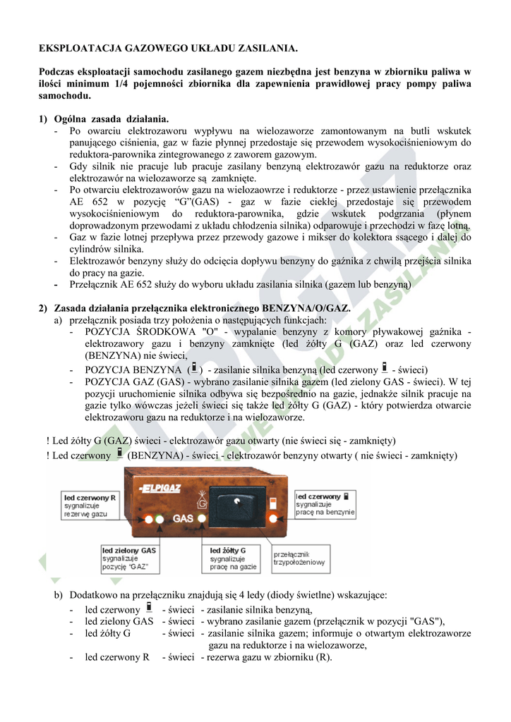 EKSPLOATACJA GAZOWEGO UK ADU ZASILANIA. Podczas eksploatacji samochodu zasilanego gazem niezb(dna jest benzyna w zbiorniku paliwa w ilo,ci minimum 1/4 pojemno,ci zbiornika dla zapewnienia prawid0owej pracy pompy paliwa samochodu. 1) Ogólna zasada dzia0ania. - Po owarciu elektrozaworu wyp ywu na wielozaworze zamontowanym na butli wskutek panuj cego ci nienia, gaz w fazie p ynnej przedostaje si przewodem wysokoci nieniowym do reduktora-parownika zintegrowanego z zaworem gazowym. - Gdy silnik nie pracuje lub pracuje zasilany benzyn elektrozawór gazu na reduktorze oraz elektrozawór na wielozaworze s zamkni te. - Po otwarciu elektrozaworów gazu na wielozaowrze i reduktorze - przez ustawienie prze cznika AE 652 w pozycj “G”(GAS) - gaz w fazie ciek ej przedostaje si przewodem wysokoci nieniowym do reduktora-parownika, gdzie wskutek podgrzania (p ynem doprowadzonym przewodami z uk adu ch odzenia silnika) odparowuje i przechodzi w faz lotn . - Gaz w fazie lotnej przep ywa przez przewody gazowe i mikser do kolektora ss cego i dalej do cylindrów silnika. - Elektrozawór benzyny s u-y do odci cia dop ywu benzyny do ga.nika z chwil przej cia silnika do pracy na gazie. - Prze cznik AE 652 s u-y do wyboru uk adu zasilania silnika (gazem lub benzyn ) 2) Zasada dzia0ania prze05cznika elektronicznego BENZYNA/O/GAZ. a) prze cznik posiada trzy po o-enia o nast puj cych funkcjach: - POZYCJA 5RODKOWA "O" - wypalanie benzyny z komory p ywakowej ga.nika elektrozawory gazu i benzyny zamkni te (led -ó ty G (GAZ) oraz led czerwony (BENZYNA) nie wieci, - POZYCJA BENZYNA ( ) - zasilanie silnika benzyn (led czerwony - wieci) - POZYCJA GAZ (GAS) - wybrano zasilanie silnika gazem (led zielony GAS - wieci). W tej pozycji uruchomienie silnika odbywa si bezpo rednio na gazie, jednak-e silnik pracuje na gazie tylko wówczas je-eli wieci si tak-e led -ó ty G (GAZ) - który potwierdza otwarcie elektrozaworu gazu na reduktorze i na wielozaworze. ! Led -ó ty G (GAZ) wieci - elektrozawór gazu otwarty (nie wieci si - zamkni ty) ! Led czerwony (BENZYNA) - wieci - elektrozawór benzyny otwarty ( nie wieci - zamkni ty) b) Dodatkowo na prze - led czerwony - led zielony GAS - led -ó ty G - czniku znajduj si 4 ledy (diody wietlne) wskazuj ce: - wieci - zasilanie silnika benzyn , - wieci - wybrano zasilanie gazem (prze cznik w pozycji "GAS"), - wieci - zasilanie silnika gazem; informuje o otwartym elektrozaworze gazu na reduktorze i na wielozaworze, led czerwony R - wieci - rezerwa gazu w zbiorniku (R). 3) Prze05czenie z zasilania benzyn5 na zasilanie gazem. Prze czenie z zasilania benzyn na zasilanie gazem mo-e nast piA tylko przy pracuj cym silniku. Aby przej A z zasilania benzyn na zasilanie gazem nale-y prze cznik ustawiA w po o-eniu rodkowym (wypalanie benzyny) celem wypalenia benzyny z komory p ywakowej ga.nika (elektrozawór benzyny i elektrozawór gazu s zamkni te). Po kilkudziesi ciu sekundach w momencie wyczuwalnego zmniejszenia pr dko ci obrotowej silnika ustawiA prze cznik w po o-enie GAS (GAZ) i lekko zwi kszyA obroty silnika celem zapobie-enia nierównomiernej pracy. 4) Prze05czenie z zasilania gazem na zasilanie benzyn5. Podczas pracy silnika zwi kszyA jego obroty i prze cznik ustawiA od razu w po o-enie (BENZYNA) - bez zatrzymywania si na pozycji rodkowej. UWAGA! ZMIANA ZASILANIA BENZYNE NA ZASILANIE GAZEM MOFE BYG WYKONYWANA ZARÓWNO W CZASIE JAZDY JAK I NA POSTOJU. 5) Uruchamianie zimnego silnika. a) Prze cznik (7) ustawiA w po o-eniu (BENZYNA) i uruchomiA silnik, b) Gdy silnik osi gnie temperatur 40-50°C, prze cznik ustawiA w po o-eniu rodkowym (wypalanie benzyny) celem wypalenia benzyny z komory p ywakowej ga.nika. Po pierwszych oznakach nierównomiernej pracy silnika ustawiA prze cznik w po o-enie GAS (GAZ), c) Gdy temperatura otoczenia jest zbli-ona do 20°C mo-na uruchomiA silnik bezpo rednio na gazie. Warunkiem jest to, ;e w komorze p0ywakowej ga<nika nie ma benzyny tzn. silnik poprzednio pracowa0 na gazie!! 6) Uruchomienie ciep0ego silnika. a) Je-eli silnik przed ostatnim unieruchomieniem pracowa na gazie, to mo-na uruchomiA ciep y silnik bezpo rednio na gazie (prze cznik w pozycji GAS (GAZ). b) Po w czeniu zap onu nast pi otwarcie elektrozaworów gazu (na chwil za wieci si led -ó ty G) i podanie do silnika dawki rozruchowej; po czym nale-y przekr ciA kluczyk aby w czyA rozrusznik i uruchomiA silnik. c) Je-eli przed ostatnim unieruchomieniem silnik pracowa na benzynie, nale-y po uruchomieniu silnika na benzynie ustawiA prze cznik w po o-eniu rodkowym (wypalanie benzyny) i po wypaleniu benzyny z komory p ywakowej prze cznik ustawiA w pozycji GAS (GAZ). 7) Objawy wyczerpania si( gazu. Objawem wyczerpania si gazu w zbiorniku jest wyra.ne ograniczenie rozwijanej przez silnik mocy. Jest to sygna dla kierowcy, -e nale-y przej A z zasilania gazem na zasilanie benzyn (ustawienie prze cznika w pozycj BENZYNA). 8) Sytuacje awaryjne. a) W razie trudno ci z uruchomieniem silnika na gazie (POZYCJA GAZ) nie nale-y kontynuowaA prób uruchomienia na gazie, gdy- grozi to wybuchem zgromadzonego gazu w kolektorze ss cym. Nale-y wówczas podj A prób uruchomienia samochodu na benzynie. b) Je-eli nast pi uszkodzenie instalacji elektrycznej gazowego uk adu zasilania (przepalenie bezpiecznika lub inne), mo-na przej A na awaryjne - r czne sterowanie zaworem benzynowym umo-liwiaj ce zasilanie silnika benzyn , w tym celu nale-y: - prze cznik ustawiA w pozycji rodkowej “0”, - ustawiA d.wigni sterowania r cznego na elektrozaworze benzyny w pozycj OPEN "otwarty" - uruchomiA silnik na benzynie