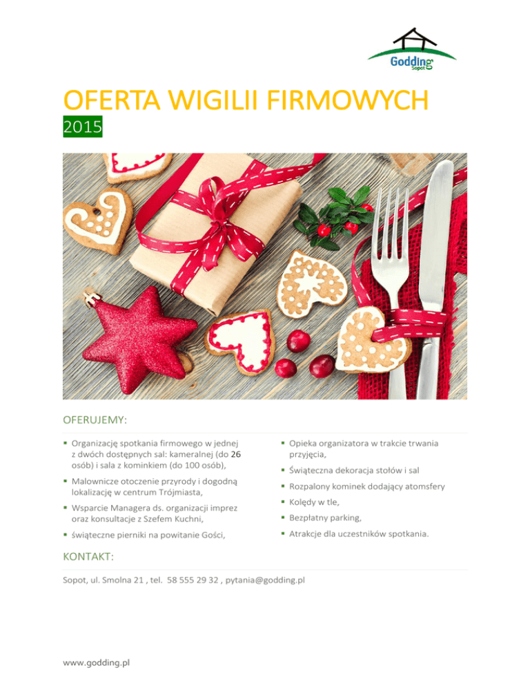 OFERTA WIGILII FIRMOWYCH 2015 OFERUJEMY: Organizację spotkania firmowego w jednej z dwóch dostępnych sal: kameralnej (do 26 osób) i sala z kominkiem (do 100 osób), Opieka organizatora w trakcie trwania przyjęcia, Świąteczna dekoracja stołów i sal Malownicze otoczenie przyrody i dogodną lokalizację w centrum Trójmiasta, Rozpalony kominek dodający atomsfery Wsparcie Managera ds. organizacji imprez oraz konsultacje z Szefem Kuchni, Bezpłatny parking, świąteczne pierniki na powitanie Gości, Kolędy w tle, Atrakcje dla uczestników spotkania. KONTAKT: Sopot, ul. Smolna 21 , tel. 58 555 29 32 , [email protected] www.godding.pl OFERUJEMY: MENU SERWOWANE I PRZYSTAWKA ZIMNA Rozeta z kaczki z sosem żurawinowym z chipsem z parmezanu na sałatce z mikro ziół ZUPA Krem grzybowy z kluseczkami truflowymi DANIE GŁÓWNE MENU SERWOWANE III PRZYSTAWKA ZIMNA Łosoś marynowany w soi i imbirze z pudrem oleju sezamowego z sałatką z ogórka i chilli ZUPA Pieczony łosoś podany ze złocistymi kopytkami i fasolką szparagową w cytrynowo- tymiankowym sosie Consome z kaczki z warzywami i makaronem DESER Pierś z kaczki z prażonymi jabłkami podana z pieczonymi ziemniakami i karmelizowanymi burakami w pieczeniowym sosie Torcik z białej czekolady z pudrem gorzkiej czekolady z sosem czarnego bzu Woda mienralna niegazowana CENA 120,00 zł netto + 8 %Vat/ osoby MENU SERWOWANE II PRZYSTAWKA ZIMNA Carpacio wołowe z prażonymi pistacjami, płatkami parmezanu z sałatką z mikro ziół ZUPA Tradycyjny barszcz czerowny z uszkami DANIE GŁÓWNE Zrazy z indyka faszerowane musem grzybowym w wytrawnym sosie z zielonego pieprzu podane z puree ziemniaczanym z karmelizowaną marchewką DESER Mus z wędzonej śliwki na czekoladowym spodzie z sorbetem z czarnej porzeczki Woda mienralna niegazowana CENA 130,00 zł netto + 8 % Vat/ osoby www.godding.pl DANIE GŁÓWNE DESER Biszkopt makowy z musem z orzechów włoskich z galaretką śliwkową Woda mienralna niegazowana CENA 140,00 zł netto +8 % Vat/ osoby OFERUJEMY: SZWEDZKIE BUFETY PROPOZYCJA I BUFET ZIMNY Śledź w śmietanie z szalotką Łosoś w galarecie z filetowanymi owocami Tatar z wędzonego pstrąga z musztardą francuską, świeżym ogórkiem i świeżą pietruszką Sałatka z makaronu razowego z makiem , rodzynkami i oliwą truflową Sałatka jarzynowa z zielonym groszkiem Ozory wołowe w galarecie z suszonymi owocami Schab pieczony z suszoną śliwką Vol a vent z wędzoną makrelą Marynaty, Pieczywo ,masło BUFET GORĄCY Krem grzybowy z truflowymi kluseczkami Łazanki z kapustą i grzybami Pieczone żeberka w sosie z kiszonego ogórka i czerwonej kapustą Karmelizowane buraki z tartym jabłkiem pieczonym Pieczone ziemniaki podsmażane Kasza gryczana www.godding.pl BUFET DESEROWY Kawa / Herbata Owoce sezonowe Makowiec Sernik ze skórką pomarańczową Mus z wędzonej herbaty z gorzką czekoladą w wiśniowym sosie Woda mineralna niegazowana CENA 130,00 zł netto + 23% Vat/ osoby SZWEDZKIE BUFETY Propozycja II BUFET ZIMNY Klopsiki z dorsza w zalewie octowej z czerwoną marchwią, cebulą i gorczycą Ryba po grecku Roladka drobiowa z suszonymi owocami w kaparowym sosie Tartaletka z musem z tuńczyka i swieżego kopru Karkówka szpikowana czosnkiem, wędzoną śliwką w pikantnym sosie BBQ Roladka wieprzowa z suszonymi borowikami Sałatka cezar z kurczakiem grillowanym, bekonem z grzankami czosnkowymi Marynaty,Pieczywo, masło BUFET GORĄCY Barszcz czerwony z uszkami Tradycyjny bigos z kiełbasą i suszoną śliwką Pieczona szynka z jałowcem w grzybowym sosie Zrazy wołowe z cebulą, ogórkiem i suszonym podgrzybkiem w sosie pieczeniowym Kutia z makaronem i rodzynkami waniliowym sosem Ziemniaki pieczone podsmażane Kopytka grillowane Warzywa z pomidorkami cherry Fasolka szparagowa z boczkiem i suszonym pomidorem www.godding.pl BUFET DESERY Kawa / Herbata (czarna, zielona, owocowa) Owoce sezonowe Pasha Sernik czekoladowy z wiśniami Tarta z owocami leśnymi z polewą z ciemnej czekolady Woda mineralna niegazowana CENA 140,00 zł netto +23% Vat / osoby POLECAMY WARSZTATY KULINARNE ALKOHOL PRODUKCJA KONFITUR ŚWIĄTECZNYCH open bar 60 zł netto + 23% Vat- napoje gazowane, soki, wódka, wino, piwo 235ml 55 zł netto/ szt. 106 ml 45 zł netto /szt. Proponujemy tworzenie konfitur, w kolorze logo firmy np.: - konfitura ze śliwek z korzenną przyprawą - konfitura z pomarańczy z morelami LEPIENIE ŚWIĄTECZNYCH PIEROGÓW 40 zł netto/ osoby - farsz do uzgodnienia proponujemy: z kapustą i grzybami lub z makiem i czekoladą DODATKOWE ATRAKCJE Fotobudka ze świątecznymi gadżetami 800 zł netto +23% Vat Dj + oprawa 1200 zł netto + 23% Vat www.godding.pl Open bar 50 zł netto + 23% Vat- wino, piwo, soki, napoje gazowane, PIWO keg 30l piwo 400 zł netto + 23% Vat keg 50l piwo 600 zł netto + 23% Vat Kociołek grzanego wina z korzennymi przyprawami 450 zł netto + 23% Vat (10l- około 60 porcji)