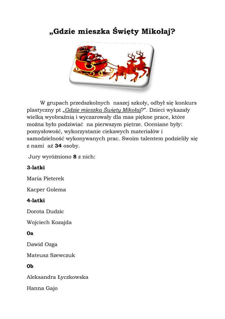 „Gdzie mieszka Święty Mikołaj? W grupach przedszkolnych naszej szkoły, odbył się konkurs plastyczny pt „Gdzie mieszka Święty Mikołaj?”. Dzieci wykazały wielką wyobraźnią i wyczarowały dla mas piękne prace, które można było podziwiać na pierwszym piętrze. Oceniane były: pomysłowość, wykorzystanie ciekawych materiałów i samodzielność wykonywanych prac. Swoim talentem podzieliły się z nami aż 34 osoby. Jury wyróżniono 8 z nich: 3-latki Maria Pieterek Kacper Golema 4-latki Dorota Dudzic Wojciech Kozajda 0a Dawid Ozga Mateusz Szewczuk 0b Aleksandra Łyczkowska Hanna Gajo GRATULUJEMY!!!