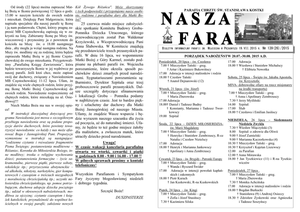 Od środy (22 lipca) można zapraszać Matkę Bożą w Ikonie poświęconej 12 lipca o godz. 15.00 w naszym kościele do swoich rodzin i mieszkań. Dziękuję Pani Małgorzacie, która napisała specjalnie dla naszej parafii tę Ikonę i ją nam podarowała. Chętni, którzy pragną zaprosić MB Częstochowską zapisują się w zakrystii na listę. Zabieramy Ikonę po Mszy św. wieczorowej i przynosimy ja z powrotem do kościoła na Mszę św. o 18.00 następnego dnia , aby mogła ja wziąć następna rodzina. Na Mszy św. modlimy się za rodzinę, która będzie zapraszała Matkę Bożą w jej Ikonie Częstochowskiej do swego mieszkania. Przygotowaliśmy „Parafialną Księgę Zawierzenia”, która będzie towarzyszyła Ikonie w jej wędrówce po naszej parafii. Jeśli ktoś chce, może zapisać swój dar duchowy, związany z Nawiedzeniem MB Częstochowskiej 11-12 lipca. Ufam, że znajdzie się wiele chętnych rodzin, które przyjmą Ikonę Matki Bożej Częstochowskiej do swoich rodzin. Nawiedzenie rozpoczniemy od chętnych rodzin, które mieszkają na ul. Osiedlowej!!! Niech Matka Boża ma nas w swojej opiece! W instrukcji diecezjalnej dotyczącej programu Nawiedzenia jest mowa o szczegółowym przebiegu nawiedzenia oraz są podane propozycje darów duchowych, które powinny towarzyszyć nawiedzeniu: co każdy z nas może ofiarować Bogu i Jasnogórskiej Pani. Propozycje wymienione w instrukcji są następujące: "codzienne czytanie i rozważanie fragmentów Pisma Świętego; postanowienia modlitewne – Różaniec, Koronka do Miłosierdzia Bożego, inne modlitwy; troska o religijne wychowanie dzieci; postanowienia formacyjne – życie sakramentalne, pierwsze piątki, pierwsze soboty, rekolekcje itp.; przyrzeczenia abstynenckie – od alkoholu, nikotyny, narkotyków, gier komputerowych i czasopism o treściach niezgodnych z moralnością chrześcijańską itp.; uczynki miłosierdzia chrześcijańskiego, np. pomoc potrzebującym, duchowa adopcja dziecka poczętego itp.; udział w okresowych nabożeństwach; modlitwa za ojczyznę; czytanie czasopism i książek katolickich; przynależność do wspólnot kościelnych w swojej parafii; założenie nowych Kół Żywego Różańca". Może skorzystamy z tych podpowiedzi i przygotujemy nasze osobiste, rodzinne i parafialne dary dla Matki Bożej? 25 czerwca miało miejsce założycielskie spotkanie Komitetu Budowy GrobuPomnika Dziecka Utraconego, którego przewodniczącym został Pan Waldemar Krzyżewski, a Wiceprzewodniczącą Pani Anna Ślubowska. W Komitecie znajdują się przedstawiciele trzech przasnyskich parafii. W dniu 16 lipca, we wspomnienie Matki Bożej z Góry Karmel, zostało podpisane na plebanii parafii św. Wojciecha porozumienie, które określa sposób pochówków dzieci zmarłych przed narodzinami. Sygnatariuszami porozumienia są: Burmistrz, Dyrektor Szpitala oraz trzej proboszczowie parafii przasnyskich. Dalsze szczegóły dotyczące sfinansowania i lokalizacji Grobu – Pomnika podamy w najbliższym czasie. Jest to bardzo piękny i szlachetny dar duchowy dla Matki Bożej Jasnogórskiej od naszego Miasta. Ufamy, że znajdzie Wasze wsparcie i będzie wyrazem naszego szacunku dla życia od poczęcia, aż do naturalnej śmierci. Ufamy, że będzie to też godne miejsce żałoby dla małżeństw, a zwłaszcza matek, które utraciły dziecko przed narodzinami. Uwaga! W czasie wakacji kancelaria parafialna otwarta we wtorki, czwartki i piątki w godzinach 8.00 - 9.00 i 16.00 - 17.00 !! W pilnych sprawach prosimy o kontakt telefoniczny! Wszystkim Parafianom i Sympatykom Fary życzymy błogosławionej niedzieli i dobrego tygodnia. Szczęść Boże! DUSZPASTERZE PARAFIA CHRZTU ŚW. STANISŁAWA KOSTKI BIULETYN INFORMACYJNY PARAFII ŚW. WOJCIECHA W PRZASNYSZU 19.VII.2015 R. NR 139(26)/2015 PORZĄDEK NABOŻEŃSTW 20.07.-30.08. 2015 A.D. Poniedziałek, 20 lipca – św. Czesława 7.00 † Mieczysław Tański – greg. † Artur i Kazimierz Bukowińscy 17.00 Adoracja w intencji małżonków i rodzin 18.00 † Czesław Tański † Anatol Dejnarowski (12) Wtorek, 21 lipca– (św. Józef) 7.00 † Mieczysław Tański – greg. † Maria Zberowska 17.00 Adoracja 18.00† Daniel i Tadeusz Budny † Konstanty, Marianna i Tadeusz Tworkowscy 19.00 Szpital Środa, 22 lipca – DZIEŃ MIŁOSIERDZIAśw. Marii Magdaleny 7.00 † Mieczysław Tański – greg. † Henryka i Stanisław Zembrzuscy, R-ce Natalia i Czesław Nizielscy 17.00 Adoracja 18.00 † Henryk i Marianna Jankowscy † Apolinary i Anna Zembrzuscy Czwartek, 23 lipca – św. Brygidy - Patronki Europy 7.00 † Mieczysław Tański – greg. † Wanda i Ryszard Świder 17.00 Adoracja w intencji powołań kapłańskich i zakonnych 18.00 † Piotr Kurach † Jan Kuskowski, R-na Kuskowskich Piątek, 24 lipca – św. Kingi 7.00 † Mieczysław Tański – greg. † Zofia i Józef Stusińscy 7.30 † Kazimiera Silska 17.00 Adoracja 18.00 † Wiesława i Stanisław Michalscy † Elżbieta Nowotka Sobota, 25 lipca – Święto św. Jakuba Apostoła, św. Krzysztofa: MIVA- dobrowolne ofiary na rzecz misjonarzy na środki transportu) 7.00 † Mieczysław Tański – greg. † Anna i Apolinary Zembrzuscy 7.30 † Jerzy Myśliński 14.00 Szpital: 17.00 Ślub 18.00 † Czesława i Emilian Jasińscy NIEDZIELA, 26 lipca – Siedemnasta Niedziela Zwykła 7.30 † Wiesław Miączyński (3) 8.00 Szpital: o zdrowie dla Oliwii 9.00 † Józef Zamielski 9.00 † Marianna Kaczorkowska (4) 10.30 † Mieczysław Tański – greg. 10.30 † Krzysztof i Kajetan Liszewscy 12.00 za Parafian 12.00 † Anna Mórawska 18.00 † Jan Tyszkiewicz (11) i R-na Tyszkiewiczów Poniedziałek, 27 lipca . 7.00 † Mieczysław Tański – greg. † Maria Zberowska 7.30 † Monika Achcińska 17.00 Adoracja w intencji małżonków i rodzin 18.00 † Bogdan Burkacki † Stanisława (9) i Andrzej Osieccy 18.30 † Zdzisław Zyskowski oraz Agnieszka i Tadeusz Soszyńscy Wtorek, 28 lipca – Wotywa o Duchu Świętym 7.00 † Mie