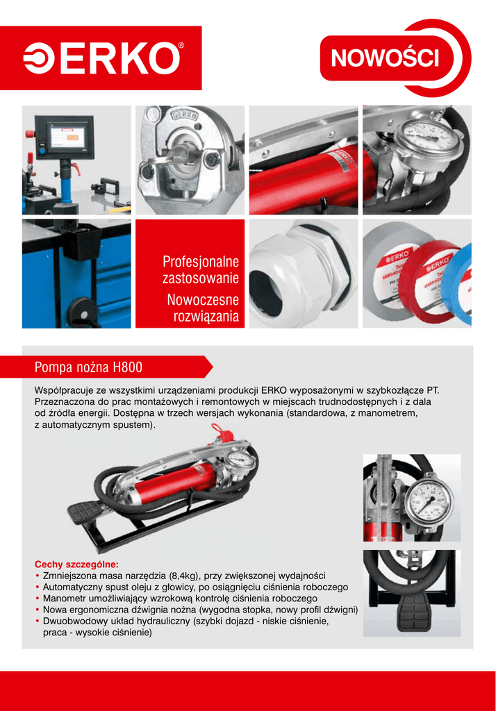 NOWOŚCI Profesjonalne zastosowanie Nowoczesne rozwiązania Pompa nożna H800 Współpracuje ze wszystkimi urządzeniami produkcji ERKO wyposażonymi w szybkozłącze PT. Przeznaczona do prac montażowych i remontowych w miejscach trudnodostępnych i z dala od źródła energii. Dostępna w trzech wersjach wykonania (standardowa, z manometrem, z automatycznym spustem). Cechy szczególne: • Zmniejszona masa narzędzia (8,4kg), przy zwiększonej wydajności • Automatyczny spust oleju z głowicy, po osiągnięciu ciśnienia roboczego • Manometr umożliwiający wzrokową kontrolę ciśnienia roboczego • Nowa ergonomiczna dźwignia nożna (wygodna stopka, nowy profil dźwigni) • Dwuobwodowy układ hydrauliczny (szybki dojazd - niskie ciśnienie, praca - wysokie ciśnienie) SH 800PLC – Urządzenie dla profesjonalisty Stanowisko do obróbki szyn prądowych 4 generacji. Służy do wykonywania precyzyjnego cięcia, gięcia, otworowania, odsadzania szyn Al i Cu w zakresie 12x125mm oraz wciskania nakrętek w szynach miedzianych i aluminiowych. W zależności od wyposażenia dostępne dwie wersje: Gold i Platinum. Cechy szczególne: • Dokładne i precyzyjne gięcie szyn z kompensacją sprężystości materiału, niezależnie od jego rodzaju • Nowe intuicyjne oprogramowanie sterujące • Nowy 7 calowy panel dotykowy LED • Czytelny i szczegółowy moduł pomocy, obrazowo instruujący operatora jak poprawnie obsługiwać urządzenie • Moduł serwisowy rozbudowany o informacje dotyczące terminów przeglądu urządzenia • Automatyczna identyfikacja zainstalowanego oprzyrządowania • Programowalny elektroniczny czujnik kąta gięcia (dokładność ustawienia 1°) • Liniały pomiarowe umożliwiające pozycjonowanie szyn z dokładnością 0,1mm • Precyzyjna regulacja wysokości głowicy urządzenia (dokładność 0,2mm) • Wykonywanie otworów okrągłych i owalnych w szynach bez gratu • Elektroniczny pomiar długości ciętej szyny(do 6m) • Elektroniczny pomiar długości giętej i otworowanej szyny (do 1,2m) • Powtarzalne odsadzanie szyn NOWOŚCI Elektropraska EPZC 300 Elektropraska z głowicą zatrzaskową. Przeznaczona do zaciskania końcówek i złączek rurowych Al i Cu w zakresie 6-300mm2, oczkowych i tulejkowych z izolacją i bez izolacji, oraz przeformowywania na okrągło sektorowych żył Al. Cechy szczególne: • Automatyczny wyłącznik kończący cykl pracy po wykonaniu prawidłowego zaprasowania - sygnalizacja zieloną diodą, nieprawidłowego - czerwoną • Elektroniczna rejestracja cyklu pracy- transfer danych przez USB • Wydajny akumulator litowo-jonowy • Automatyczna kontrola ciśnienia • Zatrzaskowa obrotowa głowica. Zakres obrotu 330° o 30 3 Praska ręczna HRZ 300-A Praska ręczna hydrauliczna służaca do średnio intensywnych prac instalatorskich. Przeznaczona do zaciskania końcówek i złączek rurowych Al i Cu w zakresie 6-300mm2, oczkowych i tulejkowych z izolacją i bez izolacji, oraz przeformowywania na okrągło sektorowych żył Al. Cechy szczególne: • Sygnalizacja osiągnięcia ciśnienia maksymalnego polegająca na wyczuwalnym zmniejszeniu obciążenia dźwigni podczas zaciskania końcówki na przewodzie • Zatrzaskowa, obrotowa głowica. Zakres obrotu o 180° Nóż monterski składany NSE Nóż dla elektryka do nacinania i odizolowywania przewodów Cechy szczególne: • Ostrze ze stali nierdzewnej o podwyższonej twardości • Posiada specjalne gniazda do precyzyjnego nacinania i ściągania izolacji Dławnice DK Dławnice kablowe przeznaczone do uszczelniania przejść przewodów przez obudowy urządzeń elektrycznych. Wykonane z bardzo wytrzymałego, samogasnącego, wolnego od halogenów i fosforu materiału. teriału. Łatwe w montażu. Cechy chy szczególne: • Materiał poliamid PA6 • Temperatura emperatura pracy od -40°C do 100°C • Stopień topień ochrony IP68 • Klasa palności UL94V-2 • Dostępne rozmiary: PG7-PG48 i M12-M40 • Dostępne w kolorze szarym (RAL 7035) i czarnym (RAL 9005) • Posiadają na nakrętce zintegrowane zabezpieczenie antywibracyjne Taśmy elektroizolacyjne TPVC Uniwersalne taśmy elektroizolacyjne znajdujące zastosowanie do izolowania przewodów, kabli elekrycznych, telekomunikacyjnych oraz cechowania drutów i wiązek przewodów dla napięcia do 6kV. Stosowane w miejscach gdzie wymagane są bardzo dob dobre własności elektroizolacyjne. Cechy szczególne: gólne: • Elastyczne • Samogasnące • Klasa termiczna 105°C • Odporne na czynniki chemiczne ERKO sp.j., 11-042 Jonkowo, ul. Hanowskiego 7, Polska tel./fax +48 89 512 92 73, dział sprzedaży: [email protected], www.erko.pl