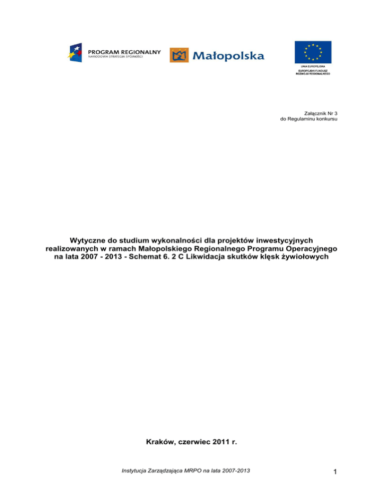Załącznik Nr 3 do Regulaminu konkursu Wytyczne do studium wykonalności dla projektów inwestycyjnych realizowanych w ramach Małopolskiego Regionalnego Programu Operacyjnego na lata 2007 - 2013 - Schemat 6. 2 C Likwidacja skutków klęsk Ŝywiołowych Kraków, czerwiec 2011 r. Instytucja Zarządzająca MRPO na lata 2007-2013 1 WPROWADZENIE Niniejsze Wytyczne określają wymagania Instytucji Zarządzającej Małopolskim Regionalnym Programem Operacyjnym na lata 2007-2013 (MRPO) w zakresie poŜądanej formy oraz zawartości studium wykonalności dla projektów inwestycyjnych aplikujących o dofinansowanie w ramach Schematu 6.2 C Likwidacja Skutków Klęsk śywiołowych. Wytyczne przeznaczone są wyłącznie dla projektów realizowanych w związku z wystąpieniem klęsk Ŝywiołowych skutkujących zniszczeniem infrastruktury na obszarze województwa małopolskiego oraz koniecznością jej odbudowy. Z uwagi na zakładany katalog projektów polegających przede wszystkim na przywróceniu zniszczonej infrastruktury do stanu sprzed wystąpienia klęski Ŝywiołowej, w ramach ww. Schematu zaproponowano uproszczoną formę prezentacji projektu w ramach studium wykonalności, koncentrując się na najwaŜniejszych aspektach. NaleŜy podkreślić, Ŝe niniejszy dokument nie zawiera wskazówek na wszystkie okoliczności jakie mogą zaistnieć w projekcie, dlatego teŜ dopuszcza się zastosowanie odmiennych rozwiązań (pod warunkiem ich uzasadnienia), jeŜeli tych postulowanych w Wytycznych nie da się zastosować lub ich zastosowanie jest nielogiczne, niecelowe. Oprócz podanych obligatoryjnych elementów, studium wykonalności moŜe zawierać dodatkowe informacje dotyczące tych aspektów projektu, które zdaniem Beneficjenta zostały zbyt ogólnie opisane we wniosku aplikacyjnym. W przypadku braku uregulowań w niniejszych Wytycznych, naleŜy skorzystać z innych dokumentów, w szczególności: a) Metodologia przeprowadzania analizy kosztów i korzyści. Wytyczne, Nowy okres programowania 2007-2013, Dokument roboczy nr 4, Bruksela, b) Przewodnik do analizy kosztów i korzyści projektów inwestycyjnych (ang. Guide to Cost-Benefit Analysis of investment Project), Komisja Europejska 2008 r., c) Wytyczne Ministra Rozwoju Regionalnego w zakresie wybranych zagadnień związanych z przygotowaniem projektów inwestycyjnych, w tym projektów generujących dochód, Warszawa, 15 stycznia 2009 r., d) Instrukcja oceny efektywności ekonomicznej przedsięwzięć drogowych i mostowych dla dróg gminnych, powiatowych, wojewódzkich, Instytut Badawczy Dróg i Mostów, Warszawa, Luty 2008. Instytucja Zarządzająca MRPO na lata 2007-2013 2 Spis treści SŁOWNIK STOSOWANYCH POJĘĆ ......................................................................... 4 1 Wstęp ................................................................................................................... 6 2 Zakres rzeczowy .................................................................................................. 6 3 Tło i uzasadnienie projektu................................................................................... 6 3.1 Stan aktualny ..............................................................................................................6 3.2 Identyfikacja problemów..............................................................................................6 3.3 Analiza opcji................................................................................................................7 4 5 6 7 8 9 Wskaźniki produktu i rezultatu.............................................................................. 7 Analiza instytucjonalna ......................................................................................... 7 Analiza oddziaływania na środowisko oraz wpływ na polityki horyzontalne ......... 8 Promocja projektu w tym informacja na temat źródeł dofinansowania projektu ... 8 Informacja na temat podatku VAT ........................................................................ 9 Analiza finansowa ...............................................................................................10 9.1 ZałoŜenia do analizy finansowej ................................................................................11 9.2 Projekcja przepływów pienięŜnych ............................................................................13 9.2.1 Nakłady inwestycyjne .........................................................................................14 9.2.2 Nakłady odtworzeniowe .....................................................................................14 9.2.3 Prognoza przychodów operacyjnych ..................................................................15 9.2.4 Prognoza kosztów operacyjnych ........................................................................16 9.2.5 Wartość rezydualna ...........................................................................................18 9.2.6 Zapotrzebowanie na kapitał obrotowy netto .......................................................18 9.3 Ustalenie poziomu dofinansowania projektu z MRPO ...............................................19 9.4 Obliczenie wskaźników efektywności finansowej ......................................................22 9.5 Źródła finansowania projektu i weryfikacja finansowej trwałości dla scenariusza z projektem .........................................................................................................................23 9.5.1 Źródła finansowania ...........................................................................................23 9.5.2 Trwałość finansowa dla scenariusz z projektem ......................................................24 9.6 Pro forma sprawozdania finansowe ..........................................................................25 10 Analiza kosztów i korzyści ...................................................................................25 Wzor