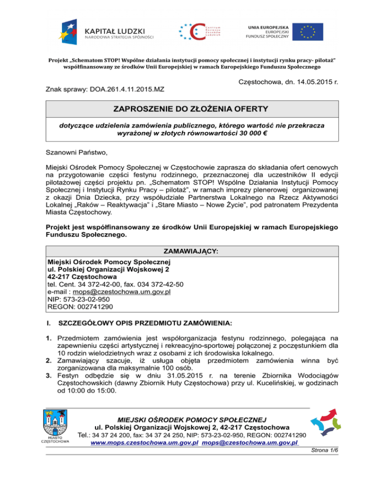 Projekt „Schematom STOP! Wspólne działania instytucji pomocy społecznej i instytucji rynku pracy- pilotaż” współfinansowany ze środków Unii Europejskiej w ramach Europejskiego Funduszu Społecznego Częstochowa, dn. 14.05.2015 r. Znak sprawy: DOA.261.4.11.2015.MZ ZAPROSZENIE DO ZŁOŻENIA OFERTY dotyczące udzielenia zamówienia publicznego, którego wartość nie przekracza wyrażonej w złotych równowartości 30 000 € Szanowni Państwo, Miejski Ośrodek Pomocy Społecznej w Częstochowie zaprasza do składania ofert cenowych na przygotowanie części festynu rodzinnego, przeznaczonej dla uczestników II edycji pilotażowej części projektu pn. „Schematom STOP! Wspólne Działania Instytucji Pomocy Społecznej i Instytucji Rynku Pracy – pilotaż”, w ramach imprezy plenerowej organizowanej z okazji Dnia Dziecka, przy współudziale Partnerstwa Lokalnego na Rzecz Aktywności Lokalnej „Raków – Reaktywacja” i „Stare Miasto – Nowe Życie”, pod patronatem Prezydenta Miasta Częstochowy. Projekt jest współfinansowany ze środków Unii Europejskiej w ramach Europejskiego Funduszu Społecznego. ZAMAWIAJĄCY: Miejski Ośrodek Pomocy Społecznej ul. Polskiej Organizacji Wojskowej 2 42-217 Częstochowa tel. Cent. 34 372-42-00, fax. 034 372-42-50 e-mail : [email protected] NIP: 573-23-02-950 REGON: 002741290 I. SZCZEGÓŁOWY OPIS PRZEDMIOTU ZAMÓWIENIA: 1. Przedmiotem zamówienia jest współorganizacja festynu rodzinnego, polegająca na zapewnieniu części artystycznej i rekreacyjno-sportowej połączonej z poczęstunkiem dla 10 rodzin wielodzietnych wraz z osobami z ich środowiska lokalnego. 2. Zamawiający szacuje, iż usługa objęta przedmiotem zamówienia winna być zorganizowana dla maksymalnie 100 osób. 3. Festyn odbędzie się w dniu 31.05.2015 r. na terenie Zbiornika Wodociągów Częstochowskich (dawny Zbiornik Huty Częstochowa) przy ul. Kucelińskiej, w godzinach od 10:00 do 15:00. MIEJSKI OŚRODEK POMOCY SPOŁECZNEJ ul. Polskiej Organizacji Wojskowej 2, 42-217 Częstochowa Tel.: 34 37 24 200, fax: 34 37 24 250, NIP: 573-23-02-950, REGON: 002741290 www.mops.czestochowa.um.gov.pl [email protected] Strona 1/6 Projekt „Schematom STOP! Wspólne działania instytucji pomocy społecznej i instytucji rynku pracy- pilotaż” współfinansowany ze środków Unii Europejskiej w ramach Europejskiego Funduszu Społecznego 4. W dniu organizacji imprezy Wykonawca zobowiązuje się pozostać w pełnej dyspozycji Zamawiającego i wykonywać wszelkie czynności niezbędne do prawidłowego przeprowadzenia imprezy. 5. W ramach części artystycznej Wykonawca zobowiązany będzie do: 1) zapewnienia co najmniej dwóch animatorów zabaw dla dzieci i dorosłych, w tym osoby do malowania twarzy dzieciom, 2) zapewnienie dmuchańca wraz z obsługą (np. dmuchanej zjeżdżalni lub zamku), 3) opracowania i przeprowadzenia konkursów, gier i zabaw dla dorosłych i dla dzieci, w tym: • malowanie twarzy dzieciom, • pokaz baniek mydlanych, • modelowanie balonów, • warsztaty graffiti, • konkurencje sportowe dla dzieci, np. bieg w workach, przeciąganie liny, hula hop, itp. 5. Wykonawca zobowiązany jest do zapewnienia różnorodnych drobnych upominków w formie nagród dla maksymalnie 40 dzieci. Upominkami tymi mogą być np. pluszowe maskotki, kolorowe piłki, miniaturowe samochodziki, drobne komplety klocków plastikowych, puzzle, zestawy zabawek do piaskownicy (wiaderko + łopatka + foremki), skarbonki, przybory szkolne typu np. ozdobne ołówki, komplety kredek pastelowych, zeszyty kolorowanek, długopisy, breloczki, kubeczki, taśmy tzw. „smycze” itp. Wydawane dzieciom drobne upominki muszą być zróżnicowane i dostosowane do wieku dziecka uczestniczącego w danej konkurencji lub zabawie. Przewiduje się udział w zabawach dzieci w wieku od 3 do 17 lat. 6. Wartość zestawu upominkowego dla jednego uczestnika nie może być mniejsza niż 25,00 zł brutto. Wykonawca do oferty dołącza wykaz zestawów upominkowych wraz z podaniem ich wartości, stanowiący załącznik nr 4. 7. Wykonawca w trakcie trwania festynu zapewni dla uczestników pilotażu wraz z osobami z ich środowiska, poczęstunek w postaci: 1) słodyczy np. ciastka kruche, cukierki typu „Mieszanka Wedlowska”, wafle kakaowe, itp. w ilości min. 25 dkg dla jednego uczestnika festynu; 2) waty cukrowej i popcornu wytwarzanych na miejscu przez cały okres trwania festynu; 3) kanapek (np. wędlina lub twarożek, masło, warzywa (pomidor, papryka, szczypiorek), pieczywo – bułka zwykła) – co najmniej 2 kanapki na 1 osobę; 4) napoi gazowanych typu „Cola Jurajska”, „Krzyś”, itp. podawanych w plastikowych kubkach o pojemności min. 0,25 l, w ilości co najmniej 1,5 l na 1 osobę; 5) soków pitnych w trzech smakach, np. pomarańczowym, jabłkowym i winogronowym, podawanych w plastikowych kubkach o pojemności min. 0,25 l, w ilości co najmniej 0,5 l na 1 osobę; 6) przekąsek w postaci paluszków, orzeszków, itp. 8. Koszty dostarczenia artykułów spożywczych i przygotowania poczęstunku Wykonawca uwzględnia w oferowanej cenie na świadczenie usług opisanych w przedmiocie MIEJSKI OŚRODEK POMOCY SPOŁECZNEJ ul. Polskiej Organizacji Wojskowej 2, 42-217 Częstochowa Tel.: 34 37 24 200, fax: 34 37 24 250, NIP: 573-23-02-950, REGON: 002741290 www.mops.czestochowa.um.gov.pl [email protected] Strona 2/6 Projekt „Schematom STOP! Wspólne działania instytucji pomocy społecznej i instytucji rynku pracy- pilotaż” współfinansowany ze środków Unii Europejskiej w ramach Europejskiego Funduszu Społecznego zamówienia. 9. Wykonawca zobowiązany jest do obsługi miejsc gastronomicznych w czasie trwania imprezy oraz do bieżącego utrzymania czystości w granicach powierzonego obszaru. 10. Wykonawca zobowiązany jest posiadać odpowiedni sprzęt umożliwiający sprawne przygotowanie i podawanie poczęstunku (przyczepa gastronomiczna, chłodnia/lodówka, maszyna do wytwarzania waty cukro