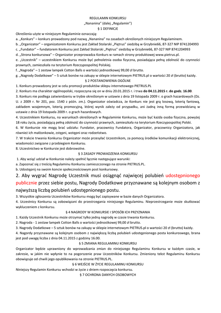 REGULAMIN KONKURSU „Nananina” (dalej „Regulamin”) § 1 DEFINICJE Określenia użyte w niniejszym Regulaminie oznaczają: a. „Konkurs” – konkurs prowadzony pod nazwą „Nananina” na zasadach określonych niniejszym Regulaminem. b. „Organizator” – organizatorem Konkursu jest Zakład Stolarski „Piętrus” siedzibą w Grzybnie66, 87-327 NIP 8741204993 c. „Fundator” – fundatorem Konkursu jest Zakład Stolarski „Piętrus” siedzibą w Grzybnie66, 87-327 NIP 8741204993 d. „Strona konkursowa” – Organizator przeprowadza Konkurs w ramach strony produktowej www.pietrus.pl. e. „Uczestnik” – uczestnikiem Konkursu może być pełnoletnia osoba fizyczna, posiadająca pełną zdolność do czynności prawnych, zamieszkała na terytorium Rzeczypospolitej Polskiej. f. „Nagroda” – 1 zestaw lampek Cotton Balls o wartości jednostkowej 99,00 zł brutto. g. „Nagrody Dodatkowe” – 5 sztuk bonów na zakupy w sklepie internetowym PIETRUS.pl o wartości 20 zł (brutto) każdy. § 2 POSTANOWIENIA OGÓLNE 1. Konkurs prowadzony jest w celu promocji produktów sklepu internetowego PIETRUS.PL 2. Konkurs ma charakter ogólnopolski, rozpoczyna się on w dniu 20.01.2015 r. i trwa do 04.11.2015 r. do godz. 16.00. 3. Konkurs nie podlega zatwierdzeniu w trybie określonym w ustawie z dnia 19 listopada 2009 r. o grach hazardowych (Dz. U. z 2009 r. Nr 201, poz. 1540 z późn. zm.). Organizator oświadcza, że Konkurs nie jest grą losową, loterią fantową, zakładem wzajemnym, loterią promocyjną, której wynik zależy od przypadku, ani żadną inną formą przewidzianą w ustawie z dnia 19 listopada 2009 r. o grach hazardowych. 4. Uczestnikiem Konkursu, na warunkach określonych w Regulaminie Konkursu, może być każda osoba fizyczna, powyżej 18 roku życia, posiadającą pełną zdolność do czynności prawnych, zamieszkała na terytorium Rzeczypospolitej Polski. 6. W Konkursie nie mogą brać udziału: Fundator, pracownicy Fundatora, Organizator, pracownicy Organizatora, jak również ich małżonkowie, zstępni, wstępni oraz rodzeństwo. 7. W trakcie trwania Konkursu Organizator może przesyłać Uczestnikom, za pomocą środków komunikacji elektronicznej, wiadomości związane z przebiegiem Konkursu. 8. Uczestnictwo w Konkursie jest dobrowolne. § 3 ZASADY PROWADZENIA KONKURSU 1. Aby wziąć udział w Konkursie należy spełnić łącznie następujące warunki: a. Zapoznać się z treścią Regulaminu Konkursu zamieszczonego na stronie PIETRUS.PL. b. Udostępnij na swoim koncie społecznościowym post konkursowy. 2. Aby wygrać Nagrodę Uczestnik musi osiągnąć najwięcej polubień udostępnionego publicznie przez siebie postu, Nagrody Dodatkowe przyznawane są kolejnym osobom z najwyższą liczbą polubień udostępnionego postu. 3. Wszystkie zgłoszenia Uczestników Konkursu mogą być zapisywane w bazie danych Organizatora. 4. Uczestnicy Konkursu są zobowiązani do przestrzegania niniejszego Regulaminu. Nieprzestrzeganie może skutkować wykluczeniem z konkursu. § 4 NAGRODY W KONKURSIE I SPOSÓB ICH PRZYZNANIA 1. Każdy Uczestnik Konkursu może otrzymać tylko jedną nagrodę w czasie trwania Konkursu. 2. Nagroda - 1 zestaw lampek Cotton Balls o wartości jednostkowej 99,00 zł brutto. 3. Nagrody Dodatkowe – 5 sztuk bonów na zakupy w sklepie internetowym PIETRUS.pl o wartości 20 zł (brutto) każdy. 4. Nagordy przyznawane są kolejnym osobom z największą liczbą polubień udostępnionego posta konkuroswego, brana jest pod uwagę liczba z dnia 04.11.2015 z godziny 16.00. § 5 ZMIANA REGULAMINU KONKURSU Organizator będzie uprawniony do wprowadzania zmian do niniejszego Regulaminu Konkursu w każdym czasie, w zakresie, w jakim nie wpłynie to na pogorszenie praw Uczestników Konkursu. Zmieniony tekst Regulaminu Konkursu obowiązuje od chwili jego opublikowania na stronie PIETRUS.PL. § 6 WEJŚCIE W ŻYCIE REGULAMINU KONKURSU Niniejszy Regulamin Konkursu wchodzi w życie z dniem rozpoczęcia konkursu. § 7 OCHRONA DANYCH OSOBOWYCH 1. Administratorem danych osobowych udostępnianych przez Uczestników Konkursu jest Zakład Stolarski „PIĘTRUS”. Przetwarzanie danych osobowych odbywać się będzie na zasadach przewidzianych ustawą z dnia 29 sierpnia 1997 roku o ochronie danych osobowych (Dz. U. z 2002 r., Nr. 101 poz. 926 z późn. zm.). 2. Dane osobowe będą przetwarzane wyłącznie w celach związanych przedmiotowo z Konkursem, tj. w celu wyłonienia Laureatów i Zwycięzców Konkursu, w celach związanych z realizacją Konkursu i wydania nagród, prowadzenia sprawozdawczości finansowej oraz zamieszczeniem listy Laureatów i Zwycięzców Konkursu (imienia, nazwiska, adresu email, numeru telefonu kontaktowego oraz adresu zamieszkania - adresu do wysyłki nagrody, numeru PESEL) w oraz przesłania przez Organizatora wiadomości e-mail Zwycięzcom Konkursu. 3. Podanie danych osobowych ma charakter dobrowolny, lecz niezbędny do realizacji wydania nagród i rozpatrzenia ewentualnych reklamacji. Osobom udostępniającym dane osobowe przysługują prawa do: dostępu do danych, możliwości ich poprawiania, żądania usunięcia danych i zaprzestania ich przetwarzania. § 8 OGŁOSZENIE WYNIKÓW, WYDANIE NAGRÓD 1. Zwycięzcy Konkursu zostaną powiadomieni o przyznaniu nagród poprzez ogłoszenie wyników na stronie profilu społecznościowego, za pomocą wiadomości e-mail oraz na stronie PIETRUS.PL w ciągu 5 dni roboczych od dnia zakończenia konkursu. 2. Nagrodzeni Uczestnicy Konkursu są zobowiązani podać swoje dane osobowe niezbędne do wydania nagrody, tj.: imię, nazwisko, ulica, numer domu/lokalu, kod pocztowy, miejscowość, numer PESEL, najpóźniej w ciągu 5 dni roboczych od momentu poinformowania go o przyznaniu nagrody. Uczestnik Konkursu, powiadomiony o wygranej powinien wysłać dane adresowe do wysyłki nagrody na następujący adres e-mail: [email protected]. Jednocześnie każdy Zwycięzca wyraża zgodę na opublikowanie wynik