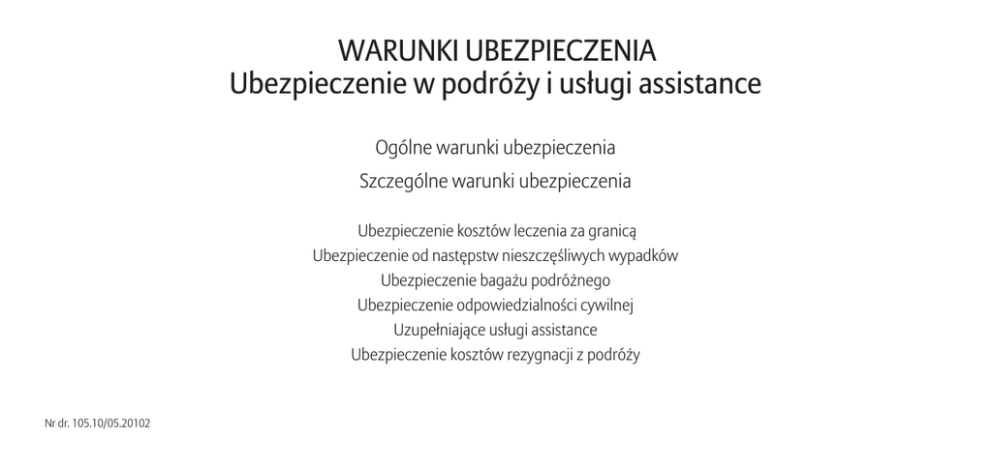 WARUNKI UBEZPIECZENIA Ubezpieczenie w podróży i usługi assistance Ogólne warunki ubezpieczenia Szczególne warunki ubezpieczenia Ubezpieczenie kosztów leczenia za granicą Ubezpieczenie od następstw nieszczęśliwych wypadków Ubezpieczenie bagażu podróżnego Ubezpieczenie odpowiedzialności cywilnej Uzupełniające usługi assistance Ubezpieczenie kosztów rezygnacji z podróży Nr dr. 105.10/05.20102 1 Spis treści strona Informacje dla osoby zainteresowanej ubezpieczeniem w podróży........................................................................................3 Warunki ubezpieczenia w podróży - postanowienia wstępne ..................................................................................................5 Rozdział I – Ogólne warunki ubezpieczenia ....................................................................................................................................6 Rozdział II – Szczególne warunki ubezpieczenia kosztów leczenia za granicą ...................................................................17 Rozdział III – Szczególne warunki ubezpieczenia od następstw nieszczęśliwych wypadków .........................................22 Rozdział IV – Szczególne warunki ubezpieczenia bagażu podróżnego ................................................................................26 Rozdział V – Szczególne warunki ubezpieczenia odpowiedzialności cywilnej ...................................................................29 Rozdział VI – Szczególne warunki ubezpieczenia w zakresie uzupełniających usług assistance .................................. 32 Rozdział VII – Szczególne warunki ubezpieczenia kosztów rezygnacji z podróży .............................................................34 2 INFORMACJE DLA OSOBY ZAINTERESOWANEJ UBEZPIECZENIEM W PODRÓŻY Język, w którym umowa może zostać zawarta Język czeski, o ile nie uzgodniono inaczej. Zgodnie z § 66 ustawy o umowie ubezpieczenia oraz o zmianie ustaw związanych, w aktualnie obowiązującym brzmieniu (Dz.U. Republiki Czeskiej nr 37/2004), Towarzystwo Ubezpieczeń Allianz pojišťovna, a. s. przekazuje Panu/Pani, jako osobie zainteresowanej zawarciem ubezpieczenia, następujące informacje zasadnicze: Prawo obowiązujące dla umowy ubezpieczenia oraz właściwość sądu Umowa ubezpieczenia w podróży podlega prawu Republiki Czeskiej (w dalszej części „RCz”). Sądami właściwymi do rozwiązywania sporów są sądy powszechne RCz. Nazwa handlowa i forma prawna ubezpieczyciela Allianz pojišťovna, a. s. [Towarzystwo Ubezpieczeń Allianz, SA], nr id. IČ 47 11 59 71, rejestr handlowy prowadzony przez Sąd Miejski w Pradze, dział B, za numerem 1815 Definicja ubezpieczenia w podróży Ubezpieczenie w podróży uregulowano w Warunkach ubezpieczenia w podróży (zwanymi w dalszej części „WUWP”), na które składają się Ogólne warunki ubezpieczenia (zwane w dalszej części „OWU”), Szczególne warunki ubezpieczenia, Uzupełniające warunki ubezpieczenia i inne uzgodnienia umowy ubezpieczenia. W Szczególnych warunkach ubezpieczenia (zwanych w dalszej części „SWU”) uregulowano poszczególne ryzyka ubezpieczeniowe, objęte ochroną ubezpieczeniową w ramach ubezpieczenia w podróży. Konkretne ubezpieczenie w podróży zostaje uzgodnione w umowie ubezpieczenia, której integralną częścią są WUWP. Ubezpieczenie w podróży z reguły obejmuje następujące ryzyka ubezpieczeniowe: ubezpieczenie kosztów leczenia za granicą, ubezpieczenie od następstw nieszczęśliwych wypadków, ubezpieczenie bagażu podróżnego, ubezpieczenie odpowiedzialności cywilnej oraz ubezpieczenie uzupełniających usług assistance. Ubezpieczenie kosztów rezygnacji z podróży można zawrzeć oddzielnie. Ubezpieczenia kosztów leczenia za granicą nie można zawrzeć do ubezpieczenia w podróży w Republice Czeskiej. Adres siedziby ubezpieczyciela ul. Ke Štvanici 656/3, Praha 8, kod poczt. 186 00, Republika Czeska Nazwa i siedziba organu nadzoru Česká národní banka [Czeski Bank Narodowy], ul. Na Příkopě 28, kod poczt. 115 03, Praha 1, tel.: 224 411 111, faks: 224 412 404, 224 413 708 Sposób załatwiania skarg Skargi ubezpieczających, ubezpieczonych oraz osób uprawnionych należy doręczać na adres siedziby ubezpieczyciela, są one załatwiane w formie pisemnej, o ile ubezpieczający, ubezpieczony, osoby uprawnione i ubezpieczyciel nie uzgodnią inaczej. Powyższym osobom przysługuje jednocześnie prawo zwrócenia się ze skargą do Czeskiego Banku Narodowego. Okres ważności umowy ubezpieczenia Ubezpieczenie uzgadnia się na okres ochrony ubezpieczeniowej wynoszący co najmniej 3 dni (minimalna składka ubezpieczeniowa) i co najwyżej jeden rok. Minimalna składka ubezpieczeniowa nie ma zastosowania w przypadku rocznych, półrocznych stawek składek ubezpieczeniowych oraz w przypadku objęcia ochroną ubezpieczeniową 3 lub więcej osób w jednej umowie ubezpieczenia, o ile w umowie ubezpieczenia nie uzgodniono inaczej. Umowa ubezpieczenia zostaje zawarta w momencie zapłacenia składki ubezpieczeniowej. Centrum pomocy ubezpieczyciela Kontrahent ubezpieczyciela, któremu zlecono świadczenie usług assistance w ramach ubezpieczenia w podróży i który jest dostępny 24 godziny na dobę, 7 dni w tygodniu. 3 Ochrona ubezpieczeniowa na terenie RCz rozpoczyna się w dniu uzgodnionym w umowie ubezpieczenia jako początek ubezpieczenia, jednak nie wcześniej niż w momencie rozpoczęcia podróży krajowej, i kończy się w momencie powrotu z objętej ochroną ubezpieczeniową podróży krajowej, jednak nie później niż w dniu uzgodnionym w umowie ubezpieczenia jako koniec ubezpieczenia. Ochrona ubezpieczeniowa w podróży zagranicznej rozpoczyna się w dniu uzgodnionym w umowie ubezpieczenia jako początek ubezpieczenia i kończy się z upływem dnia uzgodnionego jako koniec ubezpieczenia. Ochrona ubezpieczeniowa za granicę nie obej
