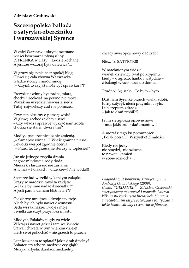 Zdzisław Grabowski Szczeropolska ballada o satyryku-zbereźniku i warszawskiej Syrence W całej Warszawie skrycie szeptane wieści koszmarne płyną ulicą: „SYRENKA w ciąży!!! Ludzie kochane! A jeszcze wczoraj była dziewicą”... W gruzy się sypie nasz spokój błogi. Głowi się cała zbożna Warszawka, władze stolicy i naród mnogi: „– Czyjaż to czyjaż może być sprawka???!” Prezydent winny być żadną miarą, choćby i zechciał, na pewno nie może. Wszak na urzędzie niewiasta siedzi!!! Tutaj największy cud nie pomoże... Czyn ten okrutny o pomstę woła! W głowę zachodzą obcy i swoi. – Czy władza sprawcę wykryć nam zdoła, chociaż się stara, dwoi i troi? Modły, pacierze nic już nie zmienią. „– Sama jest winna!!!” Wieść gminna niesie. Dewotki wespół zgodnie ocenią: „– Przez to, że grzesznie sterczy w toplesie?!” Już nie jednego znęciła drania – nagość młodości urody doda. Mieczyk i tarcza nic nie zasłania, A w nas – Polakach, wrze krew! Nie woda!!! Szemrze lud wszelki w każdym zakątku. Krąży w narodzie myśl ta zaklęta: „– Jakie by imię nadać dzieciątku?” A jeśli panna da nam bliźnięta!??? O dziatwę mniejsza – dwoje czy troje. Niech by ich było nawet dwunastu. Będą wszak nasze: Twoje i moje. I wielki zaszczyt przyniosą miastu! Młodych Polaków nigdy za wiele W kraju i nawet gdzieś tam we świecie. Sława i chwała w tym wielkim dziele! Herb swój pokochać – nie grzech to przecie. Lecz któż nam to spłatał? Jakiż drab dzielny? Bohater czy tchórz, mędrzec czy głąb? Muzyk, artysta, działacz niedzielny chcący swej opcji nowy dać zrąb? Nie... To SATYRYK!!! W natchnionym widzie wianek dziewicy rwał po kryjomu, kiedy – o zgrozo, hańbo i wstydzie – z balangi wracał nocą do domu... Trudno! Się stało! Co było – było... Dziś nam Syrenkę brzuch wielki zdobi. Jurny satyryk niech przymknie ryło, Lub szeptem zdradzi: – Jak to drań zrobił?!?! I nim się zgłoszą ojcowie nowi – mus jakiś order dać amantowi! A morał z tego ku potomności: „Polak potrafi!” Wszystko! Z miłości... Kiedy nie jęczy, nie smędzi, nie szlocha to nawet i kamień w sobie rozkocha… I nagroda w II Konkursie satyrycznym im. Andrzeja Gawrońskiego (2009). Godło: "GEDANEK” – Zdzisław Grabowski – emerytowany nauczyciel i prawnik. Laureat kilkunastu konkursów literackich. Uprawia z upodobaniem satyrę społeczną i polityczną, a także komediodramy i scenariusze filmowe.