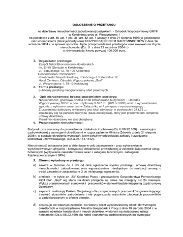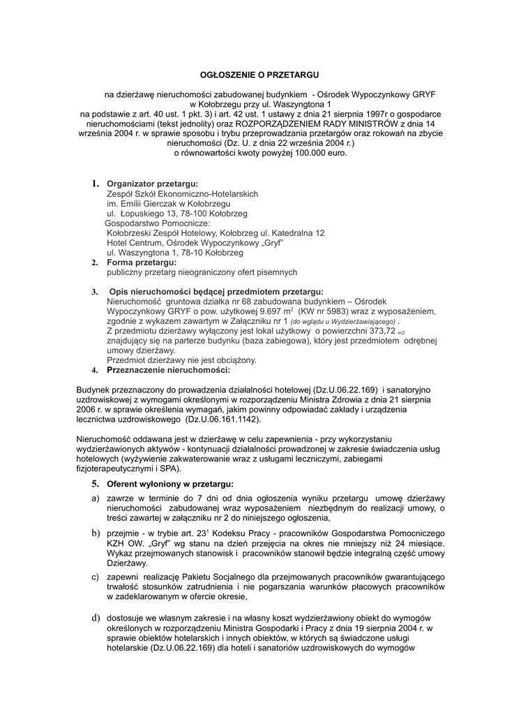 OGŁOSZENIE O PRZETARGU na dzierżawę nieruchomości zabudowanej budynkiem - Ośrodek Wypoczynkowy GRYF w Kołobrzegu przy ul. Waszyngtona 1 na podstawie z art. 40 ust. 1 pkt. 3) i art. 42 ust. 1 ustawy z dnia 21 sierpnia 1997r o gospodarce nieruchomościami (tekst jednolity) oraz ROZPORZĄDZENIEM RADY MINISTRÓW z dnia 14 września 2004 r. w sprawie sposobu i trybu przeprowadzania przetargów oraz rokowań na zbycie nieruchomości (Dz. U. z dnia 22 września 2004 r.) o równowartości kwoty powyżej 100.000 euro. 1. Organizator przetargu: Zespół Szkół Ekonomiczno-Hotelarskich im. Emilii Gierczak w Kołobrzegu ul. Łopuskiego 13, 78-100 Kołobrzeg Gospodarstwo Pomocnicze: Kołobrzeski Zespół Hotelowy, Kołobrzeg ul. Katedralna 12 Hotel Centrum, Ośrodek Wypoczynkowy „Gryf” ul. Waszyngtona 1, 78-10 Kołobrzeg 2. Forma przetargu: publiczny przetarg nieograniczony ofert pisemnych 3. 4. Opis nieruchomości będącej przedmiotem przetargu: Nieruchomość gruntowa działka nr 68 zabudowana budynkiem – Ośrodek Wypoczynkowy GRYF o pow. użytkowej 9.697 m2 (KW nr 5983) wraz z wyposażeniem, zgodnie z wykazem zawartym w Załączniku nr 1 (do wglądu u Wydzierżawiającego) . Z przedmiotu dzierżawy wyłączony jest lokal użytkowy o powierzchni 373,72 m2 znajdujący się na parterze budynku (baza zabiegowa), który jest przedmiotem odrębnej umowy dzierżawy. Przedmiot dzierżawy nie jest obciążony. Przeznaczenie nieruchomości: Budynek przeznaczony do prowadzenia działalności hotelowej (Dz.U.06.22.169) i sanatoryjno uzdrowiskowej z wymogami określonymi w rozporządzeniu Ministra Zdrowia z dnia 21 sierpnia 2006 r. w sprawie określenia wymagań, jakim powinny odpowiadać zakłady i urządzenia lecznictwa uzdrowiskowego (Dz.U.06.161.1142). Nieruchomość oddawana jest w dzierżawę w celu zapewnienia - przy wykorzystaniu wydzierżawionych aktywów - kontynuacji działalności prowadzonej w zakresie świadczenia usług hotelowych (wyżywienie zakwaterowanie wraz z usługami leczniczymi, zabiegami fizjoterapeutycznymi i SPA). 5. Oferent wyłoniony w przetargu: a) zawrze w terminie do 7 dni od dnia ogłoszenia wyniku przetargu umowę dzierżawy nieruchomości zabudowanej wraz wyposażeniem niezbędnym do realizacji umowy, o treści zawartej w załączniku nr 2 do niniejszego ogłoszenia, b) przejmie - w trybie art. 231 Kodeksu Pracy - pracowników Gospodarstwa Pomocniczego KZH OW. „Gryf” wg stanu na dzień przejęcia na okres nie mniejszy niż 24 miesiące. Wykaz przejmowanych stanowisk i pracowników stanowił będzie integralną część umowy Dzierżawy. c) zapewni realizację Pakietu Socjalnego dla przejmowanych pracowników gwarantującego trwałość stosunków zatrudnienia i nie pogarszania warunków płacowych pracowników w zadeklarowanym w ofercie okresie, d) dostosuje we własnym zakresie i na własny koszt wydzierżawiony obiekt do wymogów określonych w rozporządzeniu Ministra Gospodarki i Pracy z dnia 19 sierpnia 2004 r. w sprawie obiektów hotelarskich i innych obiektów, w których są świadczone usługi hotelarskie (Dz.U.06.22.169) dla hoteli i sanatoriów uzdrowiskowych do wymogów określonych w rozporządzeniu Ministra Zdrowia z dnia 21 sierpnia 2006 r. w sprawie określenia wymagań jakim powinny odpowiadać zakłady i urządzenia lecznictwa uzdrowiskowego (Dz.U.06.161.1142) w terminie do 3 lat od dnia podpisania umowy dzierżawy. e) na okres trwania umowy dzierżawy przejmie realizację zadań (wstąpi w prawa i obowiązki Wydzierżawiającego ) wynikających z umowy o świadczenie usług leczniczych, zabiegów leczniczych, fizjoterapeutycznych i SPA.. Zakres praw i obowiązków określonych w umowie, podlegających przejęciu zostanie protokolarnie ustalony na dzień ich przejęcia przez oferenta, które nastąpi w uzgodnionym terminie za zgodą Wykonawcy usług, f) na okres trwania umowy dzierżawy przejmie realizację zadań (wstąpi w prawa i obowiązki Wydzierżawiającego) wynikających z umów najmu lokali: 9 umów (do wglądu u Wydzierżawiającego) i przyjmie na praktyki nauki zawodu uczniów ZSEH. g) na okres trwania umowy dzierżawy wstąpi w prawa i obowiązki z podmiotami w odniesieniu do umów cywilno-prawnych dotyczących dostaw i usług dla potrzeb OW „Gryf” wg stanu dzień podpisania umowy z możliwością renegocjacji umów. 6. Termin i miejsce zapoznania się z dodatkowymi warunkami przetargu: Dodatkowe warunki dzierżawy, które nie podlegają ustaleniu w trybie przetargu zawiera projekt umowy dzierżawy, który stanowi Załącznik nr 2 do niniejszego ogłoszenia. Umowy zawarte na wynajem do wglądu w siedzibie przy ul. Łopuskiego 13 pok. 103 po uprzednim uzgodnieniu terminu z Panem Mariuszem Bremborowiczem adm.gosp. ZSEH tel.94 35 115 55 7. Termin w jakim można dokonać oględzin nieruchomości: W dni robocze od poniedziałku do piątku w godz.8.00 do 14.00, po uprzednim uzgodnieniu terminu z Panem Zenonem Kaczmarkiem adm/techn.-OW.”Gryf” tel.609 929 367 8. Okres dzierżawy: 15 lat 9. Wysokość opłat z tytułu dzierżawy: Zryczałtowaną miesięczną stawkę wywoławczą czynszu z tytułu dzierżawy nieruchomości wraz z wyposażeniem ustala się na kwotę netto 30.000,00 zł (słownie: trzydzieści tysięcy złotych ) + podatek VAT według obowiązującej stawki. Oprócz czynszu dzierżawca zobowiązany będzie do ponoszenia kosztów utrzymania nieruchomości (media, koszty eksploatacyjne, bieżące remonty). 10. Termin wnoszenia opłat: z dołu do 10- go dnia każdego miesiąca kalendarzowego. 11. Zasady aktualizacji opłat: za każdy następny rok waloryzacja w oparciu o wskaźnik wzrostu cen towarów i usług za rok ubiegły na podstawie obwieszczenia Prezesa GUS. 12. Wymagania, jakim powinna odpowiadać oferta: 1) Oferta powinna zawierać: a) imię, nazwisko i adres lub nazwę (firmę) i siedzibę oferenta; b) datę sporządzenia oferty; c) oferowaną wysokość czynszu; d) oferowany Pakiet socjalny dla przejmowanych