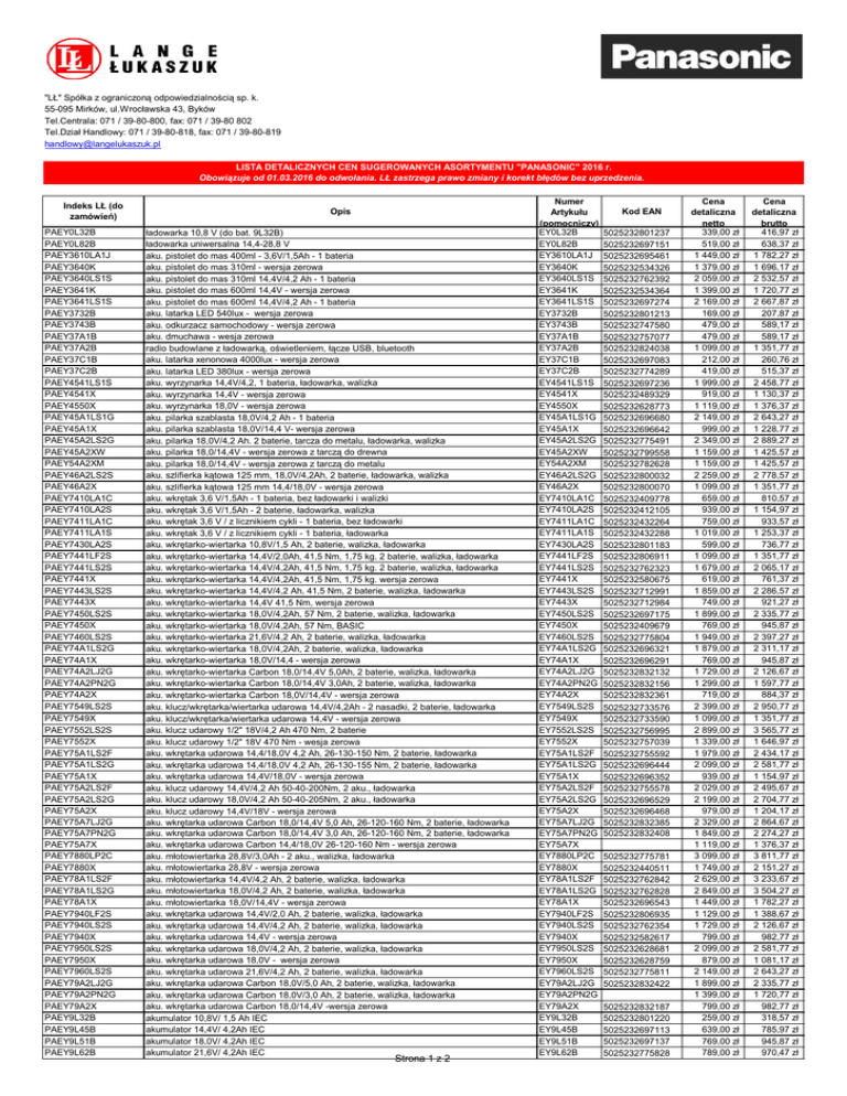 "LŁ" Spółka z ograniczoną odpowiedzialnością sp. k. 55-095 Mirków, ul.Wrocławska 43, Byków Tel.Centrala: 071 / 39-80-800, fax: 071 / 39-80 802 Tel.Dział Handlowy: 071 / 39-80-818, fax: 071 / 39-80-819 [email protected] LISTA DETALICZNYCH CEN SUGEROWANYCH ASORTYMENTU "PANASONIC" 2016 r. Obowiązuje od 01.03.2016 do odwołania. LŁ zastrzega prawo zmiany i korekt błędów bez uprzedzenia. Indeks LŁ (do zamówień) PAEY0L32B PAEY0L82B PAEY3610LA1J PAEY3640K PAEY3640LS1S PAEY3641K PAEY3641LS1S PAEY3732B PAEY3743B PAEY37A1B PAEY37A2B PAEY37C1B PAEY37C2B PAEY4541LS1S PAEY4541X PAEY4550X PAEY45A1LS1G PAEY45A1X PAEY45A2LS2G PAEY45A2XW PAEY54A2XM PAEY46A2LS2S PAEY46A2X PAEY7410LA1C PAEY7410LA2S PAEY7411LA1C PAEY7411LA1S PAEY7430LA2S PAEY7441LF2S PAEY7441LS2S PAEY7441X PAEY7443LS2S PAEY7443X PAEY7450LS2S PAEY7450X PAEY7460LS2S PAEY74A1LS2G PAEY74A1X PAEY74A2LJ2G PAEY74A2PN2G PAEY74A2X PAEY7549LS2S PAEY7549X PAEY7552LS2S PAEY7552X PAEY75A1LS2F PAEY75A1LS2G PAEY75A1X PAEY75A2LS2F PAEY75A2LS2G PAEY75A2X PAEY75A7LJ2G PAEY75A7PN2G PAEY75A7X PAEY7880LP2C PAEY7880X PAEY78A1LS2F PAEY78A1LS2G PAEY78A1X PAEY7940LF2S PAEY7940LS2S PAEY7940X PAEY7950LS2S PAEY7950X PAEY7960LS2S PAEY79A2LJ2G PAEY79A2PN2G PAEY79A2X PAEY9L32B PAEY9L45B PAEY9L51B PAEY9L62B Opis ładowarka 10,8 V (do bat. 9L32B) ładowarka uniwersalna 14,4-28,8 V aku. pistolet do mas 400ml - 3,6V/1,5Ah - 1 bateria aku. pistolet do mas 310ml - wersja zerowa aku. pistolet do mas 310ml 14,4V/4,2 Ah - 1 bateria aku. pistolet do mas 600ml 14,4V - wersja zerowa aku. pistolet do mas 600ml 14,4V/4,2 Ah - 1 bateria aku. latarka LED 540lux - wersja zerowa aku. odkurzacz samochodowy - wersja zerowa aku. dmuchawa - wesja zerowa radio budowlane z ładowarką, oświetleniem, łącze USB, bluetooth aku. latarka xenonowa 4000lux - wersja zerowa aku. latarka LED 380lux - wersja zerowa aku. wyrzynarka 14,4V/4,2, 1 bateria, ładowarka, walizka aku. wyrzynarka 14,4V - wersja zerowa aku. wyrzynarka 18,0V - wersja zerowa aku. pilarka szablasta 18,0V/4,2 Ah - 1 bateria aku. pilarka szablasta 18,0V/14,4 V- wersja zerowa aku. pilarka 18,0V/4,2 Ah. 2 baterie, tarcza do metalu, ładowarka, walizka aku. pilarka 18,0/14,4V - wersja zerowa z tarczą do drewna aku. pilarka 18,0/14,4V - wersja zerowa z tarczą do metalu aku. szlifierka kątowa 125 mm, 18,0V/4,2Ah, 2 baterie, ładowarka, walizka aku. szlifierka kątowa 125 mm 14,4/18,0V - wersja zerowa aku. wkrętak 3,6 V/1,5Ah - 1 bateria, bez ładowarki i walizki aku. wkrętak 3,6 V/1,5Ah - 2 baterie, ładowarka, walizka aku. wkrętak 3,6 V / z licznikiem cykli - 1 bateria, bez ładowarki aku. wkrętak 3,6 V / z licznikiem cykli - 1 bateria, ładowarka aku. wkrętarko-wiertarka 10,8V/1,5 Ah, 2 baterie, walizka, ładowarka aku. wkrętarko-wiertarka 14,4V/2,0Ah, 41,5 Nm, 1,75 kg. 2 baterie, walizka, ładowarka aku. wkrętarko-wiertarka 14,4V/4,2Ah, 41,5 Nm, 1,75 kg. 2 baterie, walizka, ładowarka aku. wkrętarko-wiertarka 14,4V/4,2Ah, 41,5 Nm, 1,75 kg. wersja zerowa aku. wkrętarko-wiertarka 14,4V/4,2 Ah, 41,5 Nm, 2 baterie, walizka, ładowarka aku. wkrętarko-wiertarka 14,4V 41,5 Nm, wersja zerowa aku. wkrętarko-wiertarka 18,0V/4,2Ah, 57 Nm, 2 baterie, walizka, ładowarka aku. wkrętarko-wiertarka 18,0V/4,2Ah, 57 Nm, BASIC aku. wkrętarko-wiertarka 21,6V/4,2 Ah, 2 baterie, walizka, ładowarka aku. wkrętarko-wiertarka 18,0V/4,2Ah, 2 baterie, walizka, ładowarka aku. wkrętarko-wiertarka 18,0V/14,4 - wersja zerowa aku. wkrętarko-wiertarka Carbon 18,0/14,4V 5,0Ah, 2 baterie, walizka, ładowarka aku. wkrętarko-wiertarka Carbon 18,0/14,4V 3,0Ah, 2 baterie, walizka, ładowarka aku. wkrętarko-wiertarka Carbon 18,0V/14,4V - wersja zerowa aku. klucz/wkrętarka/wiertarka udarowa 14,4V/4,2Ah - 2 nasadki, 2 baterie, ładowarka aku. klucz/wkrętarka/wiertarka udarowa 14,4V - wersja zerowa aku. klucz udarowy 1/2" 18V/4,2 Ah 470 Nm, 2 baterie aku. klucz udarowy 1/2" 18V 470 Nm - wesja zerowa aku. wkrętarka udarowa 14,4/18,0V 4,2 Ah, 26-130-150 Nm, 2 baterie, ładowarka aku. wkrętarka udarowa 14,4/18,0V 4,2 Ah, 26-130-155 Nm, 2 baterie, ładowarka aku. wkrętarka udarowa 14,4V/18,0V - wersja zerowa aku. klucz udarowy 14,4V/4,2 Ah 50-40-200Nm, 2 aku., ładowarka aku. klucz udarowy 18,0V/4,2 Ah 50-40-205Nm, 2 aku., ładowarka aku. klucz udarowy 14,4V/18V - wersja zerowa aku. wkrętarka udarowa Carbon 18,0/14,4V 5,0 Ah, 26-120-160 Nm, 2 baterie, ładowarka aku. wkrętarka udarowa Carbon 18,0/14,4V 3,0 Ah, 26-120-160 Nm, 2 baterie, ładowarka aku. wkrętarka udarowa Carbon 14,4/18,0V 26-120-160 Nm - wersja zerowa aku. młotowiertarka 28,8V/3,0Ah - 2 aku., walizka, ładowarka aku. młotowiertarka 28,8V - wersja zerowa aku. młotowiertarka 14,4V/4,2 Ah, 2 baterie, walizka, ładowarka aku. młotowiertarka 18,0V/4,2 Ah, 2 baterie, walizka, ładowarka aku. młotowiertarka 18,0V/14,4V - wersja zerowa aku. wkrętarka udarowa 14,4V/2,0 Ah, 2 baterie, walizka, ładowarka aku. wkrętarka udarowa 14,4V/4,2 Ah, 2 baterie, walizka, ładowarka aku. wkrętarka udarowa 14,4V - wersja zerowa aku. wkrętarka udarowa 18,0V/4,2 Ah, 2 baterie, walizka, ładowarka aku. wkrętarka udarowa 18,0V - wersja zerowa aku. wkrętarka udarowa 21,6V/4,2 Ah, 2 baterie, walizka, ładowarka aku. wkrętarka udarowa Carbon 18,0V/5,0 Ah, 2 baterie, walizka, ładowarka aku. wkrętarka udarowa Carbon 18,0V/3,0 Ah, 2 baterie, walizka, ładowarka aku. wkrętarka udarowa Carbon 18,0/14,4V -wersja zerowa akumulator 10,8V/ 1,5 Ah IEC akumulator 14,4V/ 4,2Ah IEC akumulator 18,0V/ 4,2Ah IEC akumulator 21,6V/ 4,2Ah IEC Strona 1 z 2 Numer Artykułu (pomocniczy) EY0L32B EY0L82B EY3610LA1J EY3640K EY3640LS1S EY3641K EY3641LS1S EY3732B EY3743B EY37A1B EY37A2B EY37C1B EY37C2B EY4541LS1S EY4541X EY4550X EY45A1LS1G EY45A1X EY45A2LS2G EY45A2XW EY54A2XM EY46A2LS2G EY46A2X EY7410LA1C EY7410LA2S EY7411LA1C EY7411LA1S EY7430LA2S EY7441LF2S EY7441LS2S EY7441X EY7443LS2S EY7443X EY7450LS2S EY7450X EY7460LS2S EY74A1LS2G EY74A1X EY74A2LJ2G EY74A2PN2G EY74A2X EY7549LS2S EY7549X EY7552LS2S EY7552X