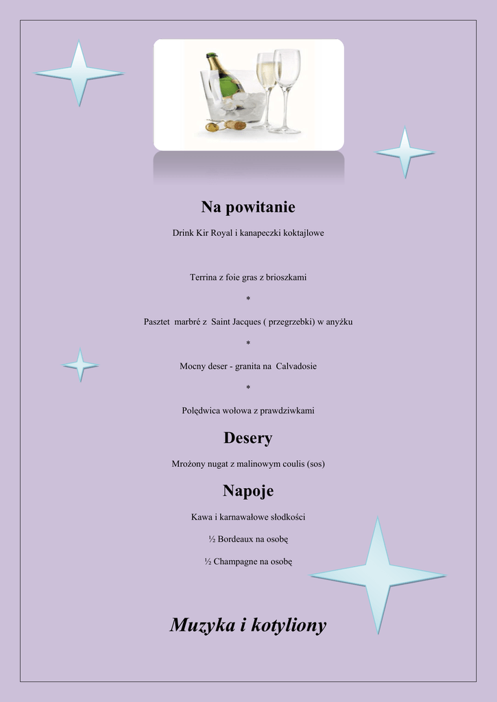 Na powitanie Drink Kir Royal i kanapeczki koktajlowe Terrina z foie gras z brioszkami * Pasztet marbré z Saint Jacques ( przegrzebki) w anyżku * Mocny deser - granita na Calvadosie * Polędwica wołowa z prawdziwkami Desery Mrożony nugat z malinowym coulis (sos) Napoje Kawa i karnawałowe słodkości ½ Bordeaux na osobę ½ Champagne na osobę Muzyka i kotyliony