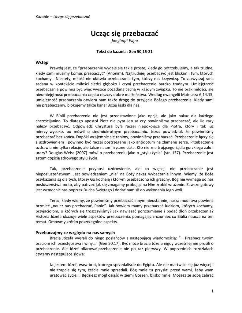 Kazanie – Ucząc się przebaczać Ucząc się przebaczać Tekst do kazania: Gen 50,15-21 Wstęp Prawdą jest, że “przebaczenie wydaje się takie proste, kiedy go potrzebujemy, a tak trudne, kiedy sami musimy komuś przebaczyć” (Anonim). Najtrudniej przebaczyć jest bliskim i tym, których kochamy. Niestety, miłość nie ułatwia przebaczania tym, którzy nas krzywdzą. To zazwyczaj rana zadana w kontekście miłości siedzi głęboko i czyni przebaczenie bardzo trudnym. Umiejętność przebaczania powinna być więc wysoce pożądaną cechą w każdym związku. To nie brak miłości, ale nieumiejętność przebaczania często niszczy dobre małżeństwa. Według ewangelii Mateusza 6,14.15, umiejętność przebaczania otwiera nam także drogę do przyjęcia Bożego przebaczenia. Kiedy sami nie przebaczamy, blokujemy także kanał Bożej łaski dla nas. W Biblii przebaczenie nie jest przedstawione jako opcja, ale jako nakaz dla każdego chrześcijanina. To dlatego apostoł Piotr nie pyta Jezusa czy powinniśmy przebaczać, ale ile razy należy przebaczyć. Odpowiedź Chrystusa była raczej niepokojąca dla Piotra, który i tak już mierzył wysoko, bo mówił o siedmiokrotnym przebaczaniu. Jezus powiedział, że powinniśmy przebaczać bez końca. Dopóki wzajemnie się ranimy, powinniśmy przebaczać. Przebaczenie łączy się z uzdrowieniem i powinno być raczej postrzegane jako antidotum na złamane serce. Przebaczenie uzdrawia nie tylko relacje, ale także nasze fizyczne ciała. Kto nie zna trującego żądła gorzkiego żalu i urazy? Douglas Weiss (2007) mówi o przebaczeniu jako o „stylu życia” (str. 157). Przebaczenie jest zatem częścią zdrowego stylu życia. Tak, przebaczenie przynosi uzdrowienie, ale co więcej, nie przebaczanie jest nieposłuszeństwem. Jest powiedzeniem „nie” na Boży nakaz wybaczania innym. Wiemy, że Boże przykazania są dla tych, którzy Go kochają i którym przebaczono ich grzechy. Bóg nie wymaga od nas posłuszeństwa po to, aby patrzeć jak się zmagamy próbując na Nim zrobić wrażenie. Zawsze gotowy jest wzmocnić nas poprzez Ducha Świętego i dodać nam sił do wykonania Jego woli. Teraz, kiedy wiemy, że powinniśmy przebaczać innym nieustannie, nasza modlitwa powinna brzmieć „naucz nas przebaczać, Panie”. Jak bowiem mamy przebaczać ludziom, których kochamy, przyjaciołom, o których się troszczyliśmy? Jak nawiązać porozumienie i podać dłoń przebaczenia? Historia Józefa ukazuje wiele aspektów przebaczenia, pomagając zrozumieć co Biblia naucza na ten temat. Omówmy krótko poszczególne aspekty. Przebaczajmy ze względu na nas samych Bracia Józefa wysłali do niego posłańców z następującą wiadomością: “… Przebacz twoim braciom ich przestępstwa i winy…” (Gen 50,17). Być może bracia Józefa nigdy wcześniej nie prosili o przebaczenie. Ale Józef ofiarował przebaczenie nie po raz pierwszy. W poprzednich rozdziałach czytamy następujące słowa: Ja jestem Józef, wasz brat, którego sprzedaliście do Egiptu. Ale nie martwcie się już więcej i nie trapcie się tym, żeście mnie sprzedali. Bóg mnie tu przysłał przed wami, żeby wam uratować życie.… Będziesz mógł osiąść w ziemi Goszen, blisko mnie. Możesz ze sobą zabrać 1 Kazanie – Ucząc się przebaczać swoich synów razem z ich dziećmi… Tam [w ziemi Goszen] będę miał pieczę nad tobą… (Gen 45,4-11). Mimo, iż słowo „przebaczenie” nie zostało tutaj użyte, Józef z własnej inicjatywy podjął kroki, by przebaczyć braciom. Nie zrobił tego w słabości, czy ze strachu przed braćmi. Pamiętajmy, że Józef był drugim najważniejszym człowiekiem w Egipcie. Wystarczyło, żeby powiedział słowo, a jego bracia zostaliby uśmierceni lub zamknięci w więzieniu. Bracia Józefa byli zaszokowani nie tylko tym, że Józef nadal żyje, ale bali się także o swoje życie wiedząc, jaką krzywdę mu wyrządzili. Przyjazny gest wobec nich został przyjęty z wahaniem i niepewnością. Byli tak zaskoczeni, że nie wydobyli z siebie nawet słowa podziękowania. W Gen 50,15 czytamy, że bracia Józefa zastanawiali się, czy Józef nie udaje przebaczenia ze względu na ojca. Teraz, kiedy Jakub umarł, spodziewali się otrzymać słuszną karę za zło, jakie wyrządzili Józefowi. Jasne jest jednak, że uprzednia dobroć Józefa nie była formą dyplomacji, a prawdziwym przebaczeniem. Nie czekał, aż bracia ukorzą się i przyjdą prosić o łaskę, ale sam pierwszy wyciągnął dłoń oferując przyjaźń i pojednanie. Józef wybaczył braciom przede wszystkim ze względu na siebie. Jego czyn nie był zainicjowany wyznaniem winy, czy błagalnymi prośbami. On po prostu ofiarował przebaczenie. To, ile razy płakał, jest dowodem na to, że wybaczył z własnej woli, dla uzdrowienia samego siebie i pokoju umysłu. Uczynił to będąc posłusznym Bogu. Trzymanie urazy wobec braci, podczas gdy Bóg tyle dla niego uczynił, byłoby oznaką niewdzięczności. Jeżeli przebaczanie jest stylem życia osoby pokrzywdzonej, o czym mówiliśmy wcześniej, to winowajca nie musi na nie zasłużyć. Nie nakazano nam przebaczać tym, którzy proszą o wybaczenie. Nie jest to warunek konieczny do wybaczenia. Mamy przebaczać, ponieważ zostaliśmy zranieni, a nie dlatego, że zostaliśmy poproszeni o wybaczenie. Przebaczanie to postawa, jaką prezentujemy wobec tych, którzy nas krzywdzą, a nie zaledwie odpowiedź na prośbę. Z zasady powinniśmy wybaczać nawet wtedy, gdy winowajca nigdy o to nie poprosi, czy nawet nie uzna swojej winy. Przebaczenie jest nie tyle dla krzywdziciela, który może nawet nie wykazać skruchy, ale dla pokrzywdzonego. Uwalnia nas i zapobiega kolejnej ranie, jaką jest rozgoryczenie. Kiedy przebaczamy, decydujemy, że nie chcemy być rozżaleni, ponieważ gorycz to ból, jaki zadajemy sami sobie. Przebaczenie ogranicza ból i sprawia, że nie rozprzestrzenia się on jak komórki rakowe, zatruwające 