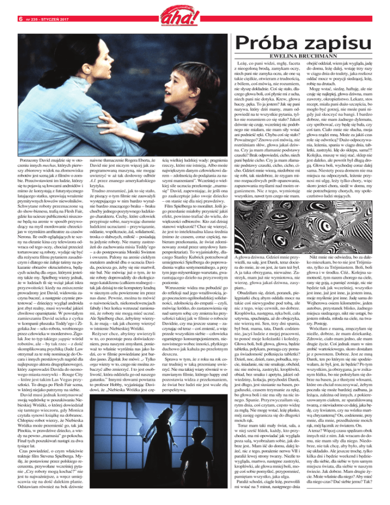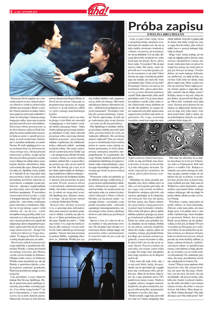 6 nr 235 - STYCZEŃ 2017 Próba zapisu EWELINA BRUCHMANN Porzucony David znajdzie się w otoczeniu innych mechas, których pierwszy zbiorowy widok na złomowisku robotów jest sceną jak z filmów o zombie. Przeciwstawieni im ludzie, którzy się tu pojawią są łowcami androidów i mimo że korzystają z futurystycznego latającego statku, sprawiają wrażenie prymitywnych łowców niewolników. Schwytane roboty przeznaczone są do show-biznesu, trafią na Flesh Fair, gdzie ku uciesze publiczności niszczone będą na arenie w sposób przywodzący na myśl mordowanie chrześcijan w rzymskim amfiteatrze za czasów Nerona. Ile osób oglądających te sceny na ekranie kina czy telewizora odwraca od tego oczy, chociaż przecież torturowane są roboty, wydaje się być dla reżysera filmu pytaniem zasadniczym i dlatego nie żałuje taśmy na pokazanie obrazów okrucieństwa, będących uciechą dla orgas, którymi jesteśmy także my. Spielberg wierzy jednak, że w ludziach tli się wciąż jakaś iskra przyzwoitości: kiedy na zniszczenie prowadzony jest David, widownia zaczyna buczeć, a następnie czynnie protestować – dziecięcy wygląd androida jest zbyt realny, musi wywołać jakieś chwilowe opamiętanie. W powstałym zamieszaniu David ucieka z cyrku w kompanii pluszaka Teddy’ego i Żigolaka Joe – seks-robota, wrobionego przez człowieka w morderstwo. Żigolak Joe to typ takiego yappie wśród robotów, ale – by tak rzec – z dość skomplikowaną psychiką (Jude Law otrzymał za te rolę nominację do Oscara i innych prestiżowych nagród dla najlepszego aktora drugoplanowego), który zaprowadzi Davida do neonowego miasta rozrywki – Rouge City – które jest takim Las Vegas przyszłości. To druga po Flesh Fair scena, w której niejako patrzymy na siebie. David musi jednak kontynuować swoją wędrówkę w poszukiwaniu Niebieskiej Wróżki, o której dowiedział się tamtego wieczoru, gdy Monica czytała synowi książkę na dobranoc. Chłopiec-robot wierzy, że Niebieska Wróżka może przemienić go, tak jak Pinokia, w prawdziwe dziecko, a wtedy na pewno „mamusia” go pokocha. Finał tych poszukiwań nastąpi za dwa tysiące lat. Czas powiedzieć, o czym właściwie traktuje film Stevena Spielberga. Myślę, że postawione przez polskiego recenzenta, przywołane wcześniej pytanie „Czy roboty mogą kochać?” nie jest tu najważniejsze, a wręcz umiejscawia się na dość dalekim planie. Odstawiam również na bok dziwnie naiwne tłumaczenie Rogera Eberta, że David nie jest niczym więcej jak zaprogramowaną maszyną, nie mogąc uwierzyć w aż tak dosłowny odbiór A.I. przez znanego amerykańskiego krytyka. Trudno zrozumieć, jak to się stało, że piszący o tym filmie nie zauważyli występującego w nim bardzo wyraźnie bardzo znaczącego braku – braku choćby jednego pozytywnego ludzkiego charakteru. Cechy, które człowiek przypisuje sobie, nazywając dumnie ludzkimi uczuciami – przywiązanie, oddanie, współczucie, żal, solidarność, troska o słabszych, miłość – posiadają tu jedynie roboty. Nie mamy zastrzeżeń do zachowania misia Teddy’ego – a do postepowania Moniki Swinton i owszem. Palony na arenie ciekłym metalem android dba o uczucia Davida, pociesza go, żeby się nie martwił, nie bał. Nie mówiąc już o tym, że to nie roboty doprowadziły do ekologicznego kataklizmu (całkiem realnego) – tak jak dzisiaj to nie komputery kradną w niecnym celu powierzone im przez nas dane. Pewnie, można tu mówić o naiwnościach, niekonsekwencjach fabuły i bez końca wzruszać ramionami, że roboty nie mogą mieć uczuć. Ale Spielberg chce, żebyśmy wierzyli, że mają – tak jak chcemy wierzyć w istnienie Niebieskiej Wróżki. Reżyser chce, abyśmy uwierzyli w to, co pozostaje poza doświadczeniem, poza naszymi zmysłami, ponieważ to właśnie wyróżnia nas jako ludzi, co w filmie powiedziane jest bardzo jasno. Żigolak Joe mówi: „- Tylko orga wierzy w to, czego nie można zobaczyć albo zmierzyć. I to jest osobliwość, która oddziela go od naszego gatunku.” Innymi słowami powtarza to profesor Hobby, wyjaśniając Davidowi, że „Niebieska Wróżka jest czę- ścią wielkiej ludzkiej wady: pragnienia rzeczy, które nie istnieją. Albo może największym danym człowiekowi darem – zdolnością do podążania za naszymi marzeniami”. Wcześniej o wielkiej sile uczucia przekonuje „mamusię” David, zapewniając, że jeśli ona go zaakceptuje jako swoje dziecko – on stanie się dla niej prawdziwy. Film Spielberga to moralitet. Jeśli jego przesłanie miałoby przynieść jakiś efekt, powinno trafiać do wielu, do większości odbiorców. Kto zaś dzisiaj stanowi większość? Chce się wierzyć, że jest to intelektualna klasa średnia (mimo że czasem, coraz częściej, nabieram przekonania, że świat zdominowany został przez umysłowy lumpenproletariat). To wyjaśniałoby, dlaczego Stanley Kubrick potrzebował umiejętności Spielberga do poprowadzenia wątku sentymentalnego, a przy tym jego reżyserskiego warsztatu, gwarantującego dzieło na przyzwoitym poziomie. Wzruszenie widza ma pobudzić go do refleksji nad jego wrażliwością, jego poczuciem ogólnoludzkiej solidarności, zdolnością do empatii – czyli, mówiąc krótko, do zastanowienia się nad samym sobą: czy zmierza ku przyszłości takiej jak w filmie o robocie Davidzie, czy ma jeszcze szansę – zaczynając od teraz – coś zmienić, a więc przede wszystkim siebie – człowieka ogarniętego konsumpcjonizmem, nienawistnego wobec inności, płytkiego duchowo jak kałuża po przelotnym deszczu. Sprawa w tym, że z roku na rok coraz trudniej w taką przemianę uwierzyć. Nie ma takiej wiary również w omawianym filmie, którego happy end pozostawia widza z przekonaniem, że świat bez ludzi nie jest wcale złą perspektywą. Leżę, co pani widzi, mg³ę, faceta z nieogolon¹ brod¹, zamykam oczy, niech pani nie zamyka oczu, ale one są 