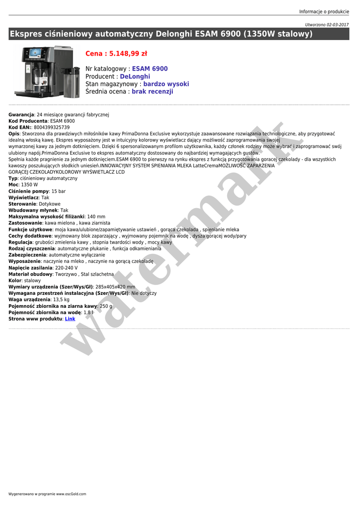 Informacje o produkcie Utworzono 02-03-2017 Ekspres ciśnieniowy automatyczny Delonghi ESAM 6900 (1350W stalowy) Cena : 5.148,99 zł Nr katalogowy : ESAM 6900 Producent : DeLonghi Stan magazynowy : bardzo wysoki Średnia ocena : brak recenzji w at er m ar k Gwarancja: 24 miesiące gwarancji fabrycznej Kod Producenta: ESAM 6900 Kod EAN:: 8004399325739 Opis: Stworzona dla prawdziwych miłośników kawy PrimaDonna Exclusive wykorzystuje zaawansowane rozwiązania technologiczne, aby przygotować idealną włoską kawę. Ekspres wyposażony jest w intuicyjny kolorowy wyświetlacz dający możliwość zaprogramowania swojej wymarzonej kawy za jednym dotknięciem. Dzięki 6 spersonalizowanym profilom użytkownika, każdy członek rodziny może wybrać i zaprogramować swój ulubiony napój.PrimaDonna Exclusive to ekspres automatyczny dostosowany do najbardziej wymagających gustów. Spełnia każde pragnienie za jednym dotknięciem.ESAM 6900 to pierwszy na rynku ekspres z funkcją przygotowania goracej czekolady - dla wszystkich kawoszy poszukujących słodkich uniesień.INNOWACYJNY SYSTEM SPIENIANIA MLEKA LatteCremaMOŻLIWOŚĆ ZAPARZENIA GORĄCEJ CZEKOLADYKOLOROWY WYŚWIETLACZ LCD Typ: ciśnieniowy automatyczny Moc: 1350 W Ciśnienie pompy: 15 bar Wyświetlacz: Tak Sterowanie: Dotykowe Wbudowany młynek: Tak Maksymalna wysokość filiżanki: 140 mm Zastosowanie: kawa mielona , kawa ziarnista Funkcje użytkowe: moja kawa/ulubione/zapamiętywanie ustawień , gorąca czekolada , spienianie mleka Cechy dodatkowe: wyjmowany blok zaparzający , wyjmowany pojemnik na wodę , dysza gorącej wody/pary Regulacja: grubości zmielenia kawy , stopnia twardości wody , mocy kawy Rodzaj czyszczenia: automatyczne płukanie , funkcja odkamieniania Zabezpieczenia: automatyczne wyłączanie Wyposażenie: naczynie na mleko , naczynie na gorącą czekoladę Napięcie zasilania: 220-240 V Materiał obudowy: Tworzywo , Stal szlachetna Kolor: stalowy Wymiary urządzenia (Szer/Wys/Gł): 285x405x420 mm Wymagana przestrzeń instalacyjna (Szer/Wys/Gł): Nie dotyczy Waga urządzenia: 13,5 kg Pojemność zbiornika na ziarna kawy: 250 g Pojemność zbiornika na wodę: 1,8 l Strona www produktu: Link Wygenerowano w programie www.oscGold.com