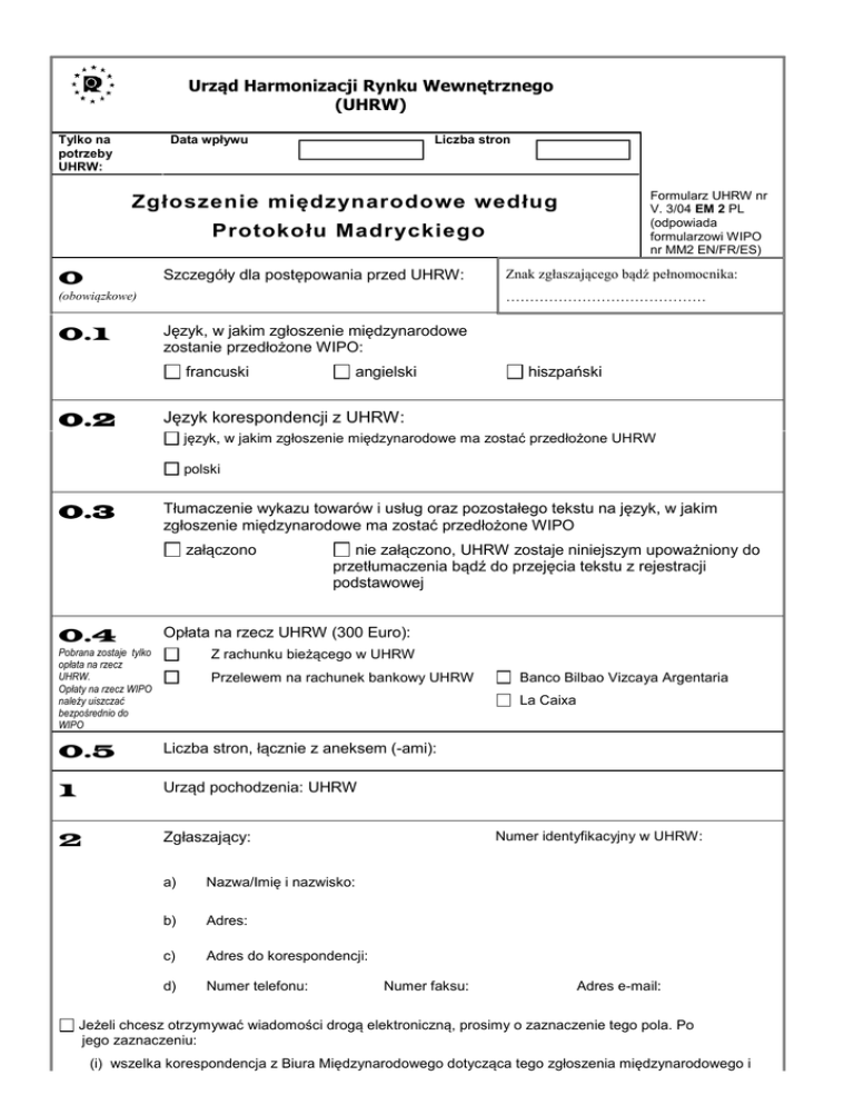 – Urząd Harmonizacji Rynku Wewnętrznego (UHRW) Data wpływu Tylko na potrzeby UHRW: Liczba stron Zgłoszenie międzynarodowe według Formularz UHRW nr V. 3/04 EM 2 PL (odpowiada formularzowi WIPO nr MM2 EN/FR/ES) Protokołu Madryckiego Szczegóły dla postępowania przed UHRW: 0 (obowiązkowe) 0.1 …………………………………… Język, w jakim zgłoszenie międzynarodowe zostanie przedłożone WIPO: francuski 0.2 Znak zgłaszającego bądź pełnomocnika: angielski hiszpański Język korespondencji z UHRW: język, w jakim zgłoszenie międzynarodowe ma zostać przedłożone UHRW polski 0.3 Tłumaczenie wykazu towarów i usług oraz pozostałego tekstu na język, w jakim zgłoszenie międzynarodowe ma zostać przedłożone WIPO załączono 0.4 nie załączono, UHRW zostaje niniejszym upoważniony do przetłumaczenia bądź do przejęcia tekstu z rejestracji podstawowej Opłata na rzecz UHRW (300 Euro): Pobrana zostaje tylko opłata na rzecz UHRW. Opłaty na rzecz WIPO należy uiszczać bezpośrednio do WIPO Z rachunku bieżącego w UHRW Przelewem na rachunek bankowy UHRW Banco Bilbao Vizcaya Argentaria La Caixa 0.5 Liczba stron, łącznie z aneksem (-ami): 1 Urząd pochodzenia: UHRW 2 Zgłaszający: a) Nazwa/Imię i nazwisko: b) Adres: c) Adres do korespondencji: d) Numer telefonu: Numer identyfikacyjny w UHRW: Numer faksu: Adres e-mail: Jeżeli chcesz otrzymywać wiadomości drogą elektroniczną, prosimy o zaznaczenie tego pola. Po jego zaznaczeniu: (i) wszelka korespondencja z Biura Międzynarodowego dotycząca tego zgłoszenia międzynarodowego i wynikającej z niego rejestracji międzynarodowej będzie od tej pory przesyłana wyłącznie drogą elektroniczną; i w związku z tym (ii) wszelka korespondencja z Biura Międzynarodowego dotycząca innych zgłoszeń międzynarodowych lub rejestracji międzynarodowych, dla których podano ten sam adres e-mail, będzie od tej pory przesyłana wyłącznie drogą elektroniczną. Prosimy pamiętać, że w przypadku wyboru komunikacji elektronicznej można zarejestrować tylko jeden adres email na każde zgłoszenie międzynarodowe. e) Język korespondencji z WIPO: angielski f) francuski hiszpański Inne dane (wymagane przez wyznaczone Strony) i) W przypadku, gdy zgłaszający jest osobą fizyczną: narodowość zgłaszającego: ii) W przypadku, gdy zgłaszający jest osobą prawną, - status prawny osoby prawnej: - państwo (bądź, w danym przypadku, obszar administracyjny wewnątrz państwa) którego prawu podlega osoba prawna: Podstawa prawna do złożenia wniosku: 3 a) Zgłaszający jest obywatelem jednego z państw członkowskich Wspólnoty Europejskiej, a mianowicie: b) Zgłaszający ma: stałe miejsce zamieszkania lub siedzibę i) ii) 4a rzeczywiste i działające przedsiębiorstwo przemysłowe lub handlowe w państwie członkowskim WE Adres (o ile różni się od adresu podanego w pkt 2 b)): …………………………………………………………………………. …………………………………………………………………………. Pełnomocnik wyznaczony do reprezentacji przed WIPO: Nazwa/Imię i nazwisko: Adres: Numer telefonu: Numer faksu: Adres e-mail: Jeżeli chcesz otrzymywać wiadomości drogą elektroniczną, prosimy o zaznaczenie tego pola. Po jego zaznaczeniu: (i) wszelka korespondencja z Biura Międzynarodowego dotycząca tego zgłoszenia międzynarodowego i wynikającej z niego rejestracji międzynarodowej będzie od tej pory przesyłana wyłącznie drogą elektroniczną; i w związku z tym (ii) wszelka korespondencja z Biura Międzynarodowego dotycząca innych zgłoszeń międzynarodowych lub rejestracji międzynarodowych, dla których podano ten sam adres e-mail, będzie od tej pory przesyłana wyłącznie drogą elektroniczną. Prosimy pamiętać, że w przypadku wyboru komunikacji elektronicznej można zarejestrować tylko jeden adres e-mail na każde zgłoszenie międzynarodowe. 4b Pełnomocnik wyznaczony do reprezentacji przed UHRW: uprzednio wskazany w zgłoszeniu podstawowym/rejestracji podstawowej: nowo wyznaczony: Nazwa/Imię i nazwisko: Numer identyfikacyjny w UHRW: Adres: 5 Zgłoszenie podstawowe lub rejestracja podstawowa: Zgłoszenie międzynarodowe sporządzono na podstawie zgłoszenia podstawowego: Numer: Data dokonania zgłoszenia: (DD/MM/RRRR) rejestracji podstawowej: Numer: Data rejestracji: (DD/MM/RRRR) zarejestrowanego wspólnotowego znaku towarowego w rozumieniu rejestracji podstawowej, w chwili rejestracji zgłoszenia wspólnotowego znaku towarowego (art. 146 ust. 2 RWZT): Numer zgłoszenia wspólnotowego znaku towarowego: (Data rejestracji wspólnotowego znaku towarowego: 6 zostanie dodana przez UHRW) Zastrzegane pierwszeństwo: Zgłaszający zastrzega pierwszeństwo z następującego wcześniejszego zgłoszenia: Urząd, w którym dokonano poprzedniego zgłoszenia: Numer poprzedniego zgłoszenia (jeśli jest dostępny) Data poprzedniego zgłoszenia: (DD/MM/RRRR) W przypadku, gdy zgłaszający zastrzega pierwszeństwo tylko w stosunku do niektórych towarów i usług podanych w pozycji nr 10, należy poniżej podać towary i usługi, których dotyczy zastrzegane pierwszeństwo: 7 Przedstawienie znaku: a) Przedstawienie znaku: Tylko dla znaku słownego Znak winien zostać przedstawiony w sposób, w jakim został przedstawiony w zgłoszeniu podstawowym/rejestracji podstawowej c) Zgłaszający pragnie, aby znak był rozpatrywany jako znak pisany czcionką standardową d) Znak składa się z koloru bądź kombinacji kolorów per se 8 Wskazanie kolorów: Zgłaszający zastrzega następujący/e kolor/y jako cechę odróżniającą znaku: a) b) Wskazanie głównych elementów znaku w podanym/ych kolorze/ach: 9 Inne informacje a): pisownia łacińska a) Transliteracja: b): nieobowiązkowe b) Tłumaczenie znaku na język: c)nieobowiązkowe c) d) Tłumaczenie znaku nie jest możliwe d): tak jak w zgłoszeniu podstawowym /rejestracji podstawowe) angielski francuski his