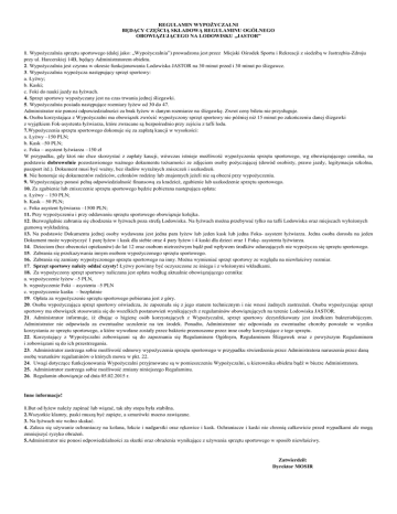 REGULAMIN WYPOŻYCZALNI BĘDĄCY CZĘŚCIĄ SKŁADOWĄ REGULAMINU OGÓLNEGO OBOWIĄZUJĄCEGO NA LODOWISKU „JASTOR” 1. Wypożyczalnia sprzętu sportowego (dalej jako: „Wypożyczalnia”) prowadzona jest przez Miejski Ośrodek Sportu i Rekreacji z siedzibą w Jastrzębiu-Zdroju przy ul. Harcerskiej 14B, będący Administratorem obiektu. 2. Wypożyczalnia jest czynna w okresie funkcjonowania Lodowiska JASTOR na 30 minut przed i 30 minut po ślizgawce. 3. Wypożyczalnia wypożycza następujący sprzęt sportowy: a. Łyżwy; b. Kaski; c. Foki do nauki jazdy na łyżwach. 4. Sprzęt sportowy wypożyczany jest na czas trwania jednej ślizgawki. 5. Wypożyczalnia posiada następujące rozmiary łyżew od 30 do 47. Administrator nie ponosi odpowiedzialności za brak łyżew w danym rozmiarze na ślizgawkę. Zwrot ceny biletu nie przysługuje. 6. Osoba korzystająca z Wypożyczalni ma obowiązek zwrócić wypożyczony sprzęt sportowy nie później niż 15 minut po zakończeniu danej ślizgawki z wyjątkiem Fok-asystenta łyżwiarza, które zwracane są bezpośrednio przy zejściu z tafli lodu. 7.Wypożyczenia sprzętu sportowego dokonuje się za zapłatą kaucji w wysokości: a. Łyżwy –150 PLN; b. Kask –50 PLN; c. Foka – asystent łyżwiarza –150 zł W przypadku, gdy ktoś nie chce skorzystać z zapłaty kaucji, wówczas istnieje możliwość wypożyczenia sprzętu sportowego, wg obowiązującego cennika, na podstawie dobrowolnie pozostawionego ważnego dokumentu tożsamości ze zdjęciem osoby pożyczającej (dowód osobisty, prawo jazdy, legitymacja szkolna, paszport itd.). Dokument musi być ważny, bez śladów wyraźnych zniszczeń i uszkodzeń. 8. Nie honoruje się dokumentów rodziców, członków rodziny lub znajomych jeżeli nie są obecni przy wypożyczeniu. 9. Wypożyczający ponosi pełną odpowiedzialność finansową za kradzież, zgubienie lub uszkodzenie sprzętu sportowego. 10. Za zgubienie lub zniszczenie sprzętu sportowego będzie pobierana następująca opłata: a. Łyżwy – 150 PLN; b. Kask – 50 PLN; c. Foka asystent łyżwiarza –1500 PLN; 11. Przy wypożyczeniu i przy oddawaniu sprzętu sportowego obowiązuje kolejka. 12. Bezwzględnie zabrania się chodzenia w łyżwach poza strefą Lodowiska. Na łyżwach można przebywać tylko na tafli Lodowiska oraz miejscach wyłożonych gumową wykładziną. 13. Na podstawie Dokumentu jednej osoby wydawana jest jedna para łyżew lub jeden kask lub jedna Foka- asystent łyżwiarza. Jedna osoba dorosła na jeden Dokument może wypożyczyć 1 parę łyżew i kask dla siebie oraz 4 pary łyżew i 4 kaski dla dzieci oraz 1 Fokę- asystenta łyżwiarza. 14. Dzieciom (bez obecności opiekunów) do lat 12 oraz osobom nietrzeźwym bądź pod wpływem środków odurzających nie wypożycza się sprzętu sportowego. 15. Zabrania się przekazywania innym osobom wypożyczonego sprzętu sportowego. 16. Zabrania się zamiany wypożyczonego sprzętu sportowego na inny. Można wymieniać sprzęt sportowy ze względu na niewłaściwy rozmiar. 17. Sprzęt sportowy należy oddać czysty! Łyżwy powinny być oczyszczone ze śniegu i z włożonymi wkładkami. 18. Za wypożyczony sprzęt sportowy naliczana jest opłata według aktualnie obowiązującego cennika: a. wypożyczenie łyżew –5 PLN, b. wypożyczenie Foki – asystenta –5 PLN c. wypożyczenie kasku – bezpłatnie 19. Opłata za wypożyczenie sprzętu sportowego pobierana jest z góry. 20. Osoba wypożyczająca sprzęt sportowy oświadcza, że zapoznała się z jego stanem technicznym i nie wnosi żadnych zastrzeżeń. Osoba wypożyczając sprzęt sportowy ma obowiązek stosowania się do wszelkich postanowień wynikających z regulaminów obowiązujących na terenie Lodowiska JASTOR. 21. Administrator informuje, iż dbając o higienę osób korzystających z Wypożyczalni, sprzęt sportowy dezynfekowany jest środkiem bakteriobójczym. Administrator nie odpowiada za ewentualne uczulenie na ten środek. Ponadto, Administrator nie odpowiada za ewentualne choroby powstałe w wyniku korzystania ze sprzętu sportowego, a które wywołane zostały przez bakterie przenoszone przez inne osoby korzystające z tego sprzętu. 22. Korzystający z Wypożyczalni zobowiązani są do zapoznania się Regulaminem Ogólnym, Regulaminem Ślizgawek oraz z powyższym Regulaminem i zobowiązani są do ich przestrzegania. 23. Administrator zastrzega sobie możliwość odmowy wypożyczenia sprzętu sportowego w przypadku stwierdzenia przez Administratora naruszenia przez daną osobę warunków regulaminów o których mowa w pkt. 22. 24. Uwagi dotyczące funkcjonowania Wypożyczalni przyjmowane są w pomieszczeniu Wypożyczalni, u kierownika obiektu bądź w biurze Administratora. 25. Administrator zastrzega sobie możliwość zmiany niniejszego Regulaminu. 26. Regulamin obowiązuje od dnia 05.02.2015 r. Inne informacje! 1.But od łyżew należy zapinać lub wiązać, tak aby stopa była stabilna. 2.Wszystkie klamry, paski muszą być zapięte, a sznurówki mocno zawiązane. 3. Na łyżwach nie wolno skakać. 4. Zaleca się używanie ochraniaczy na kolana, łokcie i nadgarstki oraz rękawice i kask. Ochraniacze i kaski nie chronią całkowicie przed wypadkami ale mogą zmniejszyć ryzyko obrażeń. 5.Administrator nie ponosi odpowiedzialności za skutki oraz obrażenia wynikające z używania sprzętu sportowego w sposób niewłaściwy. Zatwierdził: Dyrektor MOSIR
