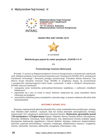 Międzynarodowe Targi Innowacji Międzynarodowe Targi Innowacji Gospodarczych i Naukowych INTARG 2016 14–15 czerwca, Katowice, Międzynarodowe Centrum Kongresowe GRAND PRIX JURY INTARG 2016 za wynalazek Wielofunkcyjny pojazd do zadań specjalnych „FUNTER 4 X 4” dla Przemysłowego Instytutu Motoryzacji W środę 15 czerwca w Międzynarodowym Centrum Kongresowym w Katowicach zakończyły się 9. Międzynarodowe Targi Innowacji Gospodarczych i Naukowych INTARG 2016, poświęcone transferowi technologii i wdrażaniu postępu technicznego. Prezydent Miasta Katowice, Pan Marcin Krupa oficjalnie otworzył Targi. INTARG to wyjątkowa okazja, by porozmawiać z wynalazcami reprezentującymi świat nauki i przemysłu, a także z młodymi innowatorami. INTARG stworzył możliwość: • nawiązania przez środowiska przemysłowo-biznesowe współpracy z czołowymi ośrodkami badawczymi • zapoznania się z tym, co nowe w nauce, technice, medycynie itp., przez wszystkich, którzy interesują się postępem • zrozumienia codziennej pracy wynalazców i poznania tego, co jeszcze niedawno dla wielu było niewyobrażalne. WYSTAWCY INTARG 2016 Wystawcy reprezentowali głównie jednostki sfery nauki, przedsiębiorstwa produkcyjne, startupy oraz młodzież szkół średnich i wyższych. Były też stoiska jednostek samorządowych, fundacji, stowarzyszeń, firm usługowych, podmiotów otoczenia biznesu. Wydarzenie zgromadziło ponad 150 wynalazków z 15 krajów świata (Tajwan, Tajlandia, Niemcy, Kanada, Bośnia i Hercegowina, Rumunia, Mołdawia, Chorwacja, Stany Zjednoczone, Iran, Zjednoczone Emiraty Arabskie, Egipt). Rozwiązania obejmowały zagadnienia z różnych dziedzin: ekologia, medycyna, bezpieczeństwo, lotnictwo, przemysł samochodowy i transport, metalurgia, włókiennictwo, maszyny i urządzenia, chemia, mechanika, inżynieria, elektronika, energetyka, informatyka i inne. 28 Farby i Lakiery (Paints and Varnishes) 3/2016 Międzynarodowe Targi Innowacji Innowacyjna technologia produkcji suszonego mięsa strusi o podwyższonej wartości prozdrowotnej; Kokosowy i truskawkowy koktajl ekologiczny dla osób uprawiających sport, opóźniający proces starzenia; Granulat do regeneracji tkanki kostnej; Robot do walki z pożarem; Robot do rehabilitacji kończyn górnych; Inteligentny kombinezon bojowy; Nowatorska drukarka 3D; Pojazd do zadań specjalnych – to zaledwie część wynalazków, które zaprezentowane zostały na Targach. Zwiedzający INTARG przekonali się, że „innowacja” łączy świat nauki i biznesu oraz służy nam wszystkim, wpływając na poprawę jakości życia, pracy, zdrowia, środowiska. KONFERENCJE I SPOTKANIA B2B W programie Targów nie zabrakło imprez towarzyszących, które cieszyły się dużym zainteresowaniem. Urząd Marszałkowski Województwa Śląskiego oraz Górnośląska Agencja Przedsiębiorczości i Rozwoju byli głównymi organizatorami konferencji „Medica Silesia Clusters Meeting”. Górnośląska Agencja Przedsiębiorczości i Rozwoju była również głównym organizatorem Spotkań B2B oraz konferencji „Przedsiębiorstwo w XXI wieku – szanse i wyzwania”. Fundacja NANONET zaprosiła na konferencję poświęconą zagadnieniom z dziedziny nanotechnologii pod hasłem „InterNanoPoland 2016”. W drugim dniu Targów odbyła się konferencja „Innowacyjna gospodarka: pomysł – realizacja – sukces”, zorganizowana przez Regionalną Izbę Gospodarczą w Katowicach oraz firmę A1 Europe. STREFA INNOWACJI Przez dwa dni w Strefie Innowacji odbywały się liczne interesujące prezentacje: „Termoterapia” (ABC-N SYSTEM, Anna Nykiś); „System do samodzielnego murowania ścian” (Bartłomiej Banaszek); „Hybrydowa przystawka do napędu wózka osoby niepełnosprawnej HERMES” (Studenci Politechniki Białostockiej); „Innowacyjne usługi za pomocą aplikacji mobilnych dla partnerów biznesowych” (APPOI Sp. z o.o.); „Autobus elektryczny Ekovolt” (Ursus Bus SA); „Komputerowe systemy biomedyczne” (Uniwersytet Śląski); „Budowanie modelu systemowej współpracy nauki z biznesem (S2B) w zakresie poprawy warunków pracy” (CIOP-PAN); „Osiągnięcia naukowe w zakresie nanotechnologii i nanofizyki” („Nanonet” Fundacja Wspierania Nanonauk i Nanotechnologii). GALA KONKURSU INNOWATOR ŚLĄSKA W czasie Targów Górnośląska Agencja Przedsiębiorczości i Rozwoju na uroczystej Gali ogłosiła wyniki konkursów INNOWATOR ŚLĄSKA. GALA OGŁOSZENIA WYNIKÓW KRAJOWYCH KONKURSÓW LIDER INNOWACJI 2016 ORAZ MŁODY WYNALAZCA 2016 W czasie Gali zostały ogłoszone oficjalne wyniki konkursów organizowanych pod honorowym patronatem Wiceprezesa Rady Ministrów oraz Ministra Nauki i Szkolnictwa Wyższego – Jarosława Gowina: • LIDER INNOWACJI 2016 • MŁODY WYNALAZCA 2016 Farby i Lakiery (Paints and Varnishes) 3/2016 29 Międzynarodowe Targi Innowacji GALA OGŁOSZENIA WYNIKÓW INTARG 2016 Prezentowane rozwiązania zostały zgłoszone do konkursu Targów INTARG, w ramach którego grono kilkunastu jurorów i ekspertów, pod przewodnictwem dr. inż. Krzysztofa Biernata, prof. nadzw., oraz dr hab. inż. Grzegorza Wcisło dokonało ich oceny, przyznając nagrody i medale. W dniu 15 czerwca 2016 roku odbyła się Gala, na której ogłoszono oficjalne wyniki konkursu i wręczono nagrody ufundowane przez patronów wydarzenia oraz przyznane przez jury Targów. W ramach konkursu INTARG jury przyznało: a) Wyróżnienia specjalne: • Grand Prix za rozwiązanie: Wielofunkcyjny pojazd do zadań specjalnych „FUNTER 4 X 4”. Wynalazek opracowany został przez dr inż. Andrzeja Muszyńskiego, mgr inż. Dariusza Wojdasa, mgr inż. Jakuba Lisieckiego; mgr inż. Szymona Lisieckiego, mgr inż. Roberta Dudka, mgr inż. Piotra Mitasa z Przemysłowego Instytutu Motoryzacji. • Nagroda przewodniczącego Jury dla Instytutu Chemii Przemysłowej za: Hybrydowe nieorganiczno/organiczne aerożele do zastosowań izolacyjnych. opracowane przez dr hab. Marię Zielec