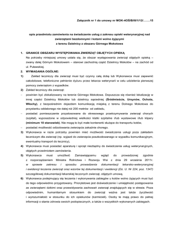 Załącznik nr 1 do umowy nr MOK-4OŚ/B/III/1/12/…….15 opis przedmiotu zamówienia na świadczenie usług z zakresu opieki weterynaryjnej nad zwierzętami bezdomnymi i kotami wolno żyjącymi z terenu Dzielnicy z obszaru Górnego Mokotowa 1. GRANICE OBSZARU WYSTĘPOWANIA ZWIERZĄT OBJĘTYCH OPIEKĄ Na potrzeby niniejszej umowy ustala się, że obszar występowania zwierząt objętych opieką – zwany dalej Górnym Mokotowem – stanowi zachodnią część Dzielnicy Mokotów – na zachód od ul. Puławskiej. 2. WYMAGANIA OGÓLNE: Zakład leczniczy dla zwierząt musi być czynny całą dobę lub Wykonawca musi zapewnić 1) całodobowe, telefoniczne pełnienie dyżuru przez lekarza weterynarii w celu udzielenia pierwszej pomocy zwierzętom z wypadków. 2) Zakład leczniczy dla zwierząt: powinien być zlokalizowany na terenie Górnego Mokotowa. Dopuszcza się również lokalizację w innej części Dzielnicy Mokotów lub dzielnicy sąsiedniej (Śródmieście, Ursynów, Ochota, Włochy), z bezpośrednim dojazdem komunikacją miejską z terenu Dolnego Mokotowa do przystanku oddalonego nie dalej niż 200 metrów od zakładu, posiadać pomieszczenie przystosowane do okresowego przetrzymywania zwierząt chorych (szpital), wyposażone w odpowiedniej wielkości klatki szpitalne i/lub wystawowe i/lub klipery (minimum 10 stanowisk). Nie mogą to być małe kontenerki służące do transportu kotów, posiadać możliwość odizolowania zwierzęcia zakaźnie chorego. 3) Wykonawca w razie potrzeby powinien mieć możliwość świadczenia usługi poza zakładem leczniczym dla zwierząt (np. wyjazd do zwierzęcia poszkodowanego w wypadku komunikacyjnym, ewentualny transport do lecznicy), 4) Wykonawca musi posiadać aparaturę i sprzęt niezbędny do świadczenia usług weterynaryjnych, objętych przedmiotem zamówienia. 5) Wykonawca z w musi rozporządzeniem sprawie umożliwić Ministra zakresu i Zamawiającemu Rolnictwa sposobu i Rozwoju prowadzenia wgląd Wsi do z prowadzonej dnia dokumentacji 29 zgodnie września 2011r. lekarsko-weterynaryjnej i ewidencji leczenia zwierząt oraz wzorów tej dokumentacji i ewidencji (Dz. U. Nr 224, poz. 1347) szczegółowej dokumentacji lekarskiej leczonych zwierząt, objętych umową. 6) Wykonawca podejmujący się leczenia i wykonywania zabiegów u kotów wolno żyjących musi być do tego odpowiednio przygotowany. Priorytetowe jest doświadczenie i umiejętność postępowania ze zwierzętami dzikimi oraz przewidywania zachowań zwierząt znajdujących się w stresie. Poza odpowiednim, humanitarnym stosunkiem do zwierząt ważna jest także życzliwość i wyrozumiałość w stosunku do ich opiekunów (karmicieli). Osoby te mają prawo do pełnej informacji o stanie zdrowia swoich podopiecznych, a także o wszystkich wykonanych zabiegach. 3. WYPOSAŻENIE: Zakład leczniczy powinien posiadać niezbędne wyposażenie – odpowiednie klatki do przetrzymywania kotów, podbierak, klatkę zaciskową, rękawice ochronne i inne. Klatki: gdy zawierana jest umowa z konsorcjum - w każdym zakładzie leczniczym musi być szpital z minimum 5 klatkami odpowiedniej wielkości, przeznaczonymi dla zwierząt „miejskich”; pojedyncze klatki nie mogą stać bezpośrednio na sobie i kontaktować się ze sobą, jeśli mają ażurowe ścianki. Wtedy niezbędne są stelaże, z bocznymi, litymi i łatwymi do mycia i dezynfekcji ścianami lub specjalne zestawy klatek; optymalna wielkość klatek - 90x70x60 cm - zapewniająca miejsce: do swobodnego położenia i wyprostowania się zwierzęcia, na kuwetę (ze żwirkiem lub gazetami), na posłanie oraz na miseczki z wodą i karmą. Najlepiej aby miski były przymocowane lub podwieszane na drzwiczkach/ściance. Jeżeli zakład leczniczy posiada mniejsze klatki (51x76x60 cm czy nawet 44x62x55 cm) to mogą one być wykorzystywane do krótkich, maksymalnie 2 dniowych pobytów; wszystkie klatki muszą być numerowane, a w karcie leczenia każdego zwierzęcia wpisany powinien być także numer klatki, w której przebywa; przestrzeganie zasady - 1 kot przypada na 1 klatkę, wyjątkiem są kocięta pochodzące z 1 miotu lub kotka z kociętami, wtedy niezbędna jest duża klatka; po wydaniu każdego kota klatki muszą zostać umyte, a następnie odkażone przy użyciu preparatu dezynfekcyjno-odkażającego. Natomiast gdy u zwierzęcia stwierdzona była choroba zakaźna zaleca się dodatkowe odkażenie sprzętu roztworem chloru. Uwaga - niedopuszczalne jest przetrzymywanie kotów w kontenerach transportowych czy klatkach łapkach. 4. DOKUMENTACJA (EWIDENCJA ZWIERZĄT): 1) Zwierzę przyjmowane do zakładu leczniczego musi mieć nadany kolejny numer, w karcie leczenia powinna też być adnotacja zawierająca: datę i godzinę przyjęcia zwierzęcia, dane osoby (np. numer Eko patrolu lub przedstawiciela organizacji pozarządowej lub imię i nazwisko oraz numer telefonu osoby dostarczającej zwierzę (osoby prywatne), miejsce, z którego zostało ono przywiezione (w miarę możliwości - nazwę i numer ulicy, gdzie zostało znalezione/odłowione lub opis tego miejsca). Standardem powinno być sprawdzenie czy zwierzę nie jest oznakowane elektronicznie. Przy wydawaniu zwierzęcia należy odnotować, komu zostało ono wydane i w jakim celu (np. adopcja, wypuszczenie na wolność, przekazanie pod opiekę). 2) Wykonawca musi prowadzić i umożliwić Zamawiającemu wgląd do prowadzonej zgodnie z rozporządzeniem Ministra Rolnictwa i Rozwoju Wsi z dnia 29 września 2011 r. w sprawie zakresu i 2 sposobu prowadzenia dokumentacji lekarsko-weterynaryjnej i ewidencji leczenia zwierząt oraz wzorów tej dokumentacji i ewidencji (Dz. U. Nr 224, poz. 1347) szczegółowej dokumentacji lekarskiej leczonych zwierząt, objętych umową. 5. PRZEWIDYWANE USŁUGI WETERYNARYJNE zostały szczegółowo wymienione w załączonym formularzu cenowym. 6. INFORMACJE DODATKOWE: 1) Testy w kierunku białaczki i syndromu niedoboru immunologicznego (FeLV i FIV) powinny być wykony