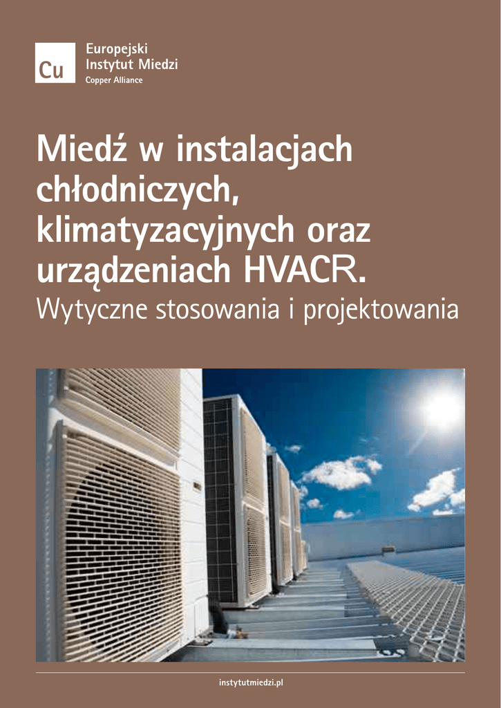 Miedź w instalacjach chłodniczych, klimatyzacyjnych oraz urządzeniach HVACR. Wytyczne stosowania i projektowania strona: www.instalacjezmiedzi.pl 1 Miedź w instalacjach chłodniczych, klimatyzacyjnych oraz urządzeniach HVACR. Wytyczne stosowania i projektowania instytutmiedzi.pl Europejski Instytut Miedzi Wydanie 2016 r Europejski Instytut Miedzi ul. św. Mikołaja 8-11 (p. 408) 50-125 Wrocław e-mail: [email protected] tel.: (+48) 71 78 12 502 fax: (+48) 71 78 12 504 www.instytutmiedzi.pl Miedź w instalacjach chłodniczych, klimatyzacyjnych oraz urządzeniach HVACR. Wytyczne stosowania i projektowania strona: www.instalacjezmiedzi.pl 3 Spis treści Podstawowe przepisy w zakresie projektowania i wykonywania instalacji z miedzi w chłodnictwie i klimatyzacji 4 Zasady wyboru miedzi jako materiału na instalacje chłodnicze i klimatyzacyjne 4 Wymagania dla rur miedzianych stosowanych w urządzeniach chłodniczych i klimatyzacyjnych. Warunki normy PN-EN 12735-1:2010P 5 Łączniki stosowane w instalacjach chłodniczych i klimatyzacyjnych 9 Podstawowe dane do projektowania instalacji z rur miedzianych 10 Sposoby łączenia instalacji miedzianych stosowanych w instalacjach chłodniczych i klimatyzacyjnych 10 Rury ze stopów miedzi stosowane w instalacjach chłodniczych ekologicznych (rura stopowa K65) 12 Miedź w urządzeniach HVACR 13 Zasady BHP i ppoż. oraz wymagania eksploatacyjne 14 Bibliografia 16 Miedź w instalacjach chłodniczych, klimatyzacyjnych oraz urządzeniach HVACR. Wytyczne stosowania i projektowania strona: 4 www.instalacjezmiedzi.pl 1. Podstawowe przepisy w zakresie projektowania i wykonywania instalacji z miedzi w chłodnictwie i klimatyzacji Podstawowym przepisem prawnym dotyczącym ciśnieniowych urządzeń i instalacji chłodniczych (ich projektowania oraz wytwarzania) jest europejska dyrektywa ciśnieniowa 97/23/WE (określana jako dyrektywa PED) [3]. Dotyczy ona projektowania, wytwarzania oraz oceny zgodności urządzeń ciśnieniowych, dla których najwyższe dopuszczalne ciśnienie PS (czyli określone przez producenta najwyższe ciśnienie, na które jest zaprojektowane urządzenie) jest większe niż 0,5 bara. Dyrektywa ta ma zastosowanie również do zespołów urządzeń ciśnieniowych, składających się z kilku urządzeń ciśnieniowych zmontowanych tak, aby tworzyły razem scaloną i funkcjonalną całość, jeżeli są wprowadzane przez wytwórcę na rynek i oddawane do eksploatacji jako zespół. Urządzenia ciśnieniowe obejmują zbiorniki, instalacje rurowe, osprzęt zabezpieczający i osprzęt ciśnieniowy, jak również kotły parowe, wymienniki ciepła, urządzenia do przegrzewania pary. W Polsce dyrektywa zostały wprowadzona Rozporządzeniem Ministra Gospodarki z dnia 21 grudnia 2005 roku w sprawie zasadniczych wymagań dla urządzeń ciśnieniowych i zespołów urządzeń ciśnieniowych (Dz.U. 2005.263.2200) [27]. Pozostałymi dokumentami prawnymi dotyczącymi projektowania i wykonania instalacji z miedzi w chłodnictwie i klimatyzacji są następujące normy: • PN-EN 12735-1:2010P [21], PN-EN 12735-2:2010P [22], oraz • PN-EN 1045:2001P [16], PN-EN 14276-2+A1:2011E [23], PN-EN 14324:2008P, PN-EN 378-2+A2:2012E [24], PN-EN ISO 17672:2010E, PN-EN 1254-1:2004P, PN-EN 1254-2:2004P, PN-EN 1254-4:2004P, PN-EN 1254-5:2004P, PN-EN 1092-3:2008P. 2. Zasady wyboru miedzi jako materiału na instalacje chłodnicze i klimatyzacyjne Elementy instalacji chłodniczych wykonane z miedzi powinny spełniać specjalne wymagania związane z występującymi naprężeniami mechanicznymi, cieplnymi i chemicznymi. Muszą charakteryzować się odpornością na działanie stosowanych czynników chłodniczych, ich mieszanin z olejami wraz z ewentualnymi domieszkami i zanieczyszczeniami oraz substancji transportujących ciepło [13]. Zgodnie z wymaganiami normy PN-EN 14276-1 +A1:2011E [23], miedź pozostająca w kontakcie z czynnikami chłodniczymi powinna być miedzią beztlenową lub odtlenioną. Zaleca się także stosowanie miedzi z grup 31 i 34, z ograniczeniami wymienionymi w normie. Wybierając miedź, należy przeanalizować jej zalety i wady w kontekście planowanych warunków stosowania. Miedź posiada wysoką odporność na wahania temperatury i ciśnienia, jest bardzo wytrzymała i plastyczna. Jest także odporna na większość substancji chemicznych stosowanych w chłodnictwie. Miedź bardzo dobrze przewodzi ciepło, co zostało wykorzystane w wymiennikach ciepła. W wilgotnym środowisku na jej powierzchni pojawia się nalot – warstwa zasadowego węglanu miedzi (tzw. patyna), która chroni ją przed korozją. Na miedź silnie negatywnie oddziałują związki chloru, kwasy, wapno bielące, zaprawa murarska, jak również kwas azotowy (zachodzi rozpuszczanie miedzi) [11]. Nie jest odporna na działanie wilgotnej atmosfery przemysłowej zawierającej dwutlenek siarki. Wytwarzająca się na jej powierzchni warstwa zasadowego siarczanu miedzi nie chroni jej przed korozją (Langman1). Nie reaguje w kontakcie ze słoną wodą [11]. Miedź może współpracować z następującymi czynnikami chłodniczymi [31], [6], [2]: Europejski Instytut Miedzi • ul. św. Mikołaja 8-11, 50-125 Wrocław • tel.: 71 78 12 502, fax: 71 78 12 504 • [email protected] Miedź w instalacjach chłodniczych, klimatyzacyjnych oraz urządzeniach HVACR. Wytyczne stosowania i projektowania strona: www.instalacjezmiedzi.pl 5 • HCFC – wodorochlorofluorowęglowodory (głównym przedstawicielem tej grupy jest niszczący warstwę ozonową czynnik chłodniczy R22, stosowany do końca 2015 roku), • HFC – wodorofluorowęglowodory – należące do grupy f-gazów – wpływające na wzrost efektu cieplarnianego (m.in. czynnik chłodniczy R134a); czynniki HFC są także głównymi składnikami mieszanin z serii 400 oraz 500, np.: R410A, R407C, R404A, • HC (propan R290 lub butan R600), warunkowo można także stosować miedziane rury dla czynników w stanie wyłącznie suchym, • dwu