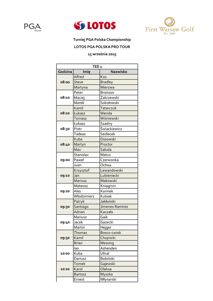 Turniej PGA Polska Championship LOTOS PGA POLSKA PRO TOUR 15 września 2015 TEE 1 Godzina 08:00 08:10 08:20 08:30 08:40 09:00 09:10 09:20 09:30 09:40 09:50 10:00 10:20 10:30 Imię Alfred Steve Martyna Peter Maciej Marek Kamil Łukasz Tomasz Łukasz Piotr Tadeas Kuba Martyn Max Stanislav Paweł Juan Krzysztof Jan Mariusz Mateusz Ales Włodzimierz Patryk Santiago Adrian Mariusz Jacek Martin Thomas Kamil Brian Ian Kuba Dariusz Tomek Karol Bartosz Ernest Nazwisko Kos Bradley Mierzwa Bronson Zakrzewski Sokołowski Tatarczuk Wenda Wiśniewski Szadny Świackiewicz Sedlacek Ossowski Proctor Sałuda Matus Czerwonka Ochoa Lewandowski Lubieniecki Makowski Kniaginin Korinek Kubiak Jabłoński Jimenez Ramirez Kaczała Gaik Gazecki Hejger Bosco-cwiok Chojnicki Messing Ashenden Ufnal Bobiński Gajewski Oleksa Myszka Młynarski 10:30 10:40 10:50 11:00 11:10 11:30 11:40 11:50 12:00 12:10 12:20 Marek Mariusz Bogdan Rhea Krzysztof Leszek Antoni Elżbieta Jacek Bogdan Maciej Sławomir Marcin Robert Marek Piotr Maciej Krzysztof Hoa Duong Mirosław Tomasz Tavi Anna Arkadiusz Grzegorze Mateusz Przemysław Yerik Raushan Tymiński Czerkawski Wnuk Wiatr Burdalski Niewczas Strzelecki Panas Orzech Bigus Zadęcki Marszałek Stefański Buzek Machtynger Szymański Królak Przeździecki Manh That Van Ty Bogowicz Iwan Nimrod Woźniak Zaporski Czelej Ligocki Piński Utembayeva Meirmanova