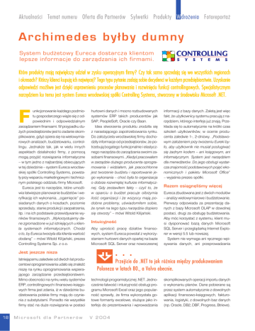 Aktualności Temat numeru Oferta dla Partnerów Sylwetki Produkty W drożenia Fotoreportaż Archimedes byłby dumny System budżetowy Eureca dostarcza klientom lepsze informacje do zarządzania ich firmami. Które produkty mają największy udział w zysku operacyjnym firmy? Czy tak samo sprzedają się we wszystkich regionach i okresach? Którzy klienci kupują ich najwięcej? Tego typu pytania zadają sobie decydenci w każdym przedsiębiorstwie. Uzyskanie odpowiedzi możliwe jest dzięki usprawnieniu procesów planowania i rozwinięciu funkcji controllingowych. Specjalistycznym narzędziem ku temu jest system Eureca wrocławskiej spółki Controlling Systems, stworzony w środowisku Microsoft .NET. F unkcjonowanie każdego podmio- hurtowni danych i mocno rozbudowanych informacji z bazy danych. Zaletą jest więc tu gospodarczego wiąże się z od- systemów ERP takich producentów jak fakt, że użytkownicy systemu pracują z na- powiednim i odpowiedzialnym SAP, PeopleSoft, Oracle czy Baan. rzędziem, którego interfejs już znają. Prze- zarządzaniem finansami. W przypadku du- Idea stworzenia produktu zrodziła się kłada się to automatycznie na krótki czas żych przedsiębiorstw jest to zadanie skom- z narastającego zapotrzebowania rynku. szkoleń użytkowników, w ocenie produ- plikowane, gdyż opiera się na wielowymia- Do założyciela wrocławskiej firmy docho- centa zaledwie 1-, 2-dniowy. „Podstawo- rowych analizach, budżetowaniu, control- dziły informacje od przedsiębiorstw, że po- wym założeniem przy tworzeniu Eureki by- lingu. Jednakże tak, jak w wielu innych trzebują bogatego funkcjonalnie i elastycz- ło, aby użytkownik nie musiał posługiwać aspektach działalności firmy, z pomocą nego narzędzia do zarządzania swoimi za- się żadnym kodem – ani księgowym, ani mogą przyjść rozwiązania informatyczne sobami finansowymi. „Kiedyś pracowałem informatycznym. System jest narzędziem – w tym jedno z najbardziej obiecujących w zarządzie dużego producenta oprogra- dla menedżerów. Do jego obsługi wystar- w tej dziedzinie – system Eureca wrocław- mowania i widziałem, jak pracochłonne cza znajomość podstawowych pojęć eko- skiej spółki Controlling Systems, powsta- jest tworzenie budżetu i raportowanie je- nomicznych i pakietu Microsoft Office” ły przy wsparciu marketingowym i technicz- go wykonania – choć była to organizacja – wyjaśnia prezes spółki. nym polskiego oddziału firmy Microsoft. o dobrze rozwiniętej kulturze informatycz- Eureca jest to narzędzie, które umożli- nej. Gdy zestawiłem fakty – czyli to, że Razem osiągnęliśmy więcej wia łatwiejsze planowanie budżetów i we- w oparciu o budżet pracuje olbrzymia Eureca zbudowana jest z dwóch modułów ryfikację ich wykonania, „ogarnięcie” po- ilość organizacji i że wszyscy mają po- – analizy wielowymiarowe i budżetowanie. siadanych danych o kosztach, poziomie dobne problemy, uświadomiłem sobie, Pierwszy odpowiada za prezentację da- sprzedaży, stanie produkcji i zaopatrzenia, że rynek na tego typu narzędzia dopiero nych z bazy Microsoft OLAP w dowolnej itp. i na ich podstawie przewidywanie wy- się otworzy” – mówi Witold Kilijański. postaci, drugi za obsługę budżetowania. ników finansowych. „Wykorzystujemy da- Aby móc korzystać z systemu, klient mu- ne zgromadzone w już istniejących u klien- Intuicyjność ta systemach informatycznych. Chodzi Aby uprościć pracę działów finanso- SQL Server i przeglądarką Internet Explo- o to, by Eureca tworzyła dla klienta wartość wych, system Eureca powstał z wykorzy- rer w wersji 5.5 lub nowszej. dodaną” – mówi Witold Kilijański, prezes staniem hurtowni danych opartej na bazie System nie wymaga ani ręcznego wpi- Controlling Systems Sp. z o.o. Microsoft SQL Server oraz nowoczesnej sywania danych, ani przeprowadzania si dysponować bazą danych Microsoft Jest jeszcze nisza Istniejącemu zaledwie od dwóch lat producentowi oprogramowania udało się znaleźć niszę na rynku oprogramowania wspiera- Przejście do .NET to jak różnica między produkowaniem Poloneza w latach 80., a Volvo obecnie. jącego zarządzanie przedsiębiorstwem. 18 Mimo obecności na rynku wielu systemów technologii programistycznej .NET. Jedno- skomplikowanych operacji importu danych ERP, controllingowych i finansowo-księgo- cześnie łatwość i intuicyjność obsługi pro- o wykonaniu planów. Dane pobierane są wych firma jest zdania, iż w dziedzinie bu- gramu Microsoft Excel oraz jego popular- przez system automatycznie z dowolnych dżetowania polskie firmy mają do czynie- ność sprawiły, że firma wykorzystała go- aplikacji finansowo-księgowych, fakturo- nia z substytutami. Ponadto nie wszystkie towe formanty excelowe, służące jako in- wania, logistyki, z dowolnych baz danych firmy stać na duże rozwiązania w postaci terfejs do prezentowania i wprowadzania (np. Oracle, DB2, DBF, Progress, Btrieve). Microsoft dla Partnerów V 2004 Aktualności Temat numeru Oferta dla Partnerów Sylwetki Produkty W drożenia Fotoreportaż Źródłem danych dla Eureki mogą systemu Eureca procentuje. Firma przy- być nawet arkusze Microsoft gotowuje się do zmiany statusu partner- Excel lub pliki tekstowe. System skiego na Microsoft Certified Partner jest przystosowany do obsługi or- w kategorii ISV/Software Solutions (roz- ganizacji rozproszonych terytorial- wiązania programistyczne ISV). „Chcemy nie. Ich użytkownicy mogą śledzić uzyskać tytuł w drodze certyfikacji i bada- plan i wykonanie oraz wprowa- nia referencji. W najbliższych tygodniach dzać dane o planach przez stro- poddamy nasze oprogramowanie ocenie nę internetową lub intranetową. zgodności ze standardami Microsoft, by uzyskać certyfikat .NET Connected” Informatyczne dziecko Prototypowa wersja systemu powstała w ciągu trzech miesięcy, pierwsza wersja – wyjaśnia prezes wrocławskiej spółki. Witold Kilijański, 