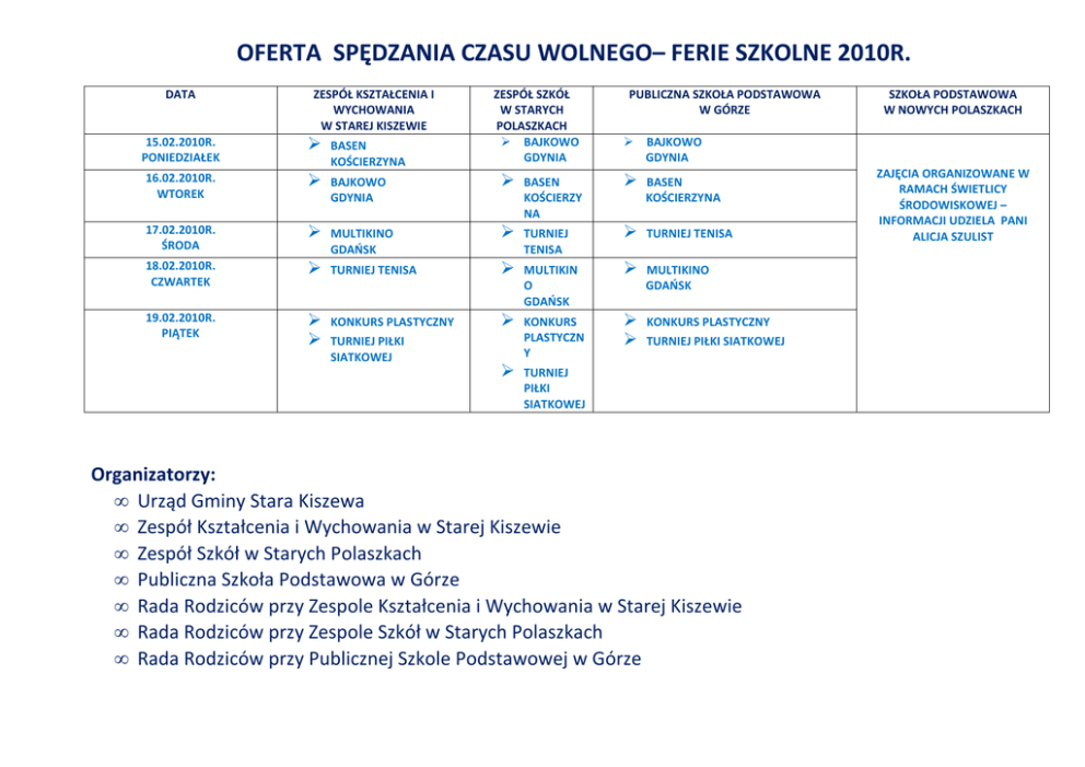 OFERTA SPĘDZANIA CZASU WOLNEGO– FERIE SZKOLNE 2010R. DATA ZESPÓŁ KSZTAŁCENIA I WYCHOWANIA W STAREJ KISZEWIE ZESPÓŁ SZKÓŁ W STARYCH POLASZKACH BAJKOWO GDYNIA PUBLICZNA SZKOŁA PODSTAWOWA W GÓRZE BAJKOWO GDYNIA BASEN KOŚCIERZY NA BASEN KOŚCIERZYNA TURNIEJ TENISA TURNIEJ TENISA TURNIEJ TENISA MULTIKIN O GDAŃSK MULTIKINO GDAŃSK KONKURS PLASTYCZNY KONKURS PLASTYCZN Y KONKURS PLASTYCZNY 15.02.2010R. PONIEDZIAŁEK BASEN KOŚCIERZYNA 16.02.2010R. WTOREK BAJKOWO GDYNIA 17.02.2010R. ŚRODA MULTIKINO GDAŃSK 18.02.2010R. CZWARTEK 19.02.2010R. PIĄTEK TURNIEJ PIŁKI SIATKOWEJ TURNIEJ PIŁKI SIATKOWEJ TURNIEJ PIŁKI SIATKOWEJ Organizatorzy: • Urząd Gminy Stara Kiszewa • Zespół Kształcenia i Wychowania w Starej Kiszewie • Zespół Szkół w Starych Polaszkach • Publiczna Szkoła Podstawowa w Górze • Rada Rodziców przy Zespole Kształcenia i Wychowania w Starej Kiszewie • Rada Rodziców przy Zespole Szkół w Starych Polaszkach • Rada Rodziców przy Publicznej Szkole Podstawowej w Górze SZKOŁA PODSTAWOWA W NOWYCH POLASZKACH ZAJĘCIA ORGANIZOWANE W RAMACH ŚWIETLICY ŚRODOWISKOWEJ – INFORMACJI UDZIELA PANI ALICJA SZULIST Bajkowo – jest to oferta skierowana dla uczniów klas I-III szkół podstawowych Bajkowo - jest obecnie nową i największą w Trójmieście salą zabaw dla dzieci (300 m powierzchni zabawowej). Bajkowo to 3 baseny z piłeczkami, 6 zjeŜdŜalni, labirynty (tj. magle, zęby rekina, mostki, boksery itp.), dmuchane pajace. Nad bezpieczeństwem dzieci czuwa wykwalifikowana pomoc, która jednocześnie przyjemnie zorganizuje czas. • Liczba miejsc – ograniczona • Pobyt w Bajkowie - 10³º - 12³º • Zapisy u wychowawcy klasy do 11.02.2010r. Cena biletu – 5 zł. Pozostałe koszty pokrywają organizatorzy. NaleŜy zabrać: koszulkę z krótkim rękawem, spodnie dresowe, napój, prowiant, legitymację szkolną. Multikino Gdańsk - jest to oferta skierowana do uczniów klas IV-VI szkół podstawowych oraz I-III gimnazjum Proponowane filmy: • Planeta 51 bez ograniczeń wiekowych • Avatar 3D od lat 12 • Liczba miejsc – ograniczona • Zapisy w sekretariacie szkoły Cena biletu – 5 zł. Pozostałe koszty pokrywają organizatorzy. Planeta 51 - Animowany/Familijny Hiszpania, USA, Wielka Brytania 2009 90 min ReŜyseria: Jorge Blanco Scenariusz: Joe Stillman O filmie: Nowy film twórców „Shreka”! Typowi mieszkańcy planety mają dwoje czułków, osiem palców i panicznie boją się inwazji obcych cywilizacji. 16-letni Lem jest wzorowym uczniem i wiedzie beztroskie Ŝycie marząc o kosmosie oraz o swojej uroczej zielonoskórej sąsiadce Neerze. Pewnego dnia, w samym środku rodzinnego grilla na podwórku Neery ląduje niezidentyfikowany obiekt latający opatrzony śmiesznie brzmiącym napisem „NASA”. Gdy sterujący nim Kapitan Russ Baker opuszcza swój statek, aby triumfalnie wbić w nieodkrytą dotąd ziemię amerykańską flagę zauwaŜa… kilkoro wgapionych w siebie otwartych ze zdziwienia oczu. Spanikowany bierze nogi za pas i znajduje schronienie w planetarium, w którym pracuje Lem. Po początkowej fazie wzajemnej nieufności między bohaterami stopniowo zaczyna kiełkować przyjaźń. Teraz Lem, wraz z pomocą Ŝyczliwych lecz niezbyt bystrych przyjaciół, musi nie tylko ukryć swojego ziemskiego przyjaciela przed ścigającym go wojskiem, ale takŜe pomóc mu jak najszybciej wrócić na przejęty przez władze planety statek. Obsada: Maciej Stuhr - Lem (polski dubbing) Piotr Adamczyk - Chuck (polski dubbing) Magdalena RóŜczka - Neera (polski dubbing) Jarosław Boberek - Skiff (polski dubbing) Adam Ferency - Generał Grawl (polski dubbing) Muniek Staszczyk - Glar (polski dubbing) Aleksander Mikołajczak - Profesor Kipple (polski dubbing) Avatar Science-Fiction USA 2009 161 min ReŜyseria: James Cameron Scenariusz: James Cameron O filmie: Długo oczekiwany film Jamesa Camerona zrealizowany z wielkim rozmachem porównywalnym do Titanica. Szacowany budŜet na poziomie 237 milionów dolarów daje mu trzecie miejsce pod tym względem w historii kina. Avatar został wykonany w dwóch technikach: tradycyjnej 2D i zupełnie nowej technice 3D. Zdjęcia do filmu zostały wykonane w 2007 roku, natomiast na postprodukcję przeznaczono dwa lata. Avatar opowiada historię sparaliŜowanego byłego komandosa, który dostaje szansę odzyskania zdrowego ciała. Musi jednak wziąć udział w specjalnym programie militarnym o nazwie Avatar. W rolach głównych między innymi Sam Worthington, Sigourney Weaver, Michelle Rodriguez. Media na całym świecie ogłaszają, Ŝe Avatar będzie przełomem kina na miarę wprowadzenia w latach 20. dźwięku. Sam Cameron uwaŜa, Ŝe będzie to film lepszy od samego Titanica. Obsada: Sam Worthington - Jake Sully Laz Alonso - Tsu'Tey CCH Pounder – Moha Sigourney Weaver - Dr Grace Augustine Joel Moore - Norm Spellman Matt Gerald - Lyle Wainfleet Basen rekreacyjny - jest to oferta skierowana do uczniów klas IV-VI szkół podstawowych oraz I-III gimnazjum Basen rekreacyjny rozciąga się na 157,6 m2, a jego głębokość wynosi od 0,8 m do 1,35 m. Jest to idealne miejsce do rekreacji i zabaw. Basen jest wyposaŜony w zespół hydromasaŜy w tym: bicze i parasole wodne, leŜanki podwodne i jacuzzi. Wielką atrakcję stanowią znajdujące się w tej części AQUA Centrum – dwie zjeŜdŜalnie (duŜa - o długości 60 m i mała – dwutorowa • • • • Liczba miejsc – ograniczona Zapisy w sekretariacie szkoły Pobyt na basenie 13ºº - 15ºº Na 15 uczniów przypada 1 opiekun Cena biletu – 5 zł. Pozostałe koszty pokrywają organizatorzy. Turniej tenisa stołowego I grupa wiekowa - uczniowie klas I – III - szkoła podstawowa II grupa wiekowa - uczniowie klas IV- VI - szkoła podstawowa III grupa wiekowa - uczniowie klas I- III - gimnazjum Turniej piłki siatkowej Według zgłoszonych zespołów Konkurs plastyczny I grupa wiekowa - uczniowie klas I – III - szkoła podstawowa II grupa wiekowa - uczni