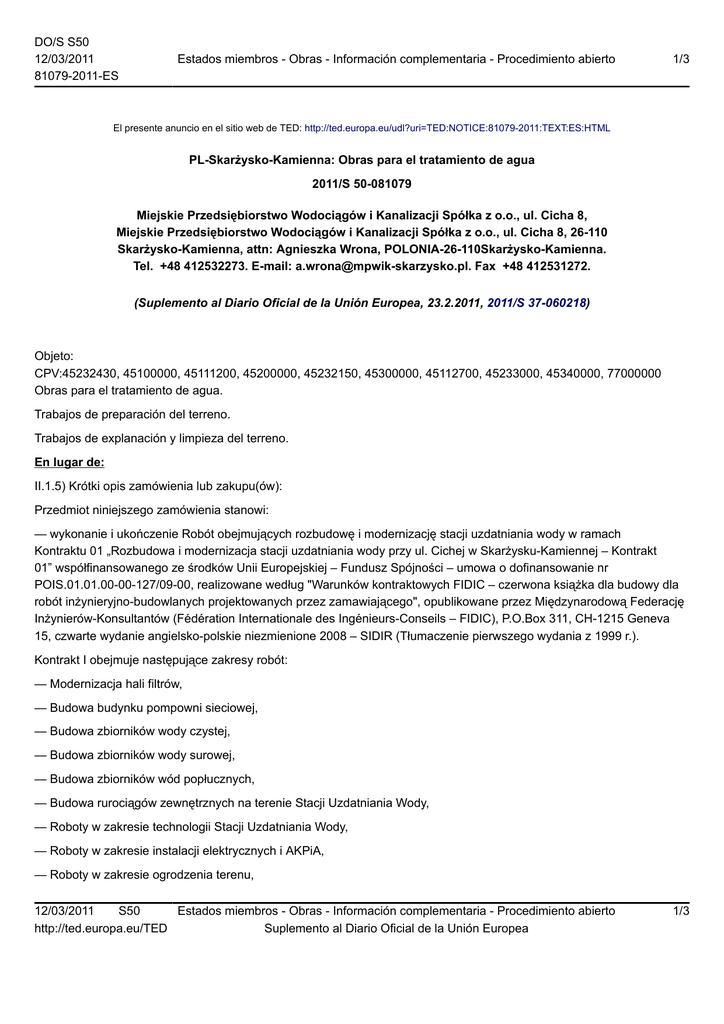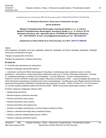 DO/S S50 12/03/2011 81079-2011-ES Estados miembros - Obras - Información complementaria - Procedimiento abierto 1/3 El presente anuncio en el sitio web de TED: http://ted.europa.eu/udl?uri=TED:NOTICE:81079-2011:TEXT:ES:HTML PL-Skarżysko-Kamienna: Obras para el tratamiento de agua 2011/S 50-081079 Miejskie Przedsiębiorstwo Wodociągów i Kanalizacji Spółka z o.o., ul. Cicha 8, Miejskie Przedsiębiorstwo Wodociągów i Kanalizacji Spółka z o.o., ul. Cicha 8, 26-110 Skarżysko-Kamienna, attn: Agnieszka Wrona, POLONIA-26-110Skarżysko-Kamienna. Tel. +48 412532273. E-mail: [email protected]. Fax +48 412531272. (Suplemento al Diario Oficial de la Unión Europea, 23.2.2011, 2011/S 37-060218) Objeto: CPV:45232430, 45100000, 45111200, 45200000, 45232150, 45300000, 45112700, 45233000, 45340000, 77000000 Obras para el tratamiento de agua. Trabajos de preparación del terreno. Trabajos de explanación y limpieza del terreno. En lugar de: II.1.5) Krótki opis zamówienia lub zakupu(ów): Przedmiot niniejszego zamówienia stanowi: — wykonanie i ukończenie Robót obejmujących rozbudowę i modernizację stacji uzdatniania wody w ramach Kontraktu 01 „Rozbudowa i modernizacja stacji uzdatniania wody przy ul. Cichej w Skarżysku-Kamiennej – Kontrakt 01” współfinansowanego ze środków Unii Europejskiej – Fundusz Spójności – umowa o dofinansowanie nr POIS.01.01.00-00-127/09-00, realizowane według "Warunków kontraktowych FIDIC – czerwona książka dla budowy dla robót inżynieryjno-budowlanych projektowanych przez zamawiającego", opublikowane przez Międzynarodową Federację Inżynierów-Konsultantów (Fédération Internationale des Ingénieurs-Conseils – FIDIC), P.O.Box 311, CH-1215 Geneva 15, czwarte wydanie angielsko-polskie niezmienione 2008 – SIDIR (Tłumaczenie pierwszego wydania z 1999 r.). Kontrakt I obejmuje następujące zakresy robót: — Modernizacja hali filtrów, — Budowa budynku pompowni sieciowej, — Budowa zbiorników wody czystej, — Budowa zbiorników wody surowej, — Budowa zbiorników wód popłucznych, — Budowa rurociągów zewnętrznych na terenie Stacji Uzdatniania Wody, — Roboty w zakresie technologii Stacji Uzdatniania Wody, — Roboty w zakresie instalacji elektrycznych i AKPiA, — Roboty w zakresie ogrodzenia terenu, 12/03/2011 S50 Estados miembros - Obras - Información complementaria - Procedimiento abierto http://ted.europa.eu/TED Suplemento al Diario Oficial de la Unión Europea 1/3 DO/S S50 12/03/2011 81079-2011-ES Estados miembros - Obras - Información complementaria - Procedimiento abierto 2/3 — Roboty w zakresie rozbiórki i budowy dróg i chodników, — Uruchomienie instalacji stanowiącej przedmiot zamówienia, — Przeprowadzenie prób i szkoleń w niezbędnym zakresie, — Osiągnięcie efektu oraz parametrów techniczno-technologicznych zdefiniowanych w Dokumentacji Projektowej oraz Specyfikacjach Technicznych. Szczegółowy opis i zakres przedmiotu zamówienia przedstawiony został w Części III niniejszej SIWZ, tj. Opis przedmiotu zamówienia. Realizacja powyższego zadania nastąpi na podstawie opracowanego projektu budowlano-wykonawczego pod nazwą: „Przebudowa (Modernizacja) i rozbudowa stacji uzdatniania wody w mieście Skarżysko-Kamienna przy ul. Cichej”. Léase: II.1.5) Krótki opis zamówienia lub zakupu(ów): Przedmiot niniejszego zamówienia stanowi: — wykonanie i ukończenie Robót obejmujących rozbudowę i modernizację stacji uzdatniania wody w ramach Kontraktu 01 „Rozbudowa i modernizacja stacji uzdatniania wody przy ul. Cichej w Skarżysku-Kamiennej – Kontrakt 01” współfinansowanego ze środków Unii Europejskiej – Fundusz Spójności – umowa o dofinansowanie nr POIS.01.01.00-00-127/09-00, realizowane według "Warunków kontraktowych FIDIC – czerwona książka dla budowy dla robót inżynieryjno-budowlanych projektowanych przez zamawiającego", opublikowane przez Międzynarodową Federację Inżynierów-Konsultantów (Fédération Internationale des Ingénieurs-Conseils – FIDIC), P.O.Box 311, CH-1215 Geneva 15, czwarte wydanie angielsko-polskie niezmienione 2008 – SIDIR (Tłumaczenie pierwszego wydania z 1999 r.). Kontrakt I obejmuje następujące zakresy robót: Etap A (Zadanie 1 – „Rozbudowa i modernizacja stacji uzdatniania wody przy ul. Cichej w mieście SkarżyskoKamienna”): — modernizacja hali filtrów (wraz z częścią biurową), — budowa budynku pompowni sieciowej, — budowa zbiorników wody czystej, — budowa zbiorników wody surowej, — budowa zbiorników wód popłucznych, — budowa rurociągów zewnętrznych na terenie Stacji Uzdatniania Wody, — roboty w zakresie technologii Stacji Uzdatniania Wody, — roboty w zakresie instalacji elektrycznych i AKPiA, — roboty w zakresie ogrodzenia terenu, — roboty w zakresie rozbiórki i budowy dróg i chodników, — roboty remontowe budynku stacji TRAFO i agregatu prądotwórczego, — uruchomienie instalacji stanowiącej przedmiot zamówienia, — przeprowadzenie prób i szkoleń w niezbędnym zakresie, 12/03/2011 S50 Estados miembros - Obras - Información complementaria - Procedimiento abierto http://ted.europa.eu/TED Suplemento al Diario Oficial de la Unión Europea 2/3 DO/S S50 12/03/2011 81079-2011-ES Estados miembros - Obras - Información complementaria - Procedimiento abierto 3/3 — osiągnięcie efektu oraz parametrów techniczno-technologicznych zdefiniowanych w Dokumentacji Projektowej oraz Specyfikacjach Technicznych. Szczegółowy opis i zakres przedmiotu zamówienia przedstawiony został w części III niniejszej SIWZ, tj. Opis przedmiotu zamówienia. Realizacja powyższego zadania nastąpi na podstawie opracowanego projektu budowlano-wykonawczego pod nazwą: „Przebudowa (Modernizacja) i rozbudowa stacji uzdatniania wody w mieście Skarżysko-Kamienna przy ul. Cichej”. 12/03/2011 S50 Estados miembros - Obras - Información complementaria - Procedimiento abierto http://ted.europa.eu/T