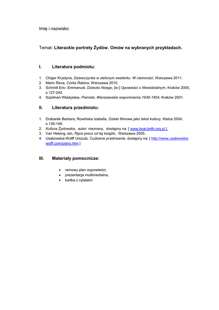 Imię i nazwisko Temat: Literackie portrety Żydów. Omów na
