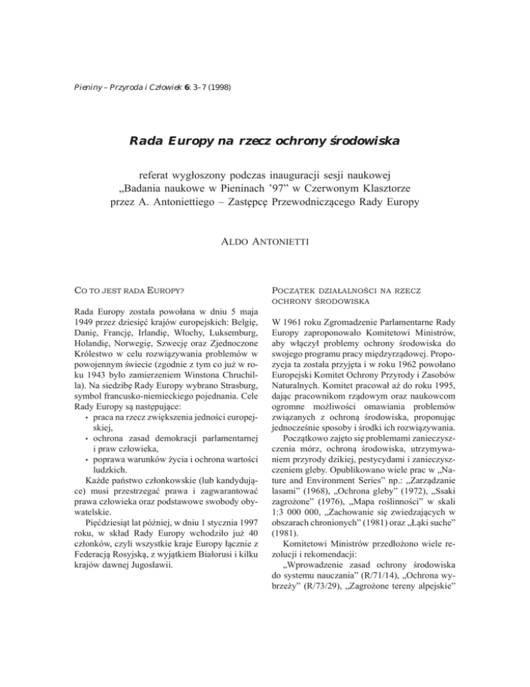Pieniny – Przyroda i Człowiek 6: 3–7 (1998) Rada Europy na rzecz ochrony środowiska referat wygłoszony podczas inauguracji sesji naukowej „Badania naukowe w Pieninach ’97” w Czerwonym Klasztorze przez A. Antoniettiego – Zaste˛pce˛ Przewodnicza˛cego Rady Europy ALDO ANTONIETTI CO TO JEST RADA EUROPY? Rada Europy została powołana w dniu 5 maja 1949 przez dziesie˛ć krajów europejskich: Belgie˛, Danie˛, Francje˛, Irlandie˛, Włochy, Luksemburg, Holandie˛, Norwegie˛, Szwecje˛ oraz Zjednoczone Królestwo w celu rozwia˛zywania problemów w powojennym świecie (zgodnie z tym co już w roku 1943 było zamierzeniem Winstona Chruchilla). Na siedzibe˛ Rady Europy wybrano Strasburg, symbol francusko-niemieckiego pojednania. Cele Rady Europy sa˛ naste˛puja˛ce: • praca na rzecz zwie˛kszenia jedności europejskiej, • ochrona zasad demokracji parlamentarnej i praw człowieka, • poprawa warunków życia i ochrona wartości ludzkich. Każde państwo członkowskie (lub kandyduja˛ce) musi przestrzegać prawa i zagwarantować prawa człowieka oraz podstawowe swobody obywatelskie. Pie˛ćdziesia˛t lat później, w dniu 1 stycznia 1997 roku, w skład Rady Europy wchodziło już 40 członków, czyli wszystkie kraje Europy ła˛cznie z Federacja˛ Rosyjska˛, z wyja˛tkiem Białorusi i kilku krajów dawnej Jugosławii. POCZA˛TEK DZIAŁALNOŚCI NA RZECZ OCHRONY ŚRODOWISKA W 1961 roku Zgromadzenie Parlamentarne Rady Europy zaproponowało Komitetowi Ministrów, aby wła˛czył problemy ochrony środowiska do swojego programu pracy mie˛dzyrza˛dowej. Propozycja ta została przyje˛ta i w roku 1962 powołano Europejski Komitet Ochrony Przyrody i Zasobów Naturalnych. Komitet pracował aż do roku 1995, daja˛c pracownikom rza˛dowym oraz naukowcom ogromne możliwości omawiania problemów zwia˛zanych z ochrona˛ środowiska, proponuja˛c jednocześnie sposoby i środki ich rozwia˛zywania. Pocza˛tkowo zaje˛to sie˛ problemami zanieczyszczenia mórz, ochrona˛ środowiska, utrzymywaniem przyrody dzikiej, pestycydami i zanieczyszczeniem gleby. Opublikowano wiele prac w „Nature and Environment Series” np.: „Zarza˛dzanie lasami” (1968), „Ochrona gleby” (1972), „Ssaki zagrożone” (1976), „Mapa roślinności” w skali 1:3 000 000, „Zachowanie sie˛ zwiedzaja˛cych w obszarach chronionych” (1981) oraz „Ła˛ki suche” (1981). Komitetowi Ministrów przedłożono wiele rezolucji i rekomendacji: „Wprowadzenie zasad ochrony środowiska do systemu nauczania” (R/71/14), „Ochrona wybrzeży” (R/73/29), „Zagrożone tereny alpejskie” 4 A. Antonietti – Rada Europy na rzecz ochrony środowiska (R/75/22), „Doste˛p do przyrody” (R/81/8). Wydano wiele map, np.: „Woda” (1968), „Gleba” (1972) oraz „Tereny górskie” (1976). Komitet w bardzo szybkim czasie zorientował sie˛, że nie osia˛gnie wyznaczonych sobie celów bez pomocy ze strony społeczeństwa. Za rada˛ Komitetu, Rada Europy zainicjowała w roku 1970 pierwszy Europejski Rok Ochrony Przyrody. Inicjatywa ta odniosła ogromny sukces. Dwa lata później, w roku 1972 w Sztokholmie, odbyła sie˛ pierwsza Światowa Konferencja o Środowisku. W 1973 roku rza˛d Austrii zaprosił członków Rady Europy do udziału w pierwszej Europejskiej Konferencji Ministerialnej, która odbyła sie˛ w dniach 28–30 marca 1973 r. Podczas Konferencji zdecydowano, że Rada Europy powinna koncentrować sie˛ na działaniach na rzecz ochrony środowiska. Oto niektóre efekty tych działań. Spis fauny, flory oraz siedlisk naturalnych nych spowodowało ogólne pogorszenie stanu środowiska naturalnego. Uprawy monokulturowe na wie˛ksza˛ skale˛ oraz walka o optymalna˛ wydajność sa˛ bezpośrednia˛ przyczyna˛ powstawania mało zróżnicowanego krajobrazu. Wzrastaja˛ca liczba dróg i innej infrastruktury dziela˛ krajobraz na małe, odizolowane cze˛ści. Populacje zwierza˛t zostały zredukowane do grup, które nie sa˛ w stanie prowadzić nieodzownej wymiany. Zmiany te przebiegaja˛ niezwykle gwałtownie. Inna seria badań jest zwia˛zana z biotopami charakterystycznymi dla Europy: śródziemnomorskie maqui, krajobraz żywopłotowy, wrzosowiska, torfowiska, lasy aluwialne, ła˛ki wapienne, roślinność halofityczna i wydmowa. W badaniach tych oznaczono najbardziej reprezentacyjne stanowiska, natomiast rza˛dy państw poproszono o wła˛czenie je do Europejskiej Sieci Rezerwatów Biogenetycznych. Wykonano wiele badań w celu oznaczenia gatunków zagrożonych. Aktualny wykaz tych gatunków przedstawia sie˛ naste˛puja˛co: Europejska Sieć Rezerwatów Biogenetycznych Liczba gatunków Liczba gatunków zagrożonych Procent gatunków zagrożonych [%] Ssaki 156 66 42 Ptaki 400 72 18 Gady 102 46 45 Płazy 43 13 30 Ryby 200 103 52 Podobna sytuacja dotyczy bezkre˛gowców. Wśród 380 europejskich motyli sa˛ 102 gatunki zagrożone. Flora znajduje sie˛ w równie złej sytuacji. Wśród 11 000 gatunków roślin naczyniowych zagrożonych jest 2 375 czyli 22%. Przyczyny sa˛ przede wszystkim pośrednie. Chociaż wiadomo, że najważniejszymi przyczynami to pozyskiwanie terenów podmokłych dla rolnictwa, zanikanie innych elementów naturalnych w wyniku rozwoju miejskich aglomeracji i infrasktruktury. Wśród przyczyn znajduja˛ sie˛ inne czynniki, których efekty sa˛ widoczne dzisiaj; nadużywanie pestycydów i nawozów chemicz- Sieć ta została zaakceptowana przez Komitet Ministrów w roku 1976 jako narze˛dzie do zachowania dziedzictwa przyrodniczego. Rezerwaty biogenetyczne moga˛ sie˛ znacznie różnić wielkościa˛, ale musza˛ dawać schronienie tym gatunkom typowym dla fauny i flory, które sa˛ wyja˛tkowe, rzadkie i zagrożone. Sieć rozwija sie˛ w dwóch różnych, uzupełniaja˛cych sie˛ kierunkach: • państwa moga˛ wskazać swoje rezerwaty naturalne, które ich zdaniem kwalifikuja˛ sie˛ do sieci poprzez wypełnienie szczegółowego formularza; zgłoszenia sa˛ naste˛pnie spra