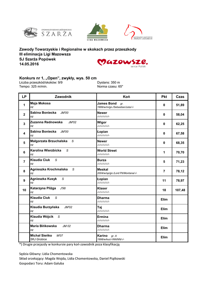 Zawody Towarzyskie i Regionalne w skokach przez przeszkody III eliminacja Ligi Mazowsza SJ Szarża Popówek 14.05.2016 Konkurs nr 1, „Open”, zwykły, wys. 50 cm Liczba przeszkód/skoków: 9/9 Tempo: 325 m/min. LP 1 2 3 4 5 6 7 8 9 10 Dystans: 350 m Norma czasu: 65" Koń Zawodnik Maja Mokosa James Bond gr. 1999/w/m/gn./Sebastian/Juta/-/- nz Sabina Boniecka Newer JM'00 nz -/-/-/-/-/-/-/- Zuzanna Rednowska JM'02 nz -/-/-/-/-/-/-/- Sabina Boniecka Łopian JM'00 nz -/-/-/-/-/-/-/- Małgorzata Brzuchalska S nz World Street S nz -/-/-/-/-/-/-/- Burza S nz -/-/-/-/-/-/-/- Agnieszka Krochmalska nz -/-/-/-/-/-/-/- Katarzyna Pliżga J'98 nz Klaser -/-/-/-/-/-/-/- Dharma S nz -/-/-/-/-/-/-/- Klaudia Burzyńska JM'02 nz Taj -/-/-/-/-/-/-/- Klaudia Wójcik Ermina S nz -/-/-/-/-/-/-/- Maria Bińkowska JM 02 nz SKJ Grobice Meskal Łopian S nz Michał Sieńko S 2004/w/sp/gn./Lord Pit/Montana/-/- Agnieszka Kusyk Klaudia Ciuk Newer -/-/-/-/-/-/-/- Karolina Wierzbicka Klaudia Ciuk Wigor Dharma -/-/-/-/-/-/-/- M'07 Karino gr. A 1998/w/kuc/-/NN/NN/-/- *) Drugie przejazdy w konkursie pary koo-zawodnik poza klasyfikacją Sędzia Główny: Lidia Chomentowska Skład orzekający: Magda Wojda, Lidia Chomentowska, Daniel Piątkowski Gospodarz Toru: Adam Galuba Pkt Czas 0 51,89 0 58,04 0 62,25 0 67,58 0 68,35 1 70,70 5 71,23 7 78,12 11 78,97 18 107,48 Elim Elim Elim Elim Elim Zawody Towarzyskie i Regionalne w skokach przez przeszkody III eliminacja Ligi Mazowsza SJ Szarża Popówek 14.05.2016 Konkurs nr 2, „Open”, zwykły, wys. 60-70 cm Liczba przeszkód/skoków: 9/9 Tempo: 325 m/min. LP 1 2 3 4 5 6 7 8 9 10 11 12 13 14 15 Dystans: 350 m Norma czasu: 65" Koń Zawodnik Jagna Grabowska M'05 KU AZS UW Warszawa Filip gr. B 1992/o/kuc/izab./Epos/Filia/-/- Karolina Wierzbicka Andor S nz gr. D -/-/-/-/-/-/-/- Krystyna Piątkowska JM'02 TKKF Podkowa Szafir -/-/-/-/-/-/-/- Elżbieta Borowska JM'01 Markiz KJ Aldragho Piaseczno -/w/mk/kara/-/-/-/- Katarzyna Booth Kapsel S gr. D 2001/w/t.prym./mysz./NN/NN/-/- TKKF Podkowa Zuzanna Rednowska JM'02 nz Wigor -/-/-/-/-/-/-/- Helena Piekarczyk J'00 Kapsel TKKF Podkowa gr. D 2001/w/t.prym./mysz./NN/NN/-/- Paulina Godlewska Filozofia gr. D 1997/k/kuc/kara/NN/NN/-/- TKKF Podkowa Weronika Grabowska S nz -/-/-/-/-/-/-/- Urszula Prokopek S nz Dalia S nz -/-/-/-/-/-/-/- Klaudia Burzyńska JM'02 nz Bunio -/-/-/-/-/-/-/- Karina Daniłowska JM'03 nz Naomi 2006/k/sp/c.gn./Golden Boy/Nansza/-/- Bunio S nz Katarzyna Pliżga -/-/-/-/-/-/-/- J'98 nz Małgorzata Kryger Urszula Prokopek Klaser -/-/-/-/-/-/-/- S nz nz Etos -/-/-/-/-/-/-/- Agnieszka Kusyk Klaudia Wójcik Sky Wind Etos -/-/-/-/-/-/-/- S Dalia -/-/-/-/-/-/-/- *) Drugie przejazdy w konkursie pary koo-zawodnik poza klasyfikacją Sędzia Główny: Lidia Chomentowska Skład orzekający: Lidia Chomentowska, Magda Wojda, Daniel Piątkowski Gospodarz Toru: Adam Galuba Pkt Czas 0 44,68 0 51,41 0 53,43 0 53,46 0 54,03 0 56,76 0 57,69 0 58,20 0 59,31 0 59,99 0 62,26 0 65,42 6 73,22 7 78,41 7 79,95 Elim Elim Zawody Towarzyskie i Regionalne w skokach przez przeszkody III eliminacja Ligi Mazowsza SJ Szarża Popówek 14.05.2016 Konkurs nr 3, Kuce „Open” dokładności, wys. 60 cm Liczba przeszkód/skoków: 10/11 Tempo: 325 m/min. LP 1-10. 1-10. 1-10. 1-10. 1-10. 1-10. 1-10. 1-10. 1-10. 1-10. 11 12 Dystans: 420 m Norma czasu: 78" Koń Zawodnik Roksana Naumiuk M'06 JM'04 JM'02 P-Dalila 0 59,01 6 Karino 0 62,55 6 Wiking 0 64,25 6 0 65,33 6 0 65,64 6 Klarysa 0 66,02 6 gr. D 2002/-/kuc/gn./Dybicz/Wenus/-/- nz Karolina Karczewska JM'04 KU AZS UW Warszawa Karolina Klusek Małgorzata Głuchowska Milcroft Viva gr. C 2009/k/k.wal./kaszt./Cwrtycadno Caradog/ Milcroft Dahlia/-/- Poezja II gr. C M'05 KJ Akademia Kucania Dawidy 2006/k/kuc/siwa/Bambo/Proza/-/- JM'02 TKKF Podkowa Daria Danieluk Pkt LM gr. A 1998/w/kuc/-/NN/NN/-/- SKJ Grobice Julia Kokot Czas gr. C 2006/k/kuc/Di Caprio PP/Pabi/-/- bpk MAZ Anna Sieńko Pkt gr. A 2001/k/kuc/c.kaszt./NN/NN/-/- Klarysa TKKF Podkowa gr. A 2001/k/kuc/c.kaszt./NN/NN/-/- 0 67,12 6 Zofia Okoń JM'03 Polski Polo Klub Brochów Pinio gr. 0 68,63 6 Julia Malinowska Tangens gr. C 0 72,96 6 0 76,40 6 JM'02 1999/-/kuc/siwa/Jantar/Pepita/-/- JM'03 KJ Aldragho Piaseczno Maria Bińkowska 2004/w/kuc/kaszt./NN/Nn/-/- JM 02 nz Andor gr. D -/-/-/-/-/-/-/- Aleksandra Morawska Filozofia TKKF Podkowa gr. D 1997/k/kuc/kara/NN/NN/-/- 4 74,28 Karolina Bar JM'04 KU AZS UW Warszawa Lukrecja 5 80,62 Karolina Bar JM'04 KU AZS UW Warszawa Iguana Dany's Girl gr. C Julia Kokot Wiking nz JM'02 JM'02 gr. A 2006/k/kuc/gn./Lukas/Gwiazdka/-/- -/-/-/-/-/-/-/gr. D 2002/-/kuc/gn./Dybicz/Wenus/-/- Sędzia Główny: Lidia Chomentowska Skład orzekający: Julia Marciniak, Lidia Chomentowska, Daniel Piątkowski Gospodarz Toru: Adam Galuba Elim Rez Zawody Towarzyskie i Regionalne w skokach przez przeszkody III eliminacja Ligi Mazowsza SJ Szarża Popówek 14.05.2016 Konkurs nr 4, Kuce i MK, dokładności z rozgrywką, wys. 80 cm Liczba przeszkód/skoków: 10/11; 6/7 Tempo: 325 m/min. Dystans: 420"; 240" Norma czasu: 78"; 47" Przejazd podst. LP 1 2 3 4 5 6 7-8. 7-8. 9 10-11. 10-11. Koń Zawodnik Karol Jerzak Filejka gr. D S KJ Dworek Okuniew 2001/k/kuc/gn./Suseł/Figa/-/- Marianna Dunajska JM'04 KU AZS UW Warszawa 1996/w/kuc/gn./Pablo/Pora/-/- Zofia Palczewska JM'03 Polski Polo Klub Brochów Wiktoria Żelazny Poranek gr. D Rozgywka Pkt Czas Pkt Czas Pkt LM 0 60,50 0 34,58 6 0 67,85 0 36,75 6 0 67,83 0 38,09 6 Karmel gr. D 2000/o/kuc/gn./Linde's Rob/Karmalita Golden Girl//- Andros GB SJ Szarża Popówek gr. D 2003/w/kuc/-/Karino GB/Andora GB/-/- 0 59,43 4 30,96 6 Karolina Bar JM'04 KU AZS UW Warszawa Iguana Dany's Girl gr. C 0 72,46 4 35,60 6 Karolina Klusek M'05 KJ Akademia Kucania Dawidy Poezja II gr. C 0 70,25 4 39,15 6 Jagna Grabowska Filip gr. B 4 73,54 P-Dalila 4 67,05 Gardenia gr. D 8 93,58 11 103,43 11 89,85 19 87,42 JM'04 -/-/-/-/-/-/-/- M'05 KU AZS UW Warszawa Roksana Naumiuk 2006/k/kuc/siwa/Bambo/Proza/-/- 1992/o/kuc/izab./Epos/Filia/-/- M'06 bpk M