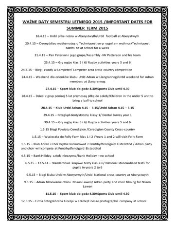 WAŻNE DATY SEMESTRU LETNIEGO 2015 /IMPORTANT DATES FOR SUMMER TERM 2015 16.4.15 – Urdd piłka nożna w Aberystwyth/Urdd football at Aberystwyth 20.4.15 – Deunyddiau mathemateg o Techniquest yn yr ysgol am wythnos/Techniquest Maths Kit at school for a week 21.4.15 – Pan Paterson i jego grupa/Assembly -Mr Patterson and his team 23.4.15 – Gry rugby klas 5 i 6/ Rugby activities years 5 and 6 24.4.15 – Biegi, zwody w Lampeter/ Lampeter area cross-country competition 24.4.15 – Weekend dla członków klubu Urdd Adran w Llangrannog/Urdd weekend for Adran members at Llangrannog 27.4.15 – Sport klub do godz 4.30/Sports Club until 4.30 28.4.15 – Dzieci z grup ponizej 5 lat przynoszą piłkę do szkoły/Children in the under 5 unit to bring a ball to school 28.4.15 – Klub Urdd Adran 4.15 - 5.15/Urdd Adran 4.15 – 5.15 29.4.15 – Przegląd dentystyczny klasy 1/ Dental Survey year 1 30.4.15 – Gry rugby klas 5 i 6/ Rugby activities years 5 and 6 1.5.15 Biegi Powiatu Ceredigion /Ceredigion County Cross-country 1.5.15 – Wycieczka do Folly Farm klas 1 I 2 /Years 1 and 2 will visit Folly Farm 1.5.15 – Klub Adran i Chór będzie konkurował z Pontrhydfendigaid Eisteddfod / Adran party and choir will compete at Pontrhydfendigaid Eisteddfod 4.5.15 – Bank Hiliday- szkoła nieczynna/Bank Holiday – no school 6.5.15 – 12.5.14 – Standardowe krajowe testy klas 2-6/ National standardised tests for pupils in years 2 to 6 9.5.15 – Biegi klubu Urdd w Aberystwyth/Urdd National cross country at Aberystwyth 9.5.15 – Adran filmowanie chóru Noson Lawen/ Adran party and choir filming for Noson Lawen 11.5.15 - Sport klub do godz 4.30/Sports Club until 4.30 12.5.15 – Firma fotograficzna Finezja w szkole/Finesse photographic company at school 12.5.15 – Klub Urdd Adran 4.15 - 5.15/Urdd Adran 4.15 – 5.15 18.5.15 – Sport klub do 4.30/Sports Club until 4.30 18/05/15 – Spotkanie PTA godzina 19:00 /PTA meeting 7.00 20.5.15 –Ysgol Bro Pedr gry i zabawy dla uczniów Foundation Phase/Urdd Fun games for Foundation Phase members at Bro Pedr 25.5.15- 29.5.15 – Przerwa semestrowa /Half Term Uczniowie konkurują z narodowym klubem Urdd Eisteddfod / Pupils from school competing at the National Urdd Eisteddfod) 3.6.15 – Występy dla klas 4 Creuddyn, 5 Cothi i 6 Grannell/ Lleuad yn olau show for years 4 Creuddyn, 5 Cothi and 6 Grannell 15.6.15 – Praktyki chóru Powiatu Ceredigion w Aberaeron klas 6 – bl 6/ Ceredigion choir practice for pupils in years 6 at Aberaeron hall 17.6.15 – Dzień sportu/School Sports 22.6.15 – Wycieczka klas 6 do Pendine na tydzień /Year 6 at Pendine for the week 26.6.15 – Występ “Patagonia” klasy 4 i 5 /Show – “Patagonia” Bl/Yrs 4/5 30.6.15 – PTA targi letnie/ PTA Summer Fair 7.7.15 – Urdd dzień zabaw dla klas 3,4,5 a 6./Urdd Fun Day for members in years 3,4,5 and 6 7.7.15 – Studniówki w Aberystwyth godz 19:00/Ceredigion Proms at Aberystwyth 7.00pm 10.7.15 – Raporty dla rodziców/Reports to parents 10.7.15 – Wycieczka dla dzieci z przeczkola cołodnowego i reception /Trip for full time Nursery and reception pupils 14.7.15 – Wieczorek zapoznawczy dla rodziców i ich dzieci które zaczynają przeczkole/ Introductory evening for new parents and Nursery pupils. 17.7.15 – OSTATNI DZIEŃ SZKOŁY PRZED WAKACJAMI/SCHOOL CLOSES FOR THE SUMMER 1.9.15 –INSET szkoła nieczynna dla dzieci/No school for pupils 2.9.15 – POWRÓT DZIECI DO SZKOŁY /SCHOOL RE-OPENS FOR PUPILS