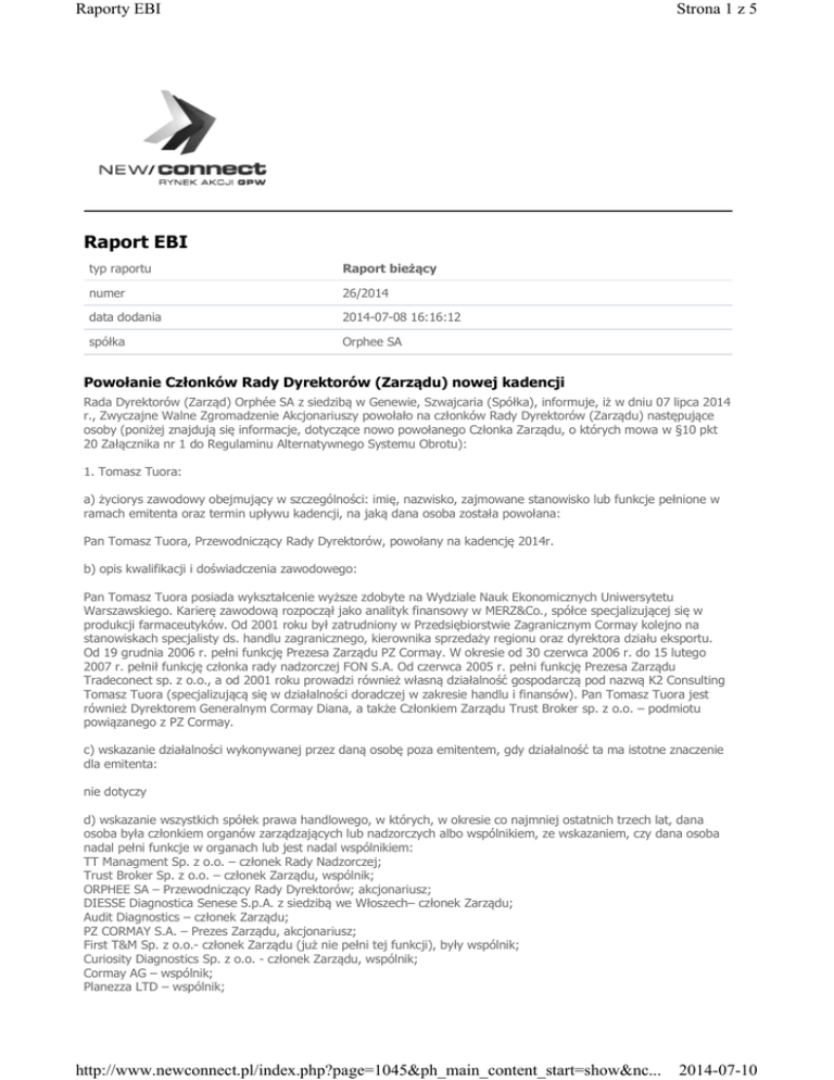 Raporty EBI Strona 1 z 5 Raport EBI typ raportu Raport bieżący numer 26/2014 data dodania 2014-07-08 16:16:12 spółka Orphee SA Powołanie Członków Rady Dyrektorów (Zarządu) nowej kadencji Rada Dyrektorów (Zarząd) Orphée SA z siedzibą w Genewie, Szwajcaria (Spółka), informuje, iż w dniu 07 lipca 2014 r., Zwyczajne Walne Zgromadzenie Akcjonariuszy powołało na członków Rady Dyrektorów (Zarządu) następujące osoby (poniżej znajdują się informacje, dotyczące nowo powołanego Członka Zarządu, o których mowa w §10 pkt 20 Załącznika nr 1 do Regulaminu Alternatywnego Systemu Obrotu): 1. Tomasz Tuora: a) życiorys zawodowy obejmujący w szczególności: imię, nazwisko, zajmowane stanowisko lub funkcje pełnione w ramach emitenta oraz termin upływu kadencji, na jaką dana osoba została powołana: Pan Tomasz Tuora, Przewodniczący Rady Dyrektorów, powołany na kadencję 2014r. b) opis kwalifikacji i doświadczenia zawodowego: Pan Tomasz Tuora posiada wykształcenie wyższe zdobyte na Wydziale Nauk Ekonomicznych Uniwersytetu Warszawskiego. Karierę zawodową rozpoczął jako analityk finansowy w MERZ&Co., spółce specjalizującej się w produkcji farmaceutyków. Od 2001 roku był zatrudniony w Przedsiębiorstwie Zagranicznym Cormay kolejno na stanowiskach specjalisty ds. handlu zagranicznego, kierownika sprzedaży regionu oraz dyrektora działu eksportu. Od 19 grudnia 2006 r. pełni funkcję Prezesa Zarządu PZ Cormay. W okresie od 30 czerwca 2006 r. do 15 lutego 2007 r. pełnił funkcję członka rady nadzorczej FON S.A. Od czerwca 2005 r. pełni funkcję Prezesa Zarządu Tradeconect sp. z o.o., a od 2001 roku prowadzi również własną działalność gospodarczą pod nazwą K2 Consulting Tomasz Tuora (specjalizującą się w działalności doradczej w zakresie handlu i finansów). Pan Tomasz Tuora jest również Dyrektorem Generalnym Cormay Diana, a także Członkiem Zarządu Trust Broker sp. z o.o. – podmiotu powiązanego z PZ Cormay. c) wskazanie działalności wykonywanej przez daną osobę poza emitentem, gdy działalność ta ma istotne znaczenie dla emitenta: nie dotyczy d) wskazanie wszystkich spółek prawa handlowego, w których, w okresie co najmniej ostatnich trzech lat, dana osoba była członkiem organów zarządzających lub nadzorczych albo wspólnikiem, ze wskazaniem, czy dana osoba nadal pełni funkcje w organach lub jest nadal wspólnikiem: TT Managment Sp. z o.o. – członek Rady Nadzorczej; Trust Broker Sp. z o.o. – członek Zarządu, wspólnik; ORPHEE SA – Przewodniczący Rady Dyrektorów; akcjonariusz; DIESSE Diagnostica Senese S.p.A. z siedzibą we Włoszech– członek Zarządu; Audit Diagnostics – członek Zarządu; PZ CORMAY S.A. – Prezes Zarządu, akcjonariusz; First T&M Sp. z o.o.- członek Zarządu (już nie pełni tej funkcji), były wspólnik; Curiosity Diagnostics Sp. z o.o. - członek Zarządu, wspólnik; Cormay AG – wspólnik; Planezza LTD – wspólnik; http://www.newconnect.pl/index.php?page=1045&ph_main_content_start=show&nc... 2014-07-10 Raporty EBI Strona 2 z 5 e) informacje na temat prawomocnych wyroków, na mocy których dana osoba została skazana za przestępstwa oszustwa w okresie co najmniej ostatnich pięciu lat oraz wskazanie, czy w okresie co najmniej ostatnich pięciu lat osoba taka otrzymała sądowy zakaz działania jako członek organów zarządzających lub nadzorczych w spółkach prawa handlowego: nie dotyczy f) szczegóły wszystkich przypadków upadłości, zarządu komisarycznego lub likwidacji, w okresie co najmniej ostatnich pięciu lat, w odniesieniu do podmiotów, w których dana osoba pełniła funkcje członka organu zarządzającego lub nadzorczego: nie dotyczy g) informację, czy dana osoba prowadzi działalność, która jest konkurencyjna w stosunku do działalności emitenta, oraz czy jest wspólnikiem konkurencyjnej spółki cywilnej lub osobowej albo członkiem organu spółki kapitałowej lub członkiem organu jakiejkolwiek konkurencyjnej osoby prawnej: nie dotyczy h) informację, czy dana osoba figuruje w rejestrze dłużników niewypłacalnych, prowadzonym na podstawie ustawy z dnia 20 sierpnia 1997 r. o Krajowym Rejestrze Sądowym: Pan Tomasz Tuora nie figuruje w w/w rejestrze. 2. Katarzyna Jackowska a) życiorys zawodowy obejmujący w szczególności: imię, nazwisko, zajmowane stanowisko lub funkcje pełnione w ramach emitenta oraz termin upływu kadencji, na jaką dana osoba została powołana: Katarzyna Jackowska, członek Rady Dyrektorów (Zarządu), wybrana na kadencję 2014r. b) opis kwalifikacji i doświadczenia zawodowego: Pani Katarzyna Jackowska ukończyła architekturę na Politechnice Warszawskiej z tytułem mgr inż. arch. Studiowała także na Eidgenössische Technische Hochschule w Zurychu. Następnie pracowała w znanych firmach architektonicznych, w tym w Herzog & de Meuron (w latach 2003-2007), gdzie pozyskała doświadczenie w międzynarodowej pracy zespołowej oraz na rynkach zagranicznych. W latach 2007-2013 prowadziła wykłady dla studentów pierwszego roku Wydziału Architektury na Eidgenössische Technische Hochschule w Zurychu. Od 2013 roku wykłada na Hochschule Luzern. Także w 2007 roku założyła firmę Jackowska Architektur und Gestaltung, z siedzibą w Zurichu. Począwszy od 2010 roku pełni także funkcję członka Rady Dyrektorów Orphée. c) wskazanie działalności wykonywanej przez daną osobę poza emitentem, gdy działalność ta ma istotne znaczenie dla emitenta: nie dotyczy d) wskazanie wszystkich spółek prawa handlowego, w których, w okresie co najmniej ostatnich trzech lat, dana osoba była członkiem organów zarządzających lub nadzorczych albo wspólnikiem, ze wskazaniem, czy dana osoba nadal pełni funkcje w organach lub jest nadal wspólnikiem: Poza pełnieniem funkcji członka Rady Dyrektorów Orphée SA od 2010 r. Pani Katarzyna Jackowska nie była w w/w okresie wspólnikiem w spółkach kapitałowych i osobowych ani ni