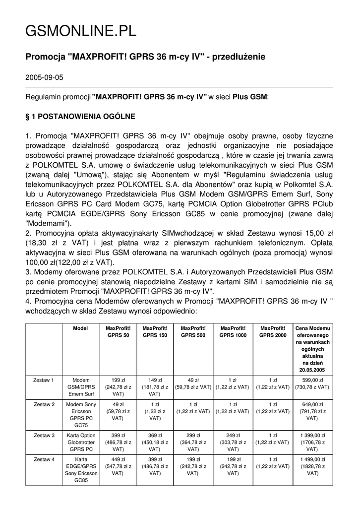 5. Promocja "MAXPROFIT! GPRS 36 m-cy IV " trwa od20.05.2005 r. i jest ograniczona