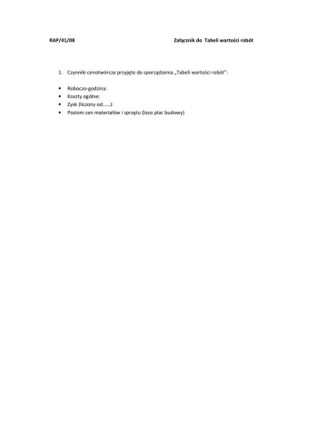 RAP/41/08 Załącznik do Tabeli wartości robót 1. Czynniki cenotwórcze przyjęte do sporządzenia „Tabeli wartości robót”: • • • • Roboczo-godzina: Koszty ogólne: Zysk (liczony od……): Poziom cen materiałów i sprzętu (loco plac budowy)