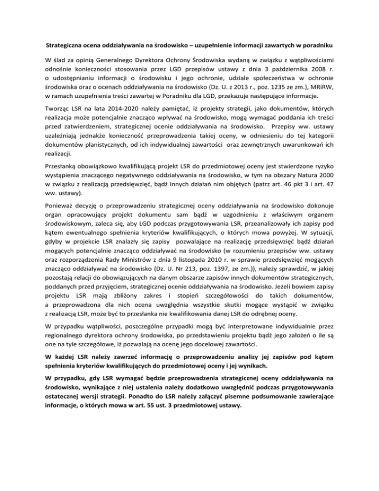 Strategiczna ocena oddziaływania na środowisko – uzupełnienie informacji zawartych w poradniku W ślad za opinią Generalnego Dyrektora Ochrony Środowiska wydaną w związku z wątpliwościami odnośnie konieczności stosowania przez LGD przepisów ustawy z dnia 3 października 2008 r. o udostępnianiu informacji o środowisku i jego ochronie, udziale społeczeństwa w ochronie środowiska oraz o ocenach oddziaływania na środowisko (Dz. U. z 2013 r., poz. 1235 ze zm.), MRiRW, w ramach uzupełnienia treści zawartej w Poradniku dla LGD, przekazuje następujące informacje. Tworząc LSR na lata 2014-2020 należy pamiętać, iż projekty strategii, jako dokumentów, których realizacja może potencjalnie znacząco wpływać na środowisko, mogą wymagać poddania ich treści przed zatwierdzeniem, strategicznej ocenie oddziaływania na środowisko. Przepisy ww. ustawy uzależniają jednakże konieczność przeprowadzenia takiej oceny, w odniesieniu do tej kategorii dokumentów planistycznych, od ich indywidualnej zawartości oraz zewnętrznych uwarunkowań ich realizacji. Przesłanką obowiązkowo kwalifikującą projekt LSR do przedmiotowej oceny jest stwierdzone ryzyko wystąpienia znaczącego negatywnego oddziaływania na środowisko, w tym na obszary Natura 2000 w związku z realizacją przedsięwzięć, bądź innych działań nim objętych (patrz art. 46 pkt 3 i art. 47 ww. ustawy). Ponieważ decyzję o przeprowadzeniu strategicznej oceny oddziaływania na środowisko dokonuje organ opracowujący projekt dokumentu sam bądź w uzgodnieniu z właściwym organem środowiskowym, zaleca się, aby LGD podczas przygotowywania LSR, przeanalizowały ich zapisy pod kątem ewentualnego spełnienia kryteriów kwalifikujących, o których mowa powyżej. W sytuacji, gdyby w projekcie LSR znalazły się zapisy pozwalające na realizację przedsięwzięć bądź działań mogących potencjalnie znacząco oddziaływać na środowisko (w rozumieniu przepisów ww. ustawy oraz rozporządzenia Rady Ministrów z dnia 9 listopada 2010 r. w sprawie przedsięwzięć mogących znacząco oddziaływać na środowisko (Dz. U. Nr 213, poz. 1397, ze zm.)), należy sprawdzić, w jakiej pozostają relacji do obowiązujących na danym obszarze zapisów innych dokumentów strategicznych, poddanych przed przyjęciem, strategicznej ocenie oddziaływania na środowisko. Jeżeli bowiem zapisy projektu LSR mają zbliżony zakres i stopień szczegółowości do takich dokumentów, a przeprowadzona dla nich ocena uwzględnia wszystkie skutki mogące wystąpić w związku z realizacją LSR, może być to przesłanka nie kwalifikowania danej LSR do odrębnej oceny. W przypadku wątpliwości, poszczególne przypadki mogą być interpretowane indywidualnie przez regionalnego dyrektora ochrony środowiska, po przedstawieniu projektu bądź jego założeń o ile są one na tyle szczegółowe, iż pozwalają na ocenę jego docelowej zawartości. W każdej LSR należy zawrzeć informację o przeprowadzeniu analizy jej zapisów pod kątem spełnienia kryteriów kwalifikujących do przedmiotowej oceny i jej wynikach. W przypadku, gdy LSR wymagać będzie przeprowadzenia strategicznej oceny oddziaływania na środowisko, wynikające z niej ustalenia należy dodatkowo uwzględnić podczas przygotowywania ostatecznej wersji strategii. Ponadto do LSR należy załączyć pisemne podsumowanie zawierające informacje, o których mowa w art. 55 ust. 3 przedmiotowej ustawy. Wybrane artykuły ustawy z dnia 3 października 2008 r. o udostępnianiu informacji o środowisku i jego ochronie, udziale społeczeństwa w ochronie środowiska oraz o ocenach oddziaływania na środowisko (Dz. U. z 2013 r., poz. 1235 ze zm.) 1) 2) 3) Art. 46. Przeprowadzenia strategicznej oceny oddziaływania na środowisko wymagają projekty: koncepcji przestrzennego zagospodarowania kraju, studium uwarunkowań i kierunków zagospodarowania przestrzennego gminy, planów zagospodarowania przestrzennego oraz strategii rozwoju regionalnego; polityk, strategii, planów lub programów w dziedzinie przemysłu, energetyki, transportu, telekomunikacji, gospodarki wodnej, gospodarki odpadami, leśnictwa, rolnictwa, rybołówstwa, turystyki i wykorzystywania terenu, opracowywanych lub przyjmowanych przez organy administracji, wyznaczających ramy dla późniejszej realizacji przedsięwzięć mogących znacząco oddziaływać na środowisko; polityk, strategii, planów lub programów innych niż wymienione w pkt 1 i 2, których realizacja może spowodować znaczące oddziaływanie na obszar Natura 2000 jeżeli nie są one bezpośrednio związane z ochroną obszaru Natura 2000 lub nie wynikają z tej ochrony. Art. 47. Przeprowadzenie strategicznej oceny oddziaływania na środowisko jest wymagane także w przypadku projektów dokumentów, innych niż wymienione w art. 46, jeżeli w uzgodnieniu z właściwym organem, o którym mowa w art. 57, organ opracowujący projekt dokumentu stwierdzi, że wyznaczają one ramy dla późniejszej realizacji przedsięwzięć mogących znacząco oddziaływać na środowisko lub że realizacja postanowień tych dokumentów może spowodować znaczące oddziaływanie na środowisko. Art. 55. 3. Do przyjętego dokumentu załącza się pisemne podsumowanie zawierające uzasadnienie wyboru przyjętego dokumentu w odniesieniu do rozpatrywanych rozwiązań alternatywnych, a także informację, w jaki sposób zostały wzięte pod uwagę i w jakim zakresie zostały uwzględnione: 1) ustalenia zawarte w prognozie oddziaływania na środowisko; 2) opinie właściwych organów, o których mowa w art. 57 i 58; 3) zgłoszone uwagi i wnioski; 4) wyniki postępowania dotyczącego transgranicznego oddziaływania na środowisko, jeżeli zostało przeprowadzone; 5) propozycje dotyczące metod i częstotliwości przeprowadzania monitoringu skutków realizacji postanowień dokumentu.