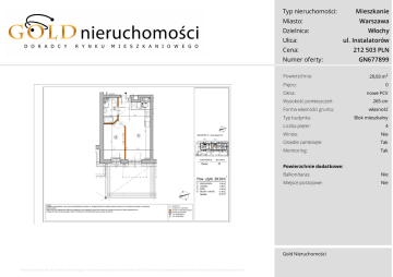 Typ nieruchomości: Mieszkanie Miasto: Warszawa Dzielnica: Włochy Ulica: ul. Instalatorów Cena: 212 503 PLN Numer oferty: Powierzchnia: Piętro: Okna: GN677899 29,93 m2 0 nowe PCV Wysokość pomieszczeń: 265 cm Forma własności gruntu: własność Typ budynku: Blok mieszkalny Liczba pięter: 4 Winda: Nie Osiedle zamknięte: Tak Monitoring: Tak Powierzchnie dodatkowe: Balkon/taras: Nie Miejsce postojowe: Nie Gold Nieruchomości Powyższa oferta ma charakter informacyjny i nie stanowi oferty w rozumieniu art.66 $1 kodeksu cywilnego oraz innych właściwych przepsiów prawnych. Typ nieruchomości: Mieszkanie Miasto: Warszawa Dzielnica: Włochy Ulica: ul. Instalatorów Cena: 212 503 PLN Numer oferty: Powierzchnia: Piętro: Okna: GN677899 29,93 m2 0 nowe PCV Wysokość pomieszczeń: 265 cm Forma własności gruntu: własność Typ budynku: Blok mieszkalny Liczba pięter: 4 Winda: Nie Osiedle zamknięte: Tak Monitoring: Tak Powierzchnie dodatkowe: Balkon/taras: Nie Miejsce postojowe: Nie Gold Nieruchomości Powyższa oferta ma charakter informacyjny i nie stanowi oferty w rozumieniu art.66 $1 kodeksu cywilnego oraz innych właściwych przepsiów prawnych. Typ nieruchomości: Mieszkanie Miasto: Warszawa Dzielnica: Włochy Ulica: ul. Instalatorów Cena: 212 503 PLN Numer oferty: Opis Powierzchnia: Piętro: GN677899 29,93 m2 0 Na obszarze ponad 8 hektarów, powstaje nowa przestrzeń mieszkalna wraz z infrastrukturą handlową i użytkową. Prezentowane osiedle to kolejna inwestycja mieszkaniowa, znajdująca się w szybko zmieniającej swój charakter warszawskiej dzielnicy Włochy, w sąsiedztwie Parku Szczęśliwickiego i Alei Krakowskiej. Okna: Rozpoczęcie prac budowlanych nastąpiło w kwietniu 2013 roku, inwestycja zakłada budowę około 2000 mieszkań, sieci ulic wewnętrznych wraz z małą architekturą. Planowany czas trwania inwestycji to 6 lat. Typ budynku: Blok mieszkalny Liczba pięter: 4 Oferta z rynku pierwotnego klient nie ponosi dodatkowych kosztów związanych z wynagrodzeniem pośrednika oraz PCC. nowe PCV Wysokość pomieszczeń: 265 cm Forma własności gruntu: własność Winda: Nie Osiedle zamknięte: Tak Monitoring: Tak Powierzchnie dodatkowe: Balkon/taras: Nie Miejsce postojowe: Nie Gold Nieruchomości Powyższa oferta ma charakter informacyjny i nie stanowi oferty w rozumieniu art.66 $1 kodeksu cywilnego oraz innych właściwych przepsiów prawnych.