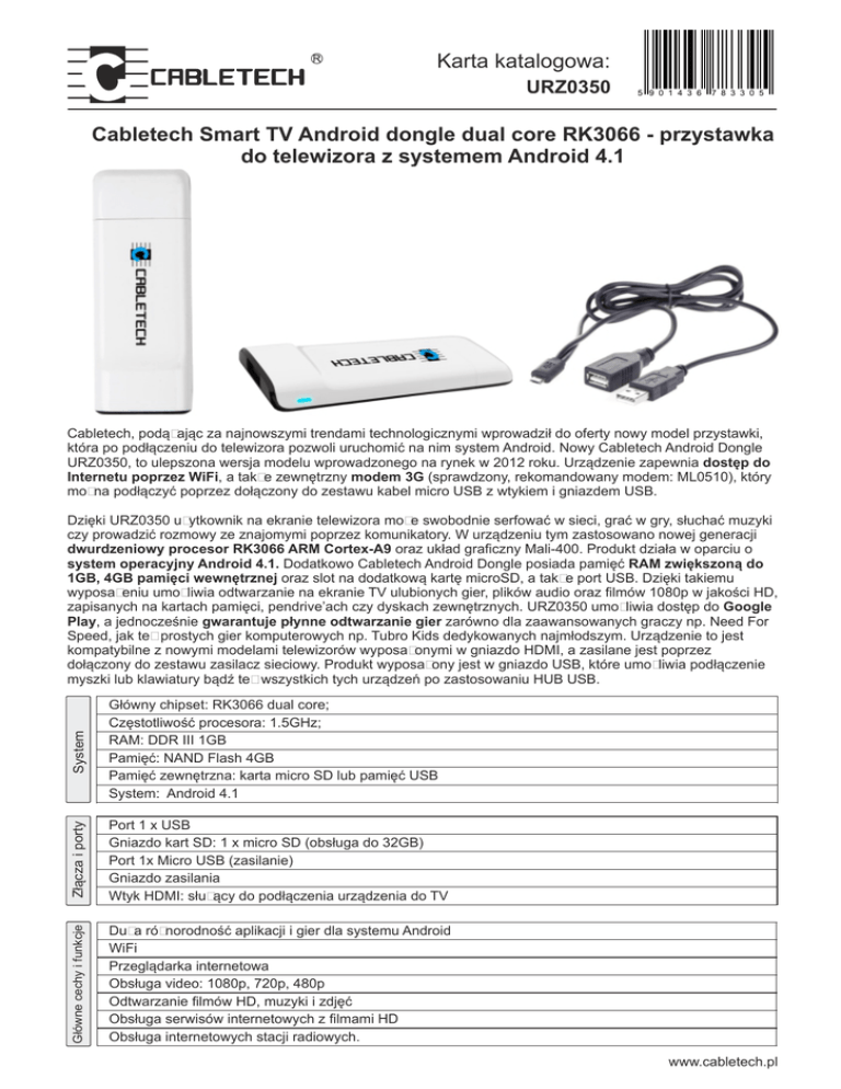 Karta katalogowa: URZ0350 5 9 0 1 4 3 6 7 8 3 3 0 5 Cabletech Smart TV Android dongle dual core RK3066 - przystawka do telewizora z systemem Android 4.1 Cabletech, podążając za najnowszymi trendami technologicznymi wprowadził do oferty nowy model przystawki, która po podłączeniu do telewizora pozwoli uruchomić na nim system Android. Nowy Cabletech Android Dongle URZ0350, to ulepszona wersja modelu wprowadzonego na rynek w 2012 roku. Urządzenie zapewnia dostęp do Internetu poprzez WiFi, a także zewnętrzny modem 3G (sprawdzony, rekomandowany modem: ML0510), który można podłączyć poprzez dołączony do zestawu kabel micro USB z wtykiem i gniazdem USB. System Główny chipset: RK3066 dual core; Częstotliwość procesora: 1.5GHz; RAM: DDR III 1GB Pamięć: NAND Flash 4GB Pamięć zewnętrzna: karta micro SD lub pamięć USB System: Android 4.1 Złącza i porty Port 1 x USB Gniazdo kart SD: 1 x micro SD (obsługa do 32GB) Port 1x Micro USB (zasilanie) Gniazdo zasilania Wtyk HDMI: służący do podłączenia urządzenia do TV Główne cechy i funkcje Dzięki URZ0350 użytkownik na ekranie telewizora może swobodnie serfować w sieci, grać w gry, słuchać muzyki czy prowadzić rozmowy ze znajomymi poprzez komunikatory. W urządzeniu tym zastosowano nowej generacji dwurdzeniowy procesor RK3066 ARM Cortex-A9 oraz układ graficzny Mali-400. Produkt działa w oparciu o system operacyjny Android 4.1. Dodatkowo Cabletech Android Dongle posiada pamięć RAM zwiększoną do 1GB, 4GB pamięci wewnętrznej oraz slot na dodatkową kartę microSD, a także port USB. Dzięki takiemu wyposażeniu umożliwia odtwarzanie na ekranie TV ulubionych gier, plików audio oraz filmów 1080p w jakości HD, zapisanych na kartach pamięci, pendrive’ach czy dyskach zewnętrznych. URZ0350 umożliwia dostęp do Google Play, a jednocześnie gwarantuje płynne odtwarzanie gier zarówno dla zaawansowanych graczy np. Need For Speed, jak też prostych gier komputerowych np. Tubro Kids dedykowanych najmłodszym. Urządzenie to jest kompatybilne z nowymi modelami telewizorów wyposażonymi w gniazdo HDMI, a zasilane jest poprzez dołączony do zestawu zasilacz sieciowy. Produkt wyposażony jest w gniazdo USB, które umożliwia podłączenie myszki lub klawiatury bądź też wszystkich tych urządzeń po zastosowaniu HUB USB. Duża różnorodność aplikacji i gier dla systemu Android WiFi Przeglądarka internetowa Obsługa video: 1080p, 720p, 480p Odtwarzanie filmów HD, muzyki i zdjęć Obsługa serwisów internetowych z filmami HD Obsługa internetowych stacji radiowych. www.cabletech.pl