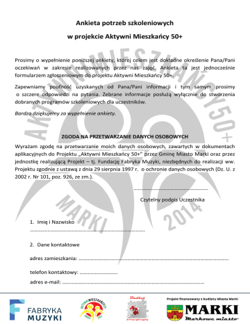 Ankieta potrzeb szkoleniowych w projekcie Aktywni Mieszkańcy 50+ Prosimy o wypełnienie poniższej ankiety, której celem jest dokładne określenie Pana/Pani oczekiwao w zakresie realizowanych przez nas zajęd. Ankieta ta jest jednocześnie formularzem zgłoszeniowym do projektu Aktywni Mieszkaocy 50+. Zapewniamy poufnośd uzyskanych od Pana/Pani informacji i tym samym prosimy o szczere odpowiedzi na pytania. Zebrane informacje posłużą wyłącznie do stworzenia dobranych programów szkoleniowych dla uczestników. Bardzo dziękujemy za wypełnienie ankiety. ZGODA NA PRZETWARZANIE DANYCH OSOBOWYCH Wyrażam zgodę na przetwarzanie moich danych osobowych, zawartych w dokumentach aplikacyjnych do Projektu „Aktywni Mieszkaocy 50+” przez Gminę Miasto Marki oraz przez jednostkę realizującą Projekt – tj. Fundację Fabryka Muzyki, niezbędnych do realizacji ww. Projektu zgodnie z ustawą z dnia 29 sierpnia 1997 r. o ochronie danych osobowych (Dz. U. z 2002 r. Nr 101, poz. 926, ze zm.). ………………………………………………. Czytelny podpis Uczestnika 1. Imię i Nazwisko …………………………………………………………………………. 2. Dane kontaktowe adres zamieszkania: ………………………………………………………………………………………………… telefon kontaktowy: ………..…………….. adres e-mail: …………………………………………………………………………………………… 3. Wiek: …………. 4. Czy brał Pan/Pani już udział w szkoleniach, zajęciach artystycznych lub sportowych? TAK (proszę wskazad w jakich) …………………………………………………………………………………………………………………………………… …………………………………………………………………………………………………………………………………… …………………………………………………………………………………………………………………………………… …………………………………………………………………………………………………………………………………… NIE 5. Jak ocenia Pan/ Pani swoją sprawnośd fizyczną (proszę o wybór jednej odpowiedzi, najlepiej odpowiadającej Pana/Pani odczuciom) bardzo dobrze, regularnie uprawiam sport dobrze, nie mam większych ograniczeo ruchowych umiarkowanie, mogłoby byd lepiej raczej źle 6. Poniżej znajduje się tabelka z dostępnymi modułami zajęd. Proszę zaznaczyd cyframi od 1 do 4 zajęcia, w których chciałby Pan/Pani wziąd udział. Gdzie: 1 – interesuje mnie najbardziej, a 4 – interesuje mnie najmniej. Może Pan/Pani wybrad od 2 do maksymalnie 4 modułów zajęd. MODUŁ ZAJĘĆ STOPIEO ZAINTERESOWANIA OCENY OD 1 DO 4 PROFILAKTYKA ZDROWIA PIERWSZA POMOC ZAJĘCIA ARTYSTYCZNE ZAJĘCIA KOMPUTEROWE (NOWOCZESNY ŚWIAT) ZAJĘCIA SPORTOWE 7. Jakie tematy z dziedziny profilaktyki zdrowia chciałby Pan/Pani, aby się znalazły w programie?* profilaktyka chorób układu krążenia aktywności fizycznej w profilaktyce zdrowia zagrożenia chorobami neurologicznymi profilaktyka narządu wzroku dieta 50+ rola odpowiedniej diety w chorobach przewlekłych inne (proszę podad jakie) …………………………………………………………………………………………………………………………………… …………………………………………………………………………………………………………………………………… 8. Które zajęcia chciałby Pan/Pani, aby znalazły się w module artystycznym?* decoupage – technika zdobienia przedmiotów tworzenie biżuterii scrapbooking - kartki okolicznościowe z papieru rzeźba w glinie nauka gry na bębnach rysunek i malarstwo haftowanie tworzenie ozdób z filcu inne (proszę podad jakie) …………………………………………………………………………………………………………………………………… …………………………………………………………………………………………………………………………………… 9. Jakie tematy dla zajęd komputerowych (nowoczesny świat) chciałby Pan/Pani, aby znalazły się w programie?* zakładanie poczty elektronicznej, pisanie e-maili, odpowiadanie na wiadomości surfowanie po Internecie – obsługa przeglądarki i jej narzędzi obsługa Gadu-Gadu/Skype i portali typu Nasza Klasa/Facebook zakupy przez Internet bankowośd internetowa media cyfrowe, tj. e-booki, audiobooki, oglądanie filmów i seriali on-line, obsługa arkusza kalkulacyjnego, edytora tekstu np.Word obsługa programu do obróbki zdjęd inne (proszę podad jakie) …………………………………………………………………………………………………………………………………… …………………………………………………………………………………………………………………………………… 10.Jakie zajęcia sportowe chciałby Pan/Pani, aby znalazły się w programie?* gimnastyka z elementami jogi nordic walking – marsz z kijami dwiczenia relaksacyjne gimnastyka korekcyjna body ball – zajęcia wzmacniające z piłką dwiczenia usprawniające przy muzyce zumba gold – połączenie taoców latynoamerykaoskich z elementami fitness dla osób starszych lub początkujących w sporcie gimnastyka rekreacyjna inne (proszę podad jakie) …………………………………………………………………………………………………………………………………… …………………………………………………………………………………………………………………………………… 11. Jakie zajęcia dodatkowe chciałby Pan/Pani, aby znalazły się w programie? chór warsztaty bębniarskie