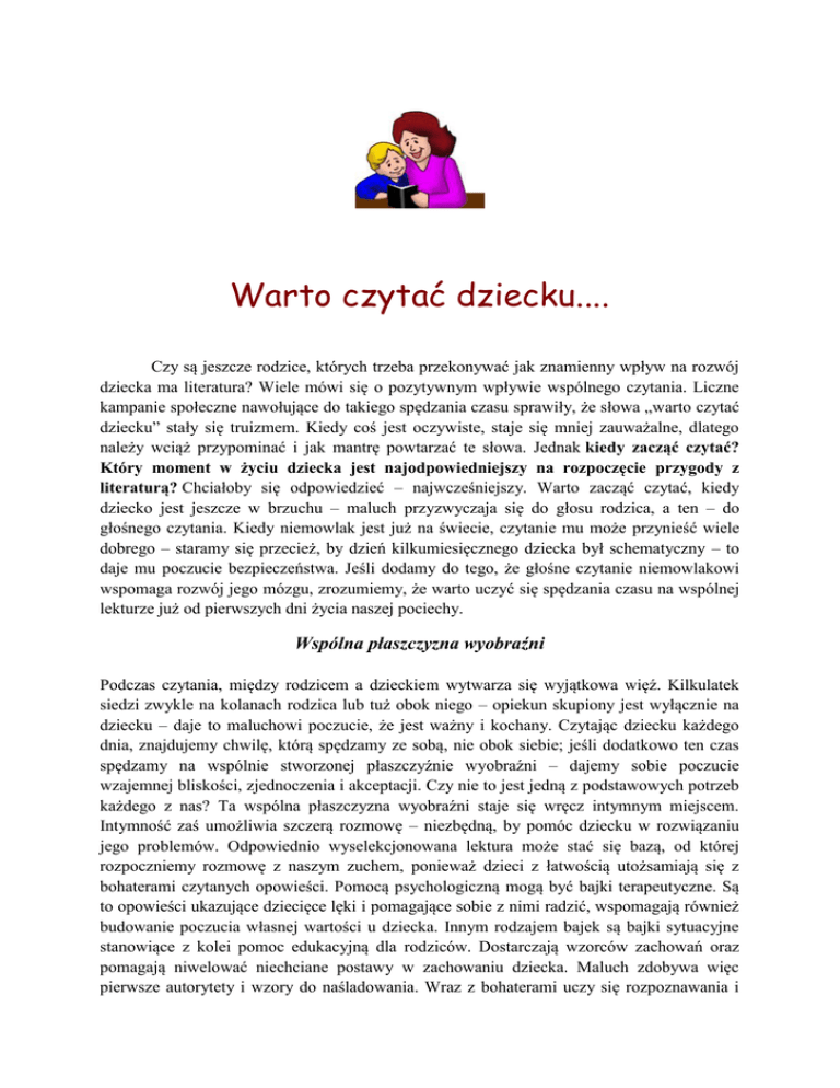 Warto czytać dziecku.... Czy są jeszcze rodzice, których trzeba przekonywać jak znamienny wpływ na rozwój dziecka ma literatura? Wiele mówi się o pozytywnym wpływie wspólnego czytania. Liczne kampanie społeczne nawołujące do takiego spędzania czasu sprawiły, że słowa „warto czytać dziecku” stały się truizmem. Kiedy coś jest oczywiste, staje się mniej zauważalne, dlatego należy wciąż przypominać i jak mantrę powtarzać te słowa. Jednak kiedy zacząć czytać? Który moment w życiu dziecka jest najodpowiedniejszy na rozpoczęcie przygody z literaturą? Chciałoby się odpowiedzieć – najwcześniejszy. Warto zacząć czytać, kiedy dziecko jest jeszcze w brzuchu – maluch przyzwyczaja się do głosu rodzica, a ten – do głośnego czytania. Kiedy niemowlak jest już na świecie, czytanie mu może przynieść wiele dobrego – staramy się przecież, by dzień kilkumiesięcznego dziecka był schematyczny – to daje mu poczucie bezpieczeństwa. Jeśli dodamy do tego, że głośne czytanie niemowlakowi wspomaga rozwój jego mózgu, zrozumiemy, że warto uczyć się spędzania czasu na wspólnej lekturze już od pierwszych dni życia naszej pociechy. Wspólna płaszczyzna wyobraźni Podczas czytania, między rodzicem a dzieckiem wytwarza się wyjątkowa więź. Kilkulatek siedzi zwykle na kolanach rodzica lub tuż obok niego – opiekun skupiony jest wyłącznie na dziecku – daje to maluchowi poczucie, że jest ważny i kochany. Czytając dziecku każdego dnia, znajdujemy chwilę, którą spędzamy ze sobą, nie obok siebie; jeśli dodatkowo ten czas spędzamy na wspólnie stworzonej płaszczyźnie wyobraźni – dajemy sobie poczucie wzajemnej bliskości, zjednoczenia i akceptacji. Czy nie to jest jedną z podstawowych potrzeb każdego z nas? Ta wspólna płaszczyzna wyobraźni staje się wręcz intymnym miejscem. Intymność zaś umożliwia szczerą rozmowę – niezbędną, by pomóc dziecku w rozwiązaniu jego problemów. Odpowiednio wyselekcjonowana lektura może stać się bazą, od której rozpoczniemy rozmowę z naszym zuchem, ponieważ dzieci z łatwością utożsamiają się z bohaterami czytanych opowieści. Pomocą psychologiczną mogą być bajki terapeutyczne. Są to opowieści ukazujące dziecięce lęki i pomagające sobie z nimi radzić, wspomagają również budowanie poczucia własnej wartości u dziecka. Innym rodzajem bajek są bajki sytuacyjne stanowiące z kolei pomoc edukacyjną dla rodziców. Dostarczają wzorców zachowań oraz pomagają niwelować niechciane postawy w zachowaniu dziecka. Maluch zdobywa więc pierwsze autorytety i wzory do naśladowania. Wraz z bohaterami uczy się rozpoznawania i nazywania emocji, nie tylko własnych – zauważa również cudze uczucia, dzięki czemu staje się empatyczny. Z pomocą literatury dziecko zaczyna budować swój własny system wartości. Pokolenie zaangażowane Książki są medium wymagającym zaangażowania. Dzieci uczą się więc skupienia, koncentracji oraz cierpliwości. Potrzeba przemyślenia treści lektury sprawia, iż książka wspomaga procesy myślowe i pamięć. Ponieważ nie wszystko podane jest tu na tacy i nie ma gotowych rozwiązań, jak w przypadku telewizji, rozwija się wyobraźnia, a dziecko staje się bardziej twórcze. W przypadku lektury dziecko staje się nie tylko odbiorcą, ale też współuczestnikiem wydarzeń. Dzięki temu zdobywa wiedzę o świecie i innych ludziach. Maluchy poznają za pośrednictwem książek kody kulturowe – liczne symbole czy archetypy funkcjonujące w otaczającym świecie. Kiedy zaś dziecko lepiej rozumie otoczenie, staje się i – co najważniejsze – czuje się częścią społeczeństwa. Mówmy pięknie Wspólna lektura pomaga rozwijać umiejętności lingwistyczne. Zauważamy tylko to, co potrafimy nazwać. Niezwykle ważne dla poznawania świata jest zatem słownictwo – nie ma lepszego sposobu na rozwijanie jego zasobu aniżeli czytanie. Ważne, że nie są to tylko słowa, ale też konteksty, w jakich są one umieszczane. Obok korzyści leksykalnych, dziecko uczy się poprawnej konstrukcji zdań – to pierwsze zetknięcie z gramatyką pozwala malcowi na przyswojenie paradygmatów języka ojczystego. Wspólna lektura pomaga też wyrobić w dziecku nawyki czytelnicze – chętniej będzie sięgało w przyszłości po samodzielną lekturę. A kiedy to już nastąpi – łatwiej będzie uczyć się liter oraz ortografii. Czym skorupka za młodu… Dziecko uczy się przez obserwację. Samo tłumaczenie, że warto czytać książki, nie przekona nastolatka, który widział zawsze rodziców siedzących na kanapie przed telewizorem. Czytajmy swojemu dziecku, ale róbmy to także dla siebie. Nigdy nie jest za wcześnie, by zacząć czytać dziecku i nigdy nie jest za późno, by zacząć czytać samemu sobie. Jak czytać dziecku? 1. Czytać codziennie, przez co najmniej 20 minut – czas czytania dostosować do przedziału uwagi dziecka, początkowo może być krótki, stopniowo można go wydłużać, chodzi jednak o codzienny rytuał czytania. Dobrą porą jest wieczór przed snem. 2. Czytanie ma się dziecku kojarzyć z radością – nigdy z przymusem, karą czy nudą, powinno być magiczną porą wspólnego dokonywania odkryć, przeżywania tajemnic i wzruszeń, porą, której dziecko nie może się doczekać 3. Wybierać wyłącznie książki ciekawe dla dziecka i wartościowe odstosowane do jego wieku. 4. Unikać stereotypowych podziałów na książki dla chłopców i dla dziewcząt. Tak zwane książki dla dziewcząt warto przeczytać zanim chłopiec zacznie się wstydzić „babskiej literatury”. Da mu to wgląd w słabo mu znany świat emocji. 5. Jeśli dziecko chce, można i warto wielokrotnie czytać tę samą książkę czy wiersz. 6. Pozwalać na pytania, powrót do poprzedniej strony, rozmowy zainspirowane tekstem – ta część głośnego czytania najbardziej rozwija intelekt i wrażliwość dziecka. 7. R