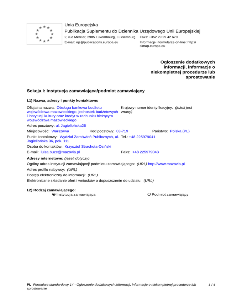 Unia Europejska Publikacja Suplementu do Dziennika Urzędowego Unii Europejskiej 2, rue Mercier, 2985 Luxembourg, Luksemburg Faks: +352 29 29 42 670 E-mail: [email protected] Informacje i formularze on-line: http:// simap.europa.eu Ogłoszenie dodatkowych informacji, informacje o niekompletnej procedurze lub sprostowanie Sekcja I: Instytucja zamawiająca/podmiot zamawiający I.1) Nazwa, adresy i punkty kontaktowe: Oficjalna nazwa: Obsługa bankowa budżetu Krajowy numer identyfikacyjny: (jeżeli jest województwa mazowieckiego, jednostek budżetowych znany) _____ i instytucji kultury oraz kredyt w rachunku bieżącym województwa mazowieckiego Adres pocztowy: ul. Jagiellońska26 Miejscowość: Warszawa Kod pocztowy: 03-719 Państwo: Polska (PL) Punkt kontaktowy: Wydział Zamówień Publicznych, ul. Tel.: +48 225979041 Jagiellońska 36, pok. 111 Osoba do kontaktów: Krzysztof Strachota-Osiński E-mail: [email protected] Faks: +48 225979043 Adresy internetowe: (jeżeli dotyczy) Ogólny adres instytucji zamawiającej/ podmiotu zamawiającego: (URL) http://www.mazovia.pl Adres profilu nabywcy: (URL) _____ Dostęp elektroniczny do informacji: (URL) _____ Elektroniczne składanie ofert i wniosków o dopuszczenie do udziału: (URL) _____ I.2) Rodzaj zamawiającego: Instytucja zamawiająca Podmiot zamawiający PL Formularz standardowy 14 - Ogłoszenie dodatkowych informacji, informacje o niekompletnej procedurze lub sprostowanie 1/4 Sekcja II: Przedmiot zamówienia II.1.1) Nazwa nadana zamówieniu: Obsługa bankowa budżetu województwa mazowieckiego, jednostek budżetowych i instytucji kultury oraz kredyt w rachunku bieżącym województwa mazowieckiego II.1.2) Krótki opis zamówienia lub zakupu: (podano w pierwotnym ogłoszeniu) Obsługa bankowa budżetu województwa mazowieckiego, jednostek budżetowych i instytucji kultury tj. obsługa i prowadzenie ok. 700 rachunków bieżących, w tym rachunków złotowych i walutowych - rachunki prowadzone w EUR i USD ok. 13 szt., pozostałe w PLN oraz kredyt w rachunku bieżącym województwa mazowieckiego do wysokości 300 mln zł II.1.3) Wspólny Słownik Zamówień (CPV) Główny przedmiot Słownik główny 66000000 Słownik uzupełniający (jeżeli dotyczy) PL Formularz standardowy 14 - Ogłoszenie dodatkowych informacji, informacje o niekompletnej procedurze lub sprostowanie 2/4 Sekcja IV: Procedura IV.1)Rodzaj procedury (podano w pierwotnym ogłoszeniu) Otwarta Ograniczona Ograniczona przyspieszona Negocjacyjna Negocjacyjna przyspieszona Dialog konkurencyjny Negocjacyjna z uprzednim ogłoszeniem Negocjacyjna bez uprzedniego ogłoszenia Negocjacyjna z publikacją ogłoszenia o zamówieniu Negocjacyjna bez publikacji ogłoszenia o zamówieniu Udzielenie zamówienia bez uprzedniej publikacji ogłoszenia o zamówieniu w Dzienniku Urzędowym Unii Europejskiej IV.2)Informacje administracyjne IV.2.1)Numer referencyjny: (podano w pierwotnym ogłoszeniu) BF-II-WR.ZP.U.272.92.2013.LB IV.2.2)Dane referencyjne ogłoszenia w przypadku ogłoszeń przesłanych drogą elektroniczną: Pierwotne ogłoszenie przesłane przez eNotices TED eSender Login: ENOTICES_buze Dane referencyjne ogłoszenia: 2013-124880 rok i numer dokumentu IV.2.3)Ogłoszenie, którego dotyczy niniejsza publikacja: Numer ogłoszenia w Dz.U.: 2013/S 181-312484 z dnia: 18/09/2013 (dd/mm/rrrr) IV.2.4)Data wysłania pierwotnego ogłoszenia: 16/09/2013 (dd/mm/rrrr) PL Formularz standardowy 14 - Ogłoszenie dodatkowych informacji, informacje o niekompletnej procedurze lub sprostowanie 3/4 Sekcja VI: Informacje uzupełniające VI.1) Ogłoszenie dotyczy: Procedury niepełnej Sprostowania Informacji dodatkowych VI.2) Informacje na temat niepełnej procedury udzielenia zamówienia: Postępowanie o udzielenie zamówienia zostało przerwane Postępowanie o udzielenie zamówienia uznano za nieskuteczne Zamówienia nie udzielono Zamówienie może być przedmiotem ponownej publikacji VI.3) Informacje do poprawienia lub dodania : VI.3.1) Zmiana oryginalnej informacji podanej przez instytucję zamawiającą Publikacja w witrynie TED niezgodna z oryginalną informacją, przekazaną przez instytucję zamawiającą Oba przypadki VI.3.2) W ogłoszeniu pierwotnym W odpowiedniej dokumentacji przetargowej (więcej informacji w odpowiedniej dokumentacji przetargowej) W obu przypadkach (więcej informacji w odpowiedniej dokumentacji przetargowej) VI.3.3) Tekst, który należy poprawić w pierwotnym ogłoszeniu Miejsce, w którym znajduje się Zamiast: zmieniany tekst: Minimalny okres, w którym oferent IV.3.7) będzie związany ofertą w dniach: 60 (od ustalonej daty składania ofert) Powinno być: Minimalny okres, w którym oferent będzie związany ofertą w dniach: 90 (od ustalonej daty składania ofert) VI.3.4) Daty, które należy poprawić w pierwotnym ogłoszeniu Miejsce, w którym znajdują się Zamiast: zmieniane daty: 28/10/2013 Godzina: 10:00 IV.3.4) (dd/mm/rrrr) Powinno być: 08/11/2013 Godzina: 10:00 (dd/mm/rrrr) Miejsce, w którym znajdują się zmieniane daty: IV.3.8) Powinno być: 08/11/2013 Godzina: 14:30 (dd/mm/rrrr) Zamiast: 28/10/2013 Godzina: 14:30 (dd/mm/rrrr) VI.3.5) Adresy i punkty kontaktowe, które należy poprawić VI.3.6) Tekst, który należy dodać do pierwotnego ogłoszenia Miejsce, w którym należy dodać tekst: Tekst do dodania: VI.4) Inne dodatkowe informacje: _____ VI.5) Data wysłania niniejszego ogłoszenia: 16/10/2013 (dd/mm/rrrr) - ID:2013-140592 PL Formularz standardowy 14 - Ogłoszenie dodatkowych informacji, informacje o niekompletnej procedurze lub sprostowanie 4/4