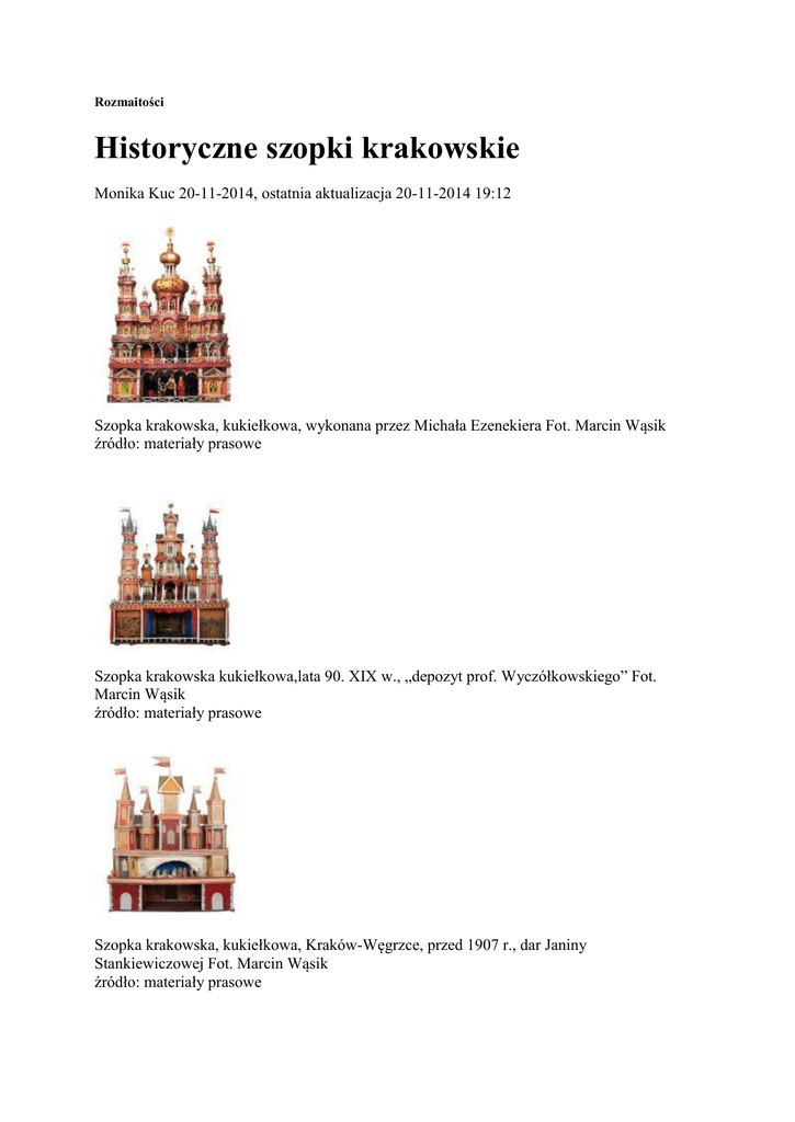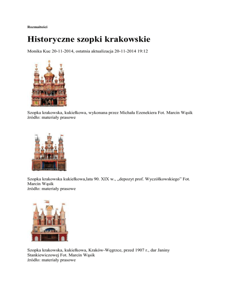 Rozmaitości Historyczne szopki krakowskie Monika Kuc 20-11-2014, ostatnia aktualizacja 20-11-2014 19:12 Szopka krakowska, kukiełkowa, wykonana przez Michała Ezenekiera Fot. Marcin Wąsik źródło: materiały prasowe Szopka krakowska kukiełkowa,lata 90. XIX w., „depozyt prof. Wyczółkowskiego” Fot. Marcin Wąsik źródło: materiały prasowe Szopka krakowska, kukiełkowa, Kraków-Węgrzce, przed 1907 r., dar Janiny Stankiewiczowej Fot. Marcin Wąsik źródło: materiały prasowe „Na początku była szopka" to tytuł wystawy, którą prezentuje Muzeum Etnograficzne w Krakowie - pisze Monika Kuc. Można na niej zobaczyć osiem najstarszych szopek krakowskich z przełomu XIX i XX wieku, które dały początek wielkiej tradycji, kontynuowanej w niezliczonych przetworzeniach do dziś. Jak wiadomo szopki krakowskie to artystyczny i kulturowy fenomen, wyróżniający Kraków na tle Europy. Często to całe przenośne teatry o architekturze fantazyjnie nawiązującej do najbardziej znanych krakowskich budowli, np. kościoła Mariackiego, Kaplicy Zygmuntowskiej na Wawelu, czy Bramy Floriańskiej. Przedstawiają narodziny Jezusa, ale zawierają także wiele historycznych, patriotycznych i baśniowych wątków. Postacie biblijne i historyczne spotykają się w nich ze Smokiem Wawelskim, Lajkonikiem i bohaterami innych popularnych legend. Pierwszymi twórcami szopek byli krakowscy murarze, którzy zimą, podczas przymusowej przerwy w pracy, szukali dodatkowych źródeł zarobku. Budowali więc szopki i odgrywali bożonarodzeniowe przedstawienie. Najstarszym eksponatem na wystawie w Muzeum Etnograficznym jest szopka kukiełkowa z podkrakowskiego Bieżanowa z pierwszej połowy XIX wieku. Ma prostą konstrukcję, jej dach pokrywa strzecha, a po bokach stoją dwie wieże. Niewielka, łatwa do przenoszenia, używana była do odgrywania bożonarodzeniowych widowisk w trakcie kolędy po domach Natomiast najcenniejsza szopka to dzieło Michała Ezenekiera, mistrza murarskiego z Krowodrzy z lat 90. XIX wieku o pięciu bajecznie kolorowych i misternie wykonanych wieżach. Podczas konserwacji szopki okazało się, że była dla wzmocnienia oklejona od wewnątrz gazetą z datą 1898, co pomogło ustalić jej wiek (choć niewykluczone, że jest starsza). Uwagę zwraca także szopka kukiełkowa, przedstawiająca Pokłon Trzech Króli, wykonana przez nieznanego murarza być może pod kierunkiem Stanisława Wyspiańskiego. Do zbiorów muzealnych została przekazana w 1911 roku przez matkę chrzestną i opiekunkę Wyspiańskiego - Janinę Stankiewiczową (rodzina artysty używała jej jako zabawki dziecięce). Można też podziwiać szopkę, która zainspirowała Leona Wyczółkowskiego. Jej elementy widoczne są w tle obrazu malarza z 1898 roku, zatytułowanego „Stańczyk" (lub „Szopka") W osobnej sali zebrano trzydzieści lalek bez szopki.Ich twórcą był najprawdopodobniej Zdzisław Dudzik - rekwizytor w Teatrze Rozmaitości, twórca szopek, który przez lata wcielał się w krakowskiego Lajkonika. W 1904 roku ukazała się książka „Szopka krakowska", której autorami byli kryjący się pod pseudonimem kolekcjonerzy - bracia Stanisław i Tadeusz Eisteicherowie. To znakomite źródło wiadomości o tradycjach krakowskiej szopki. Monika Kuc Źródło: http://www.rp.pl/artykul/9132,1158973-Pierwsze-szopki-krakowskie.html