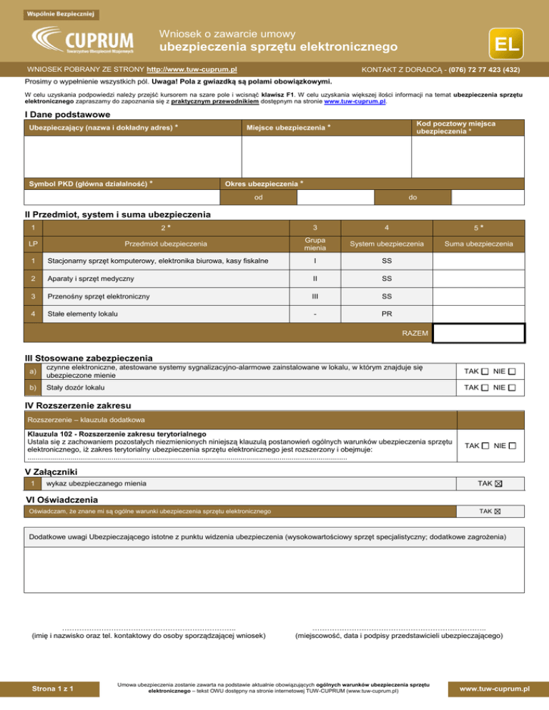 Wniosek o zawarcie umowy EL ubezpieczenia sprzętu elektronicznego KONTAKT Z DORADCĄ - (076) 72 77 423 (432) WNIOSEK POBRANY ZE STRONY http://www.tuw-cuprum.pl Prosimy o wypełnienie wszystkich pól. Uwaga! Pola z gwiazdką są polami obowiązkowymi. W celu uzyskania podpowiedzi należy przejść kursorem na szare pole i wcisnąć klawisz F1. W celu uzyskania większej ilości informacji na temat ubezpieczenia sprzętu elektronicznego zapraszamy do zapoznania się z praktycznym przewodnikiem dostępnym na stronie www.tuw-cuprum.pl. I Dane podstawowe Ubezpieczający (nazwa i dokładny adres) * Symbol PKD (główna działalność) * Kod pocztowy miejsca ubezpieczenia * Miejsce ubezpieczenia * Okres ubezpieczenia * od do II Przedmiot, system i suma ubezpieczenia 2* 3 4 5* Przedmiot ubezpieczenia Grupa mienia System ubezpieczenia Suma ubezpieczenia 1 LP 1 Stacjonarny sprzęt komputerowy, elektronika biurowa, kasy fiskalne I SS 2 Aparaty i sprzęt medyczny II SS 3 Przenośny sprzęt elektroniczny III SS 4 Stałe elementy lokalu - PR RAZEM III Stosowane zabezpieczenia a) czynne elektroniczne, atestowane systemy sygnalizacyjno-alarmowe zainstalowane w lokalu, w którym znajduje się ubezpieczone mienie TAK NIE b) Stały dozór lokalu TAK NIE TAK NIE IV Rozszerzenie zakresu Rozszerzenie – klauzula dodatkowa Klauzula 102 - Rozszerzenie zakresu terytorialnego Ustala się z zachowaniem pozostałych niezmienionych niniejszą klauzulą postanowień ogólnych warunków ubezpieczenia sprzętu elektronicznego, iż zakres terytorialny ubezpieczenia sprzętu elektronicznego jest rozszerzony i obejmuje: ............................................................................................................................................................ V Załączniki 1 wykaz ubezpieczanego mienia TAK VI Oświadczenia Oświadczam, że znane mi są ogólne warunki ubezpieczenia sprzętu elektronicznego TAK Dodatkowe uwagi Ubezpieczającego istotne z punktu widzenia ubezpieczenia (wysokowartościowy sprzęt specjalistyczny; dodatkowe zagrożenia) …………………………………………………………….. (imię i nazwisko oraz tel. kontaktowy do osoby sporządzającej wniosek) Strona 1 z 1 …………………………………………………………….. (miejscowość, data i podpisy przedstawicieli ubezpieczającego) Umowa ubezpieczenia zostanie zawarta na podstawie aktualnie obowiązujących ogólnych warunków ubezpieczenia sprzętu elektronicznego – tekst OWU dostępny na stronie internetowej TUW-CUPRUM (www.tuw-cuprum.pl) www.tuw-cuprum.pl